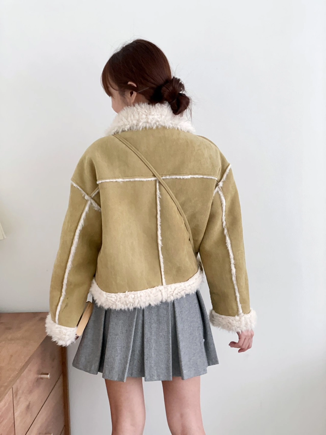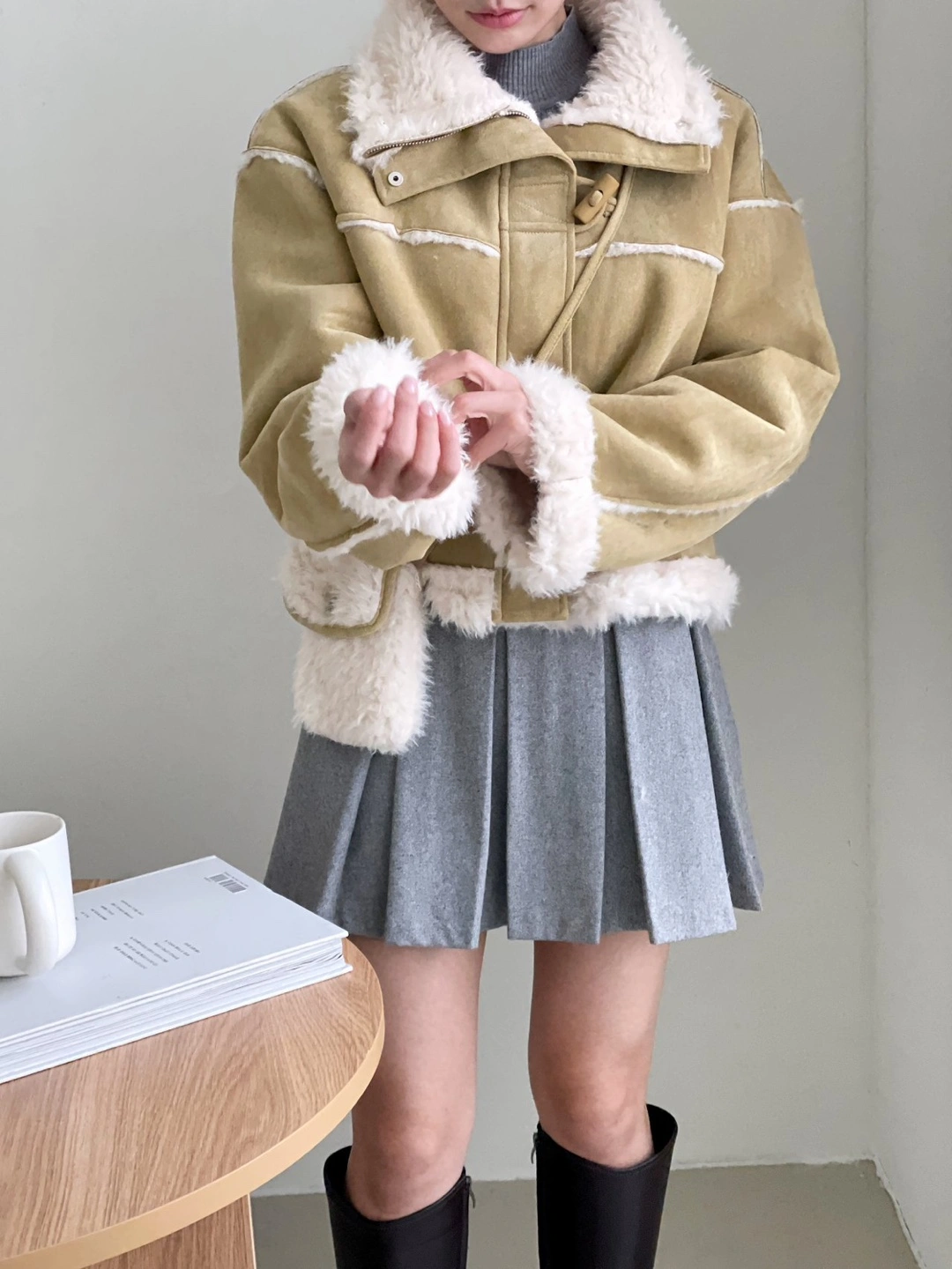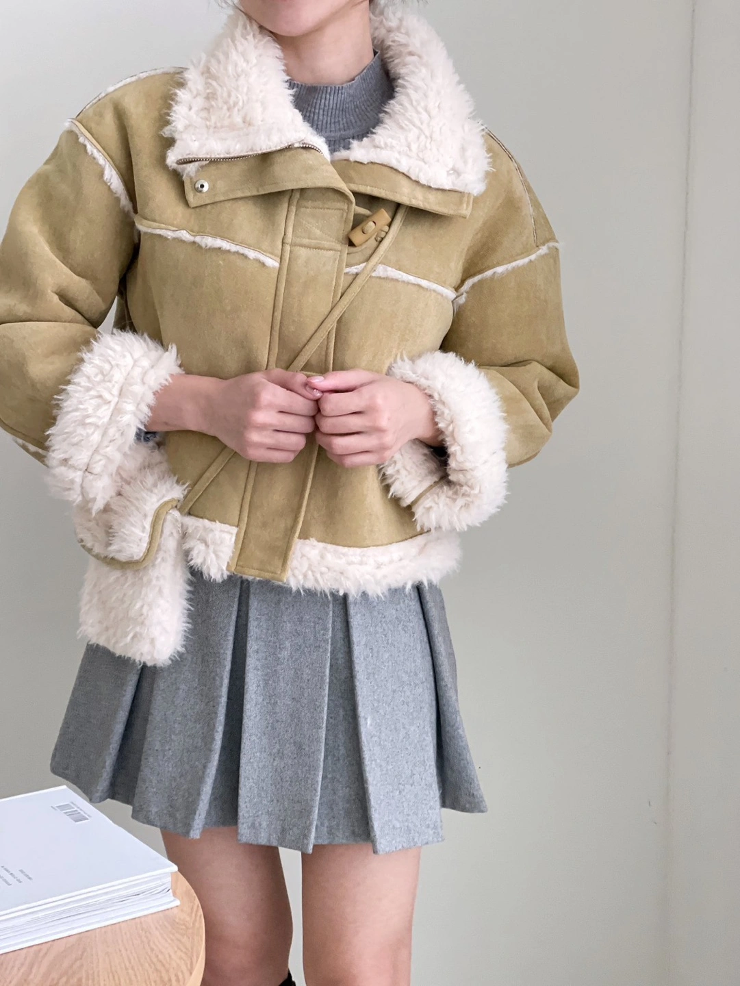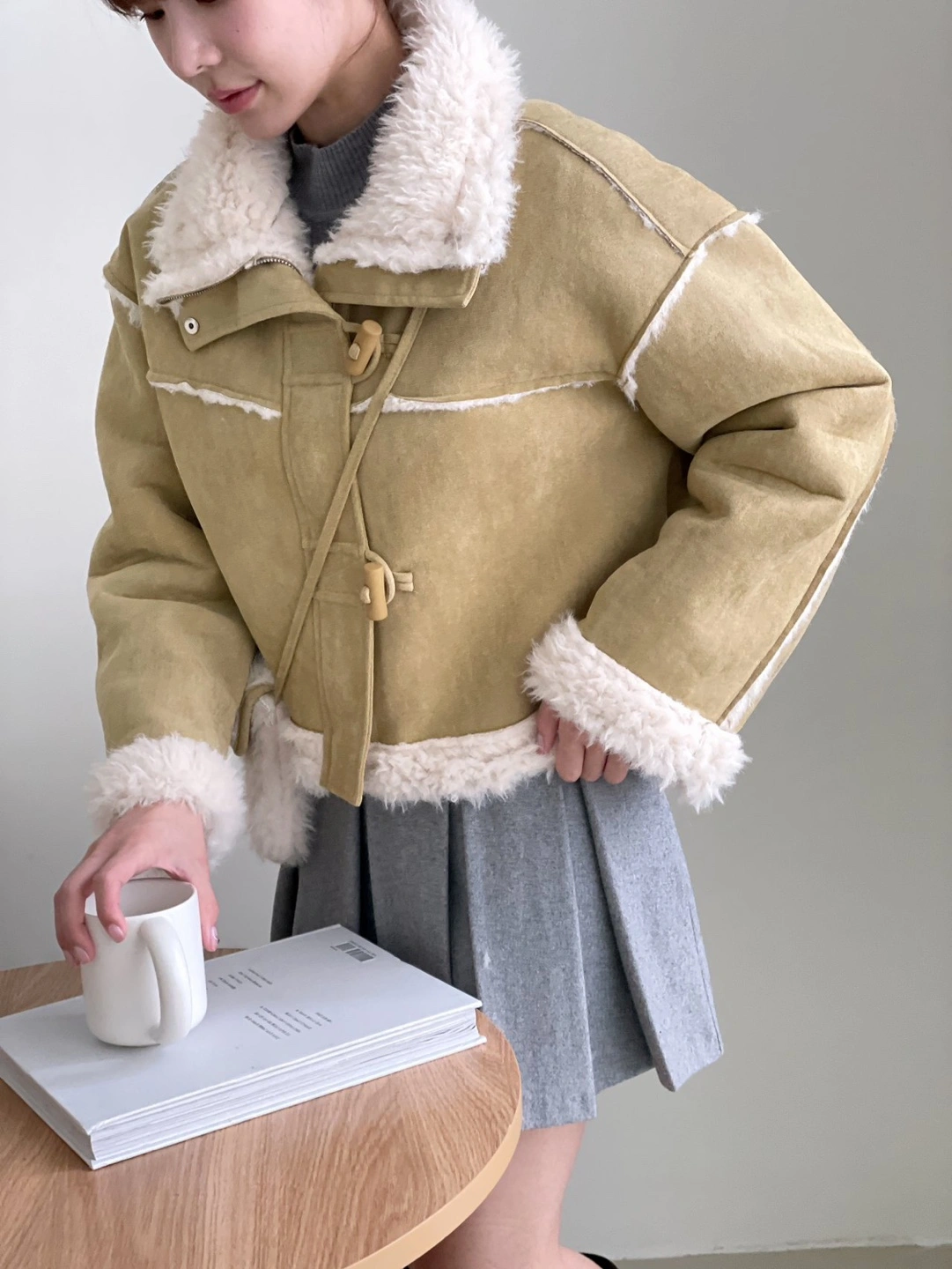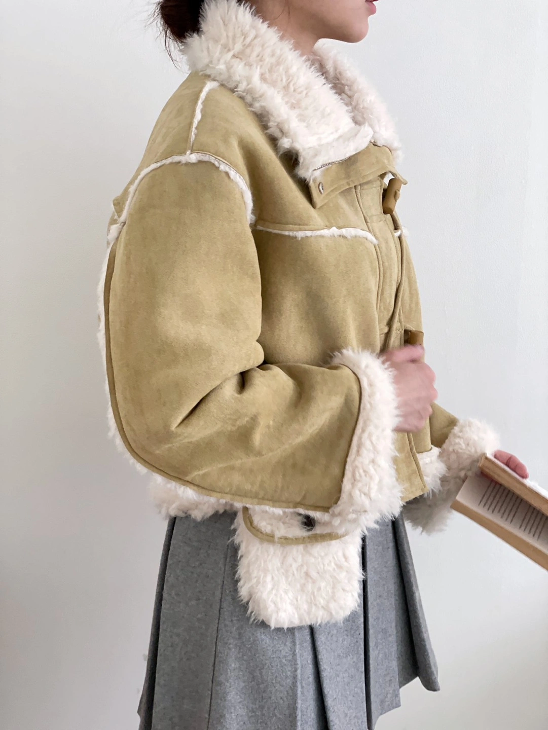 Cropped mustard yellow suede jacket. Features a sherpa fleece lining and toggle closure.
