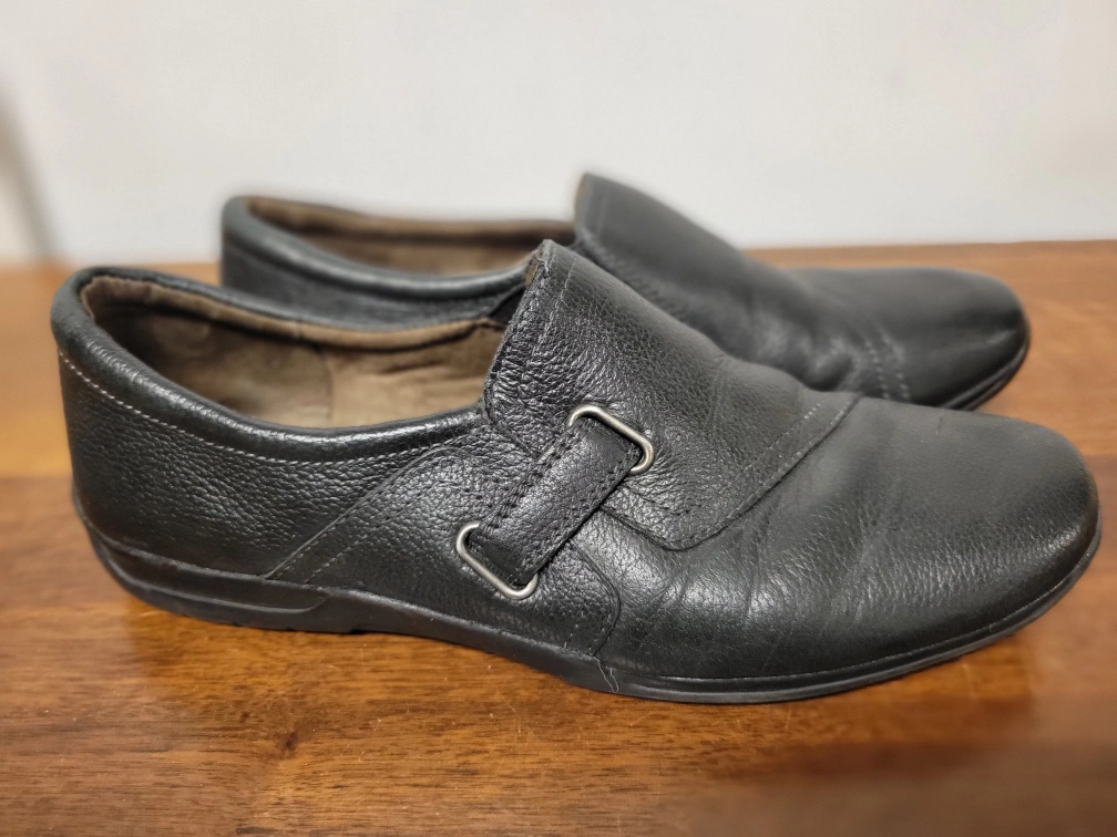 302Pair of women's black leather slip-on shoes. Size 7.5 US. Leather upper.