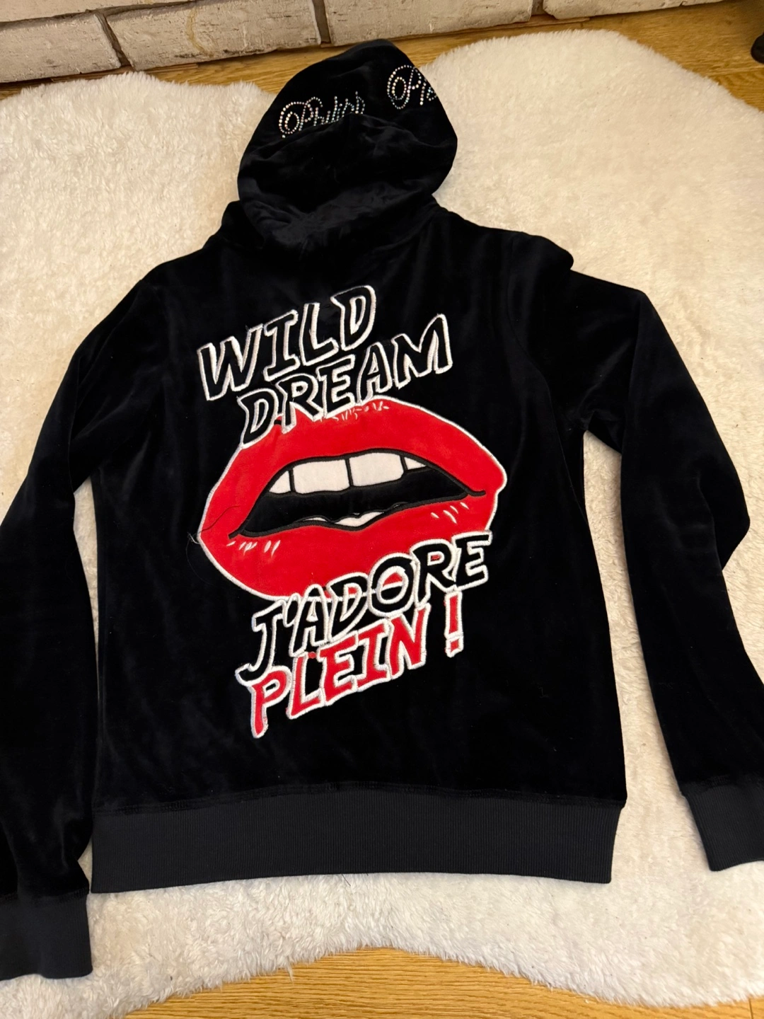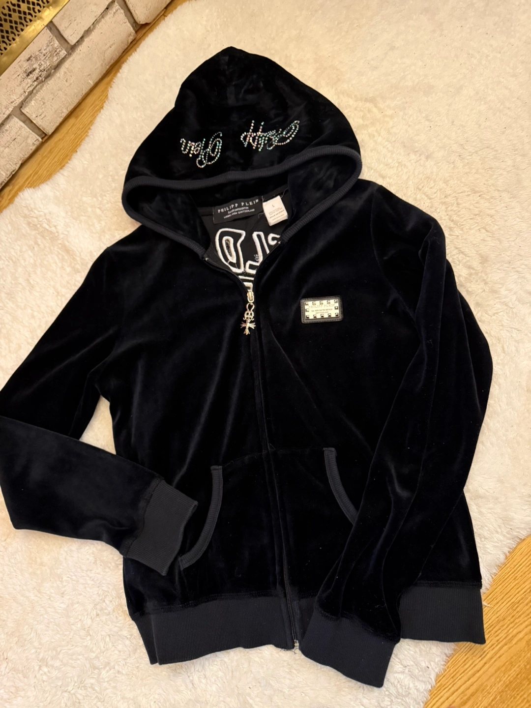 Women Black 2 piece velour tracksuit. Includes matching pants and zip-up hoodie. Features rhinestone detailing and signature Philipp Plein branding. Very unique and stylish. Made in Italy. Brand new never worn. No tags. Got it as a gift but did not fit. Fits small - medium. Asking $50 for the set.