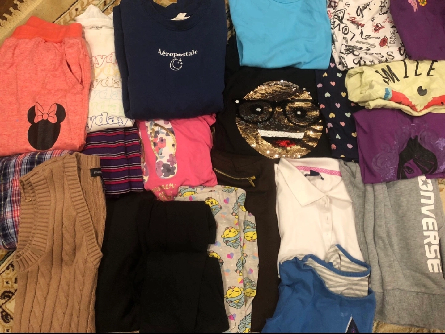 A bundle of more then 20 pieces of girls' clothing, sizes ranging from medium to small 10-12. Includes t-shirts, sweatshirts, sweatpants, and more!