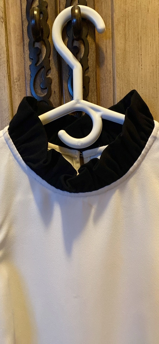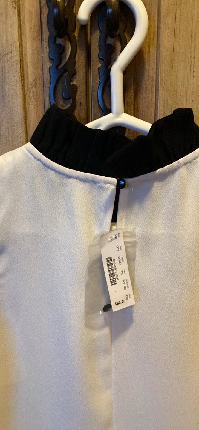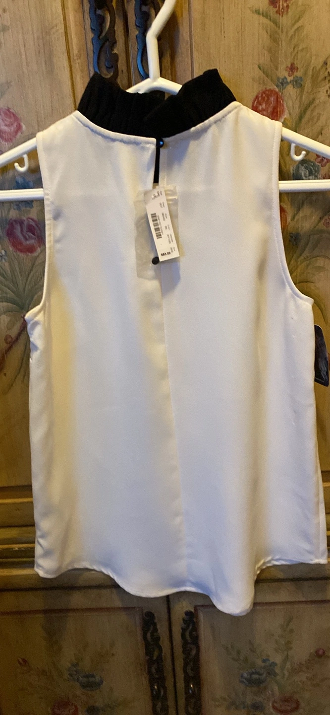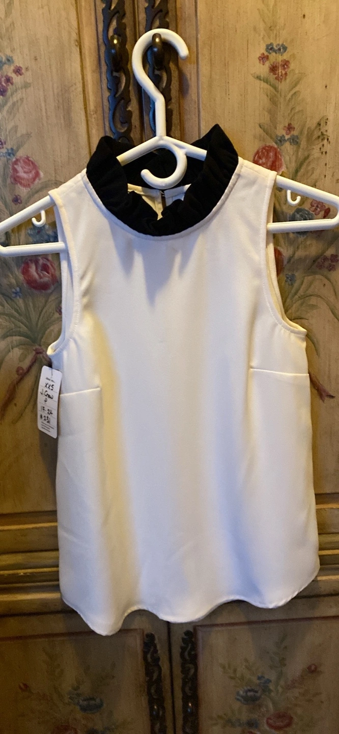 Cream sleeveless blouse. Features a black Peter Pan collar. Size XXS. Made in the Philippines. New with tag.