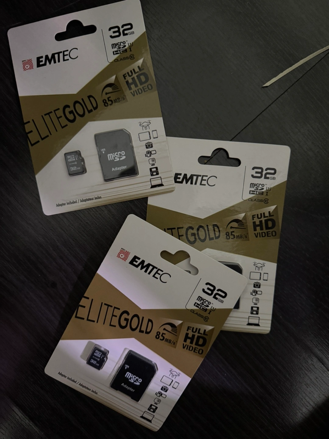 Three brand new, sealed 32GB EMTEC Elite Gold microSD cards. Class 10, Full HD video, read speeds up to 85 MB/s. Adapter included.