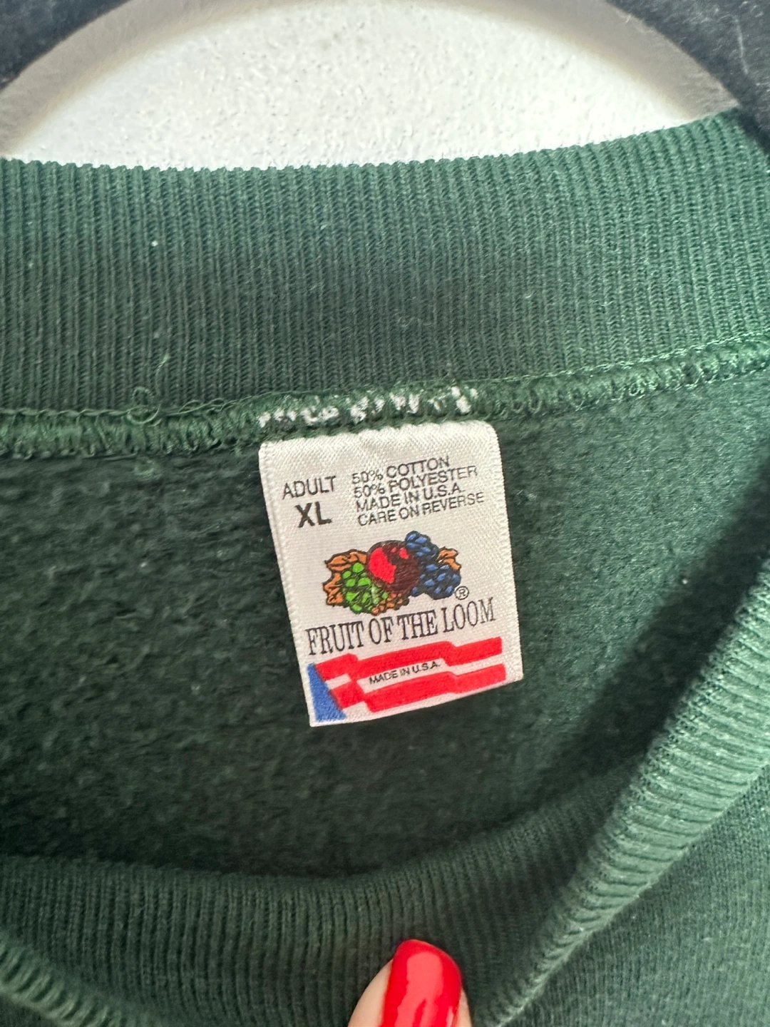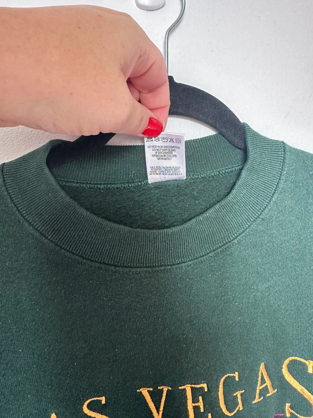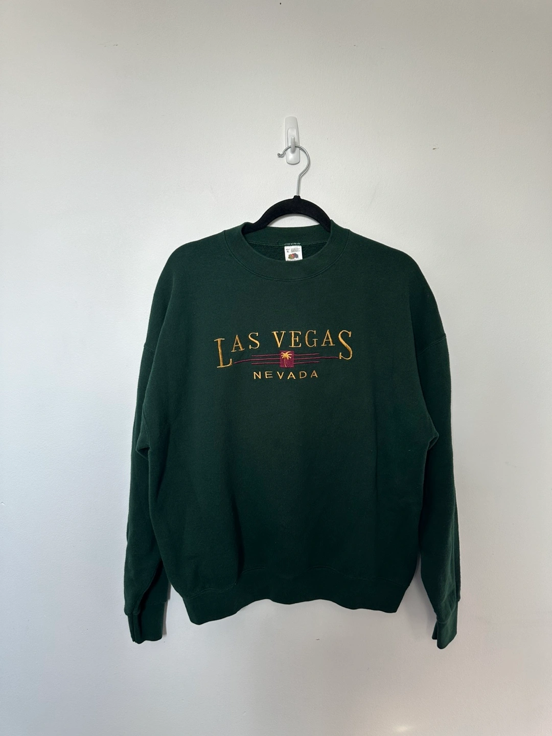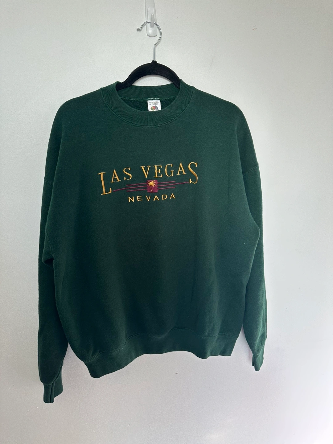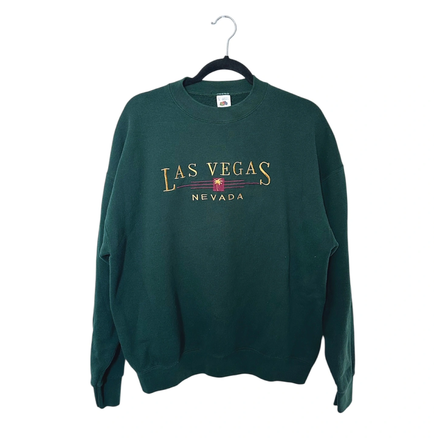 Dark green crewneck sweatshirt. Features embroidered Las Vegas, Nevada graphic. Size XL. Made in the USA.