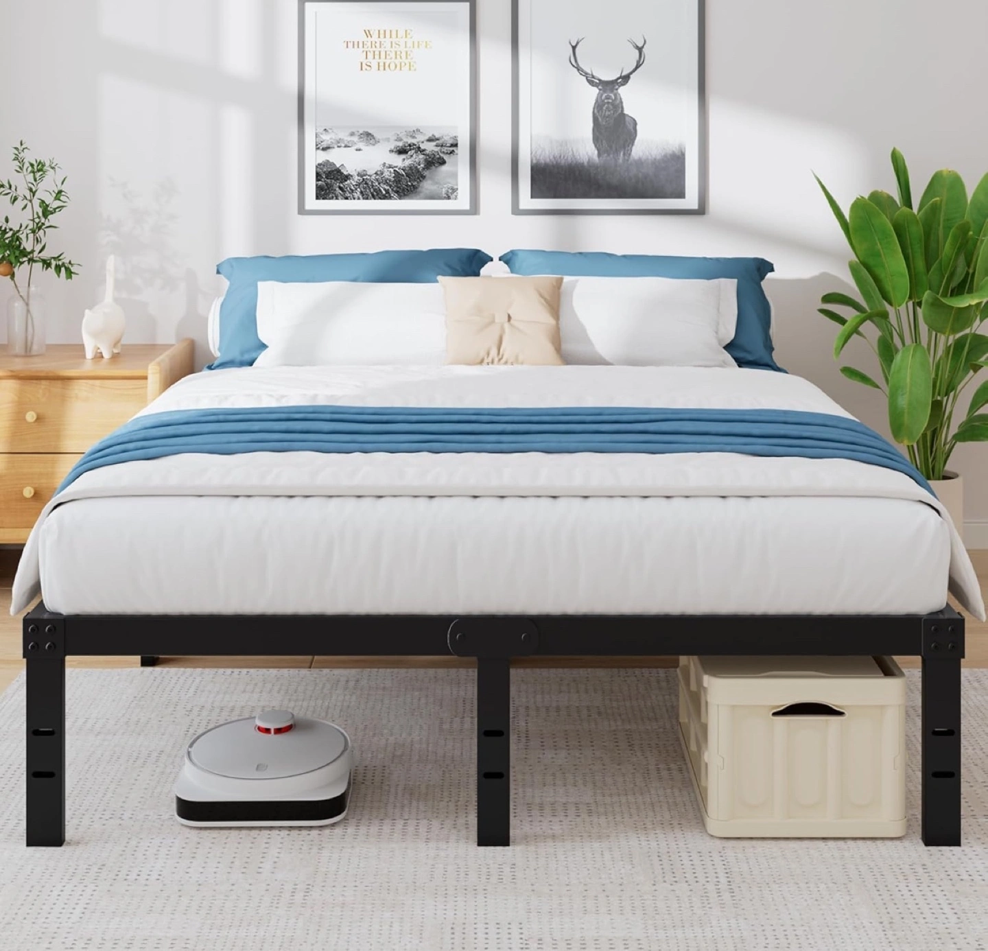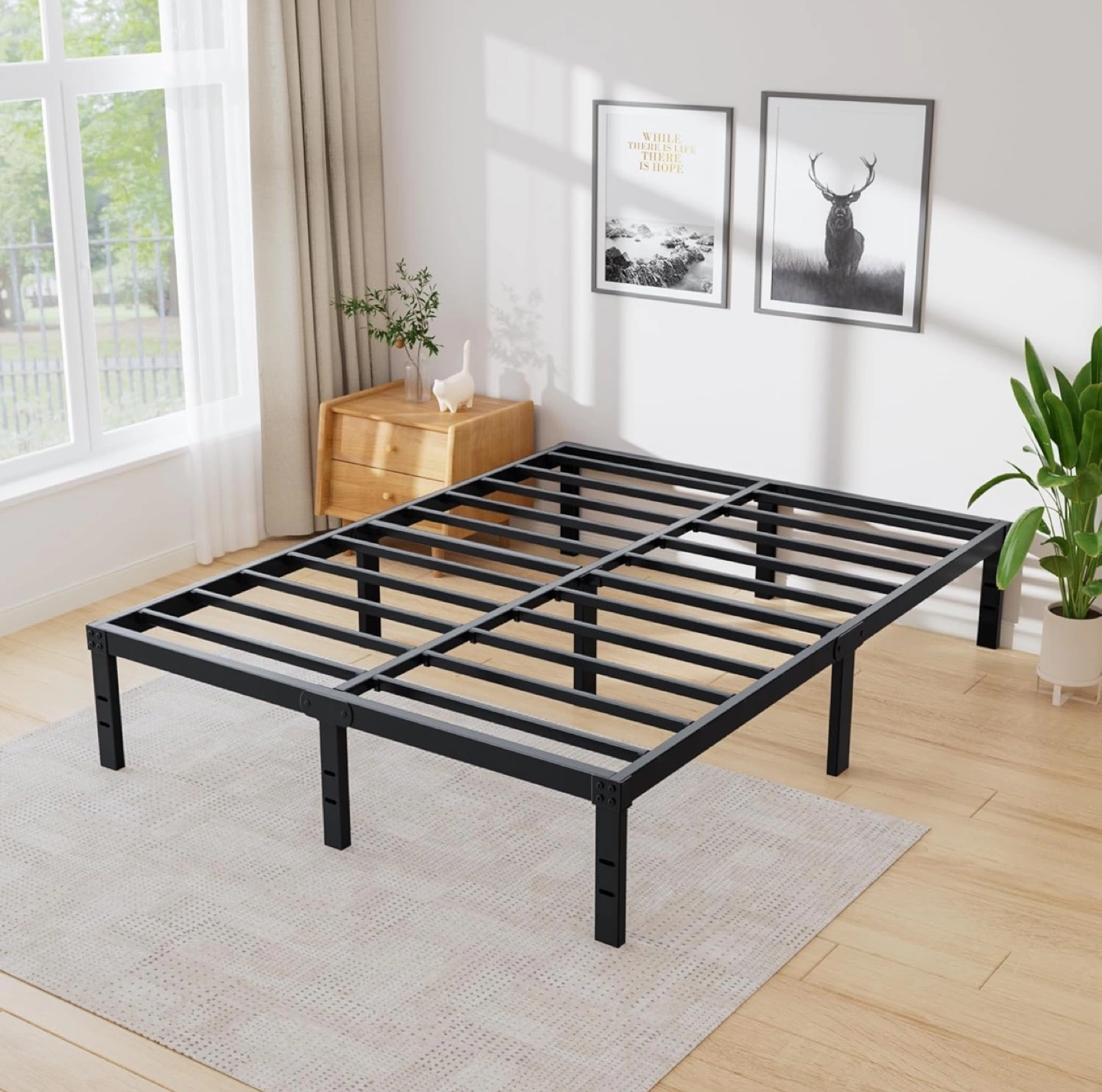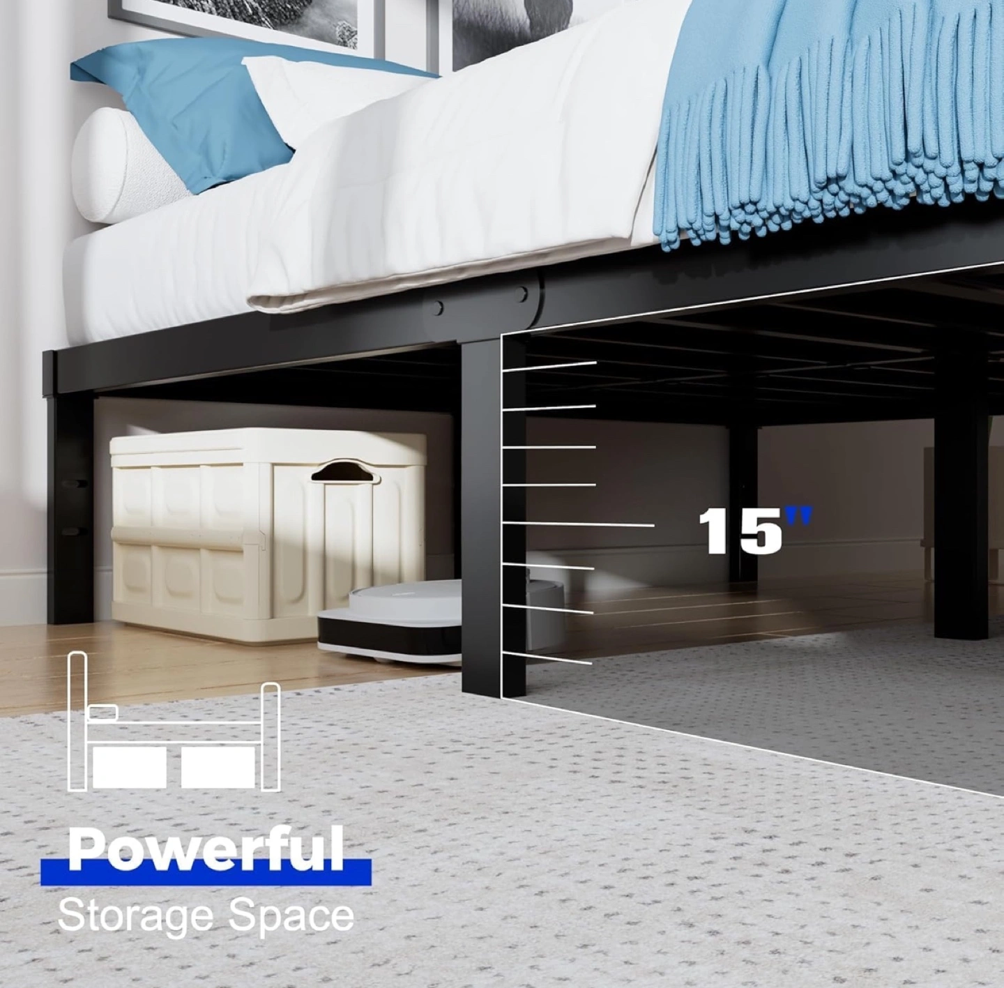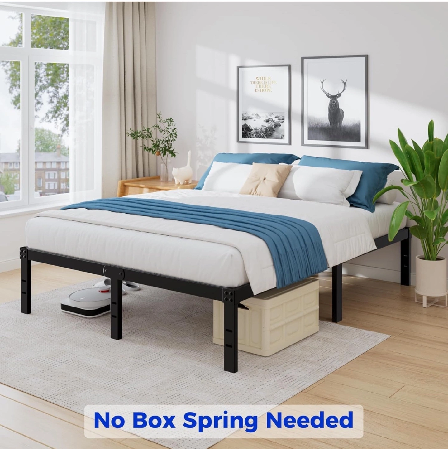 Black metal queen size bed frame, strong and durable. Headboard compatible. Easy assembly. No box spring needed. Provides 16 inches of under-bed storage space. Used a little just like new purchased from Amazon 3 months ago pickup available between March 1st to March 10th.
