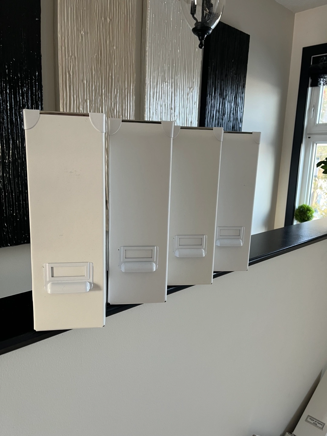 Four white magazine files with white metal corners and pulls. Great for organizing documents or magazines. Durable & EUC! Get ORGANIZED!ππ»