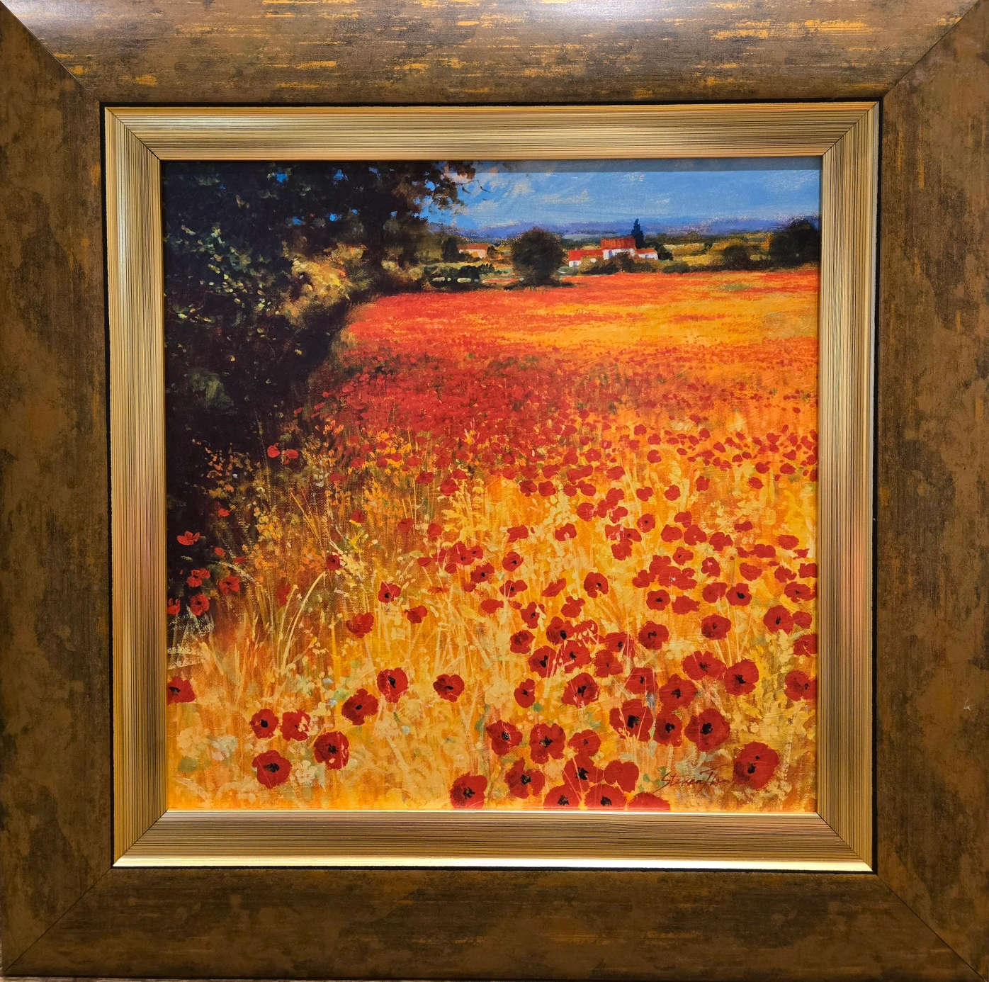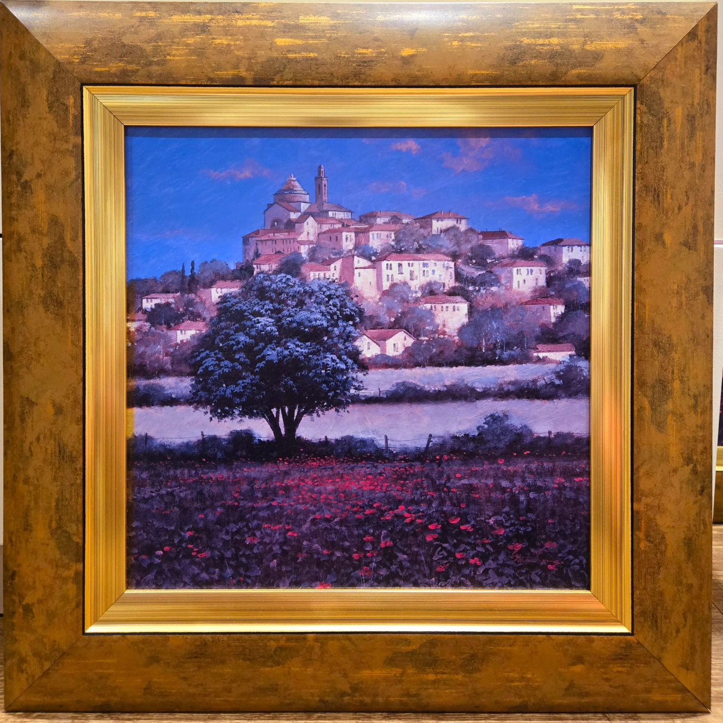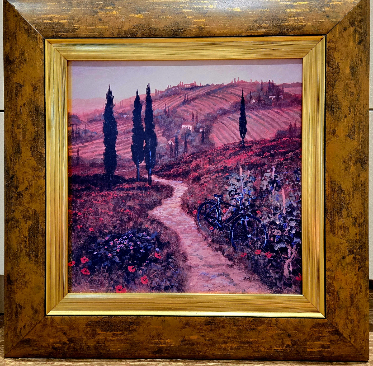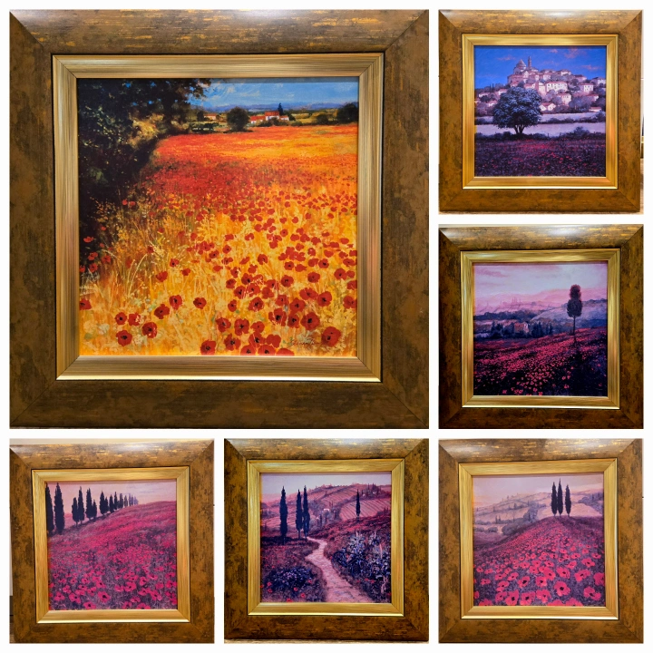 Six framed landscape prints $25 each. Picturesque Italian countryside scenes. Poppy fields, cypress trees, rolling hills, and charming villages. Gold-toned frames. Perfect for home décor.