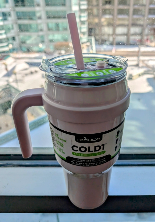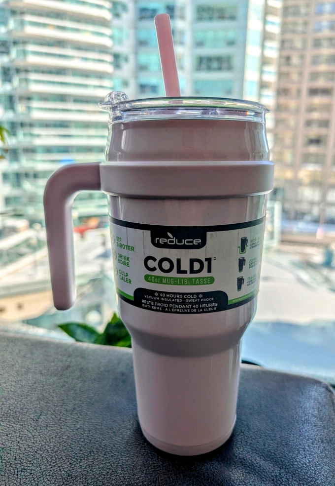 MOVING OUT SALE: Pink Reduce COLD1 40oz vacuum-insulated mug. Keeps drinks cold for hours. Includes lid and straw. Great for coffee, tea, or other beverages.