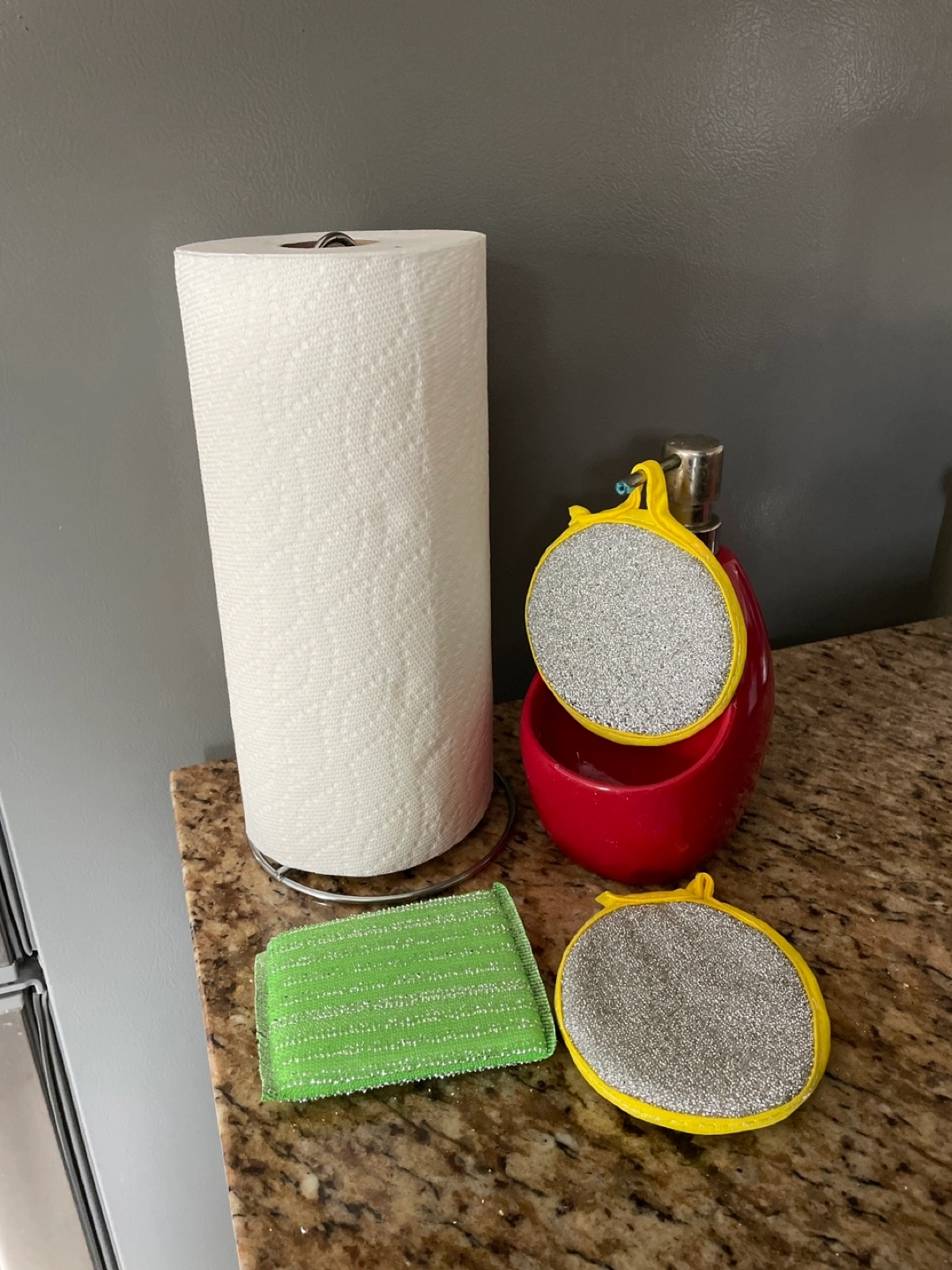 Red ceramic dish soap dispenser. Features a pump top. Includes 3 brand new dish scrubbers with yellow fabric edging. Silver scrubbing surface. Pre-owned, good condition plus the paper towel holder