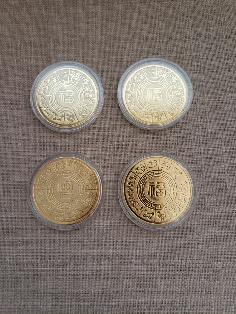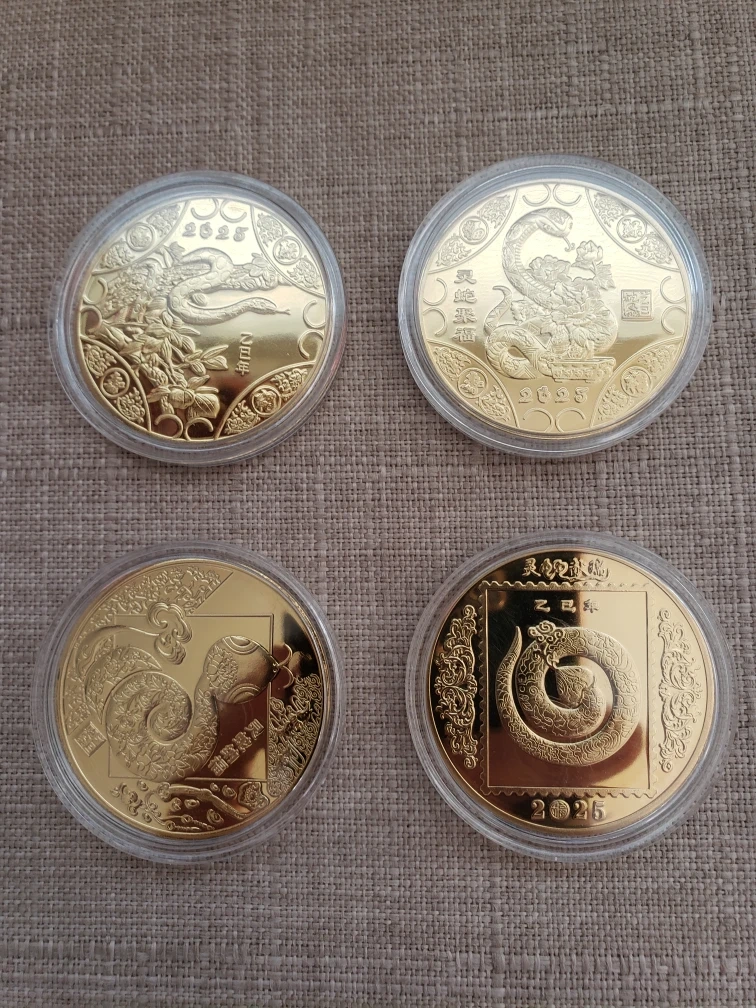 1000+Four gold-coloured commemorative coins. Featuring year of the snake. Collectible items. In protective plastic cases.