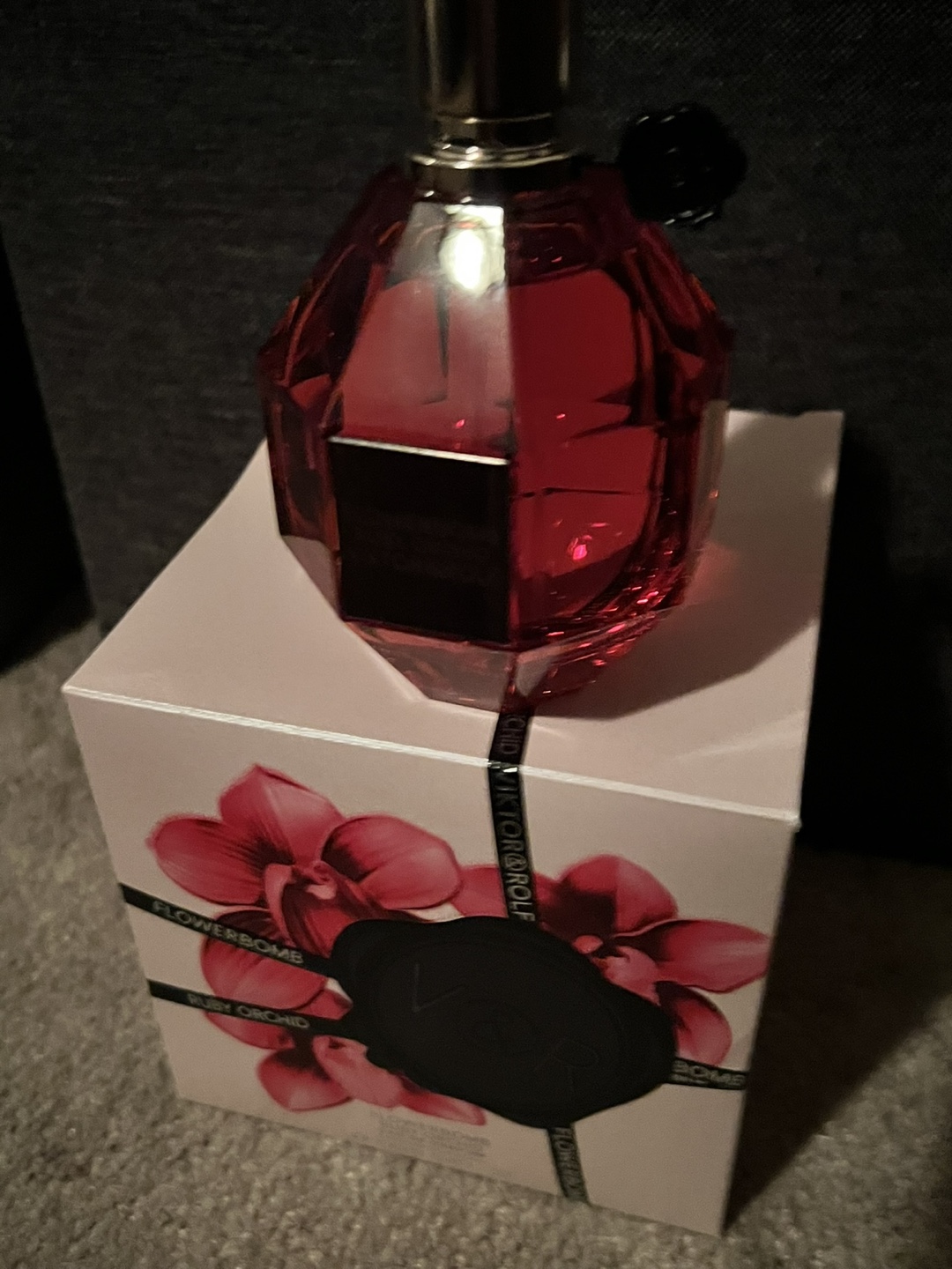 Used bottle of Viktor & Rolf Flowerbomb Ruby Orchid perfume. Beautiful ruby red bottle. 98% left