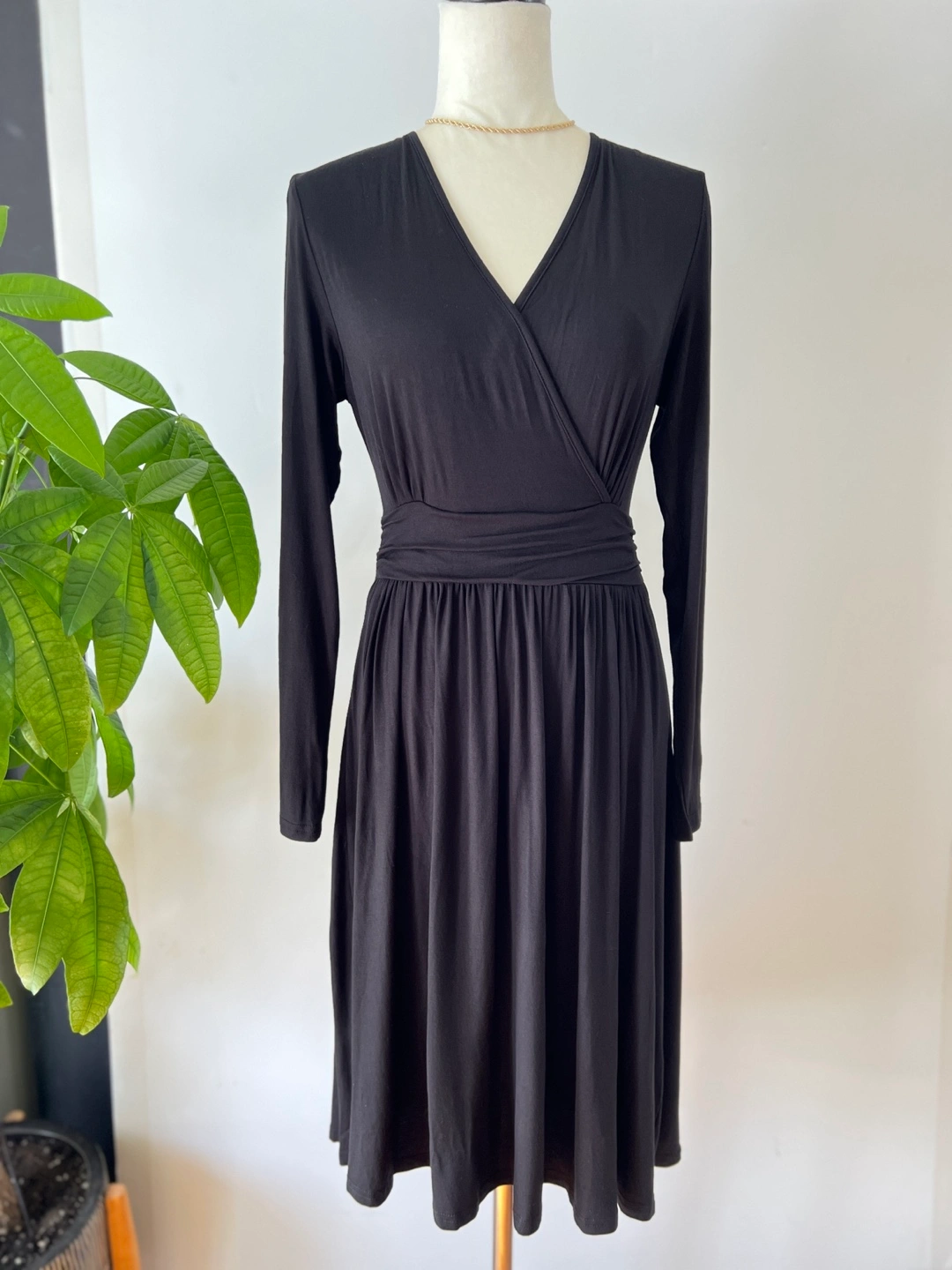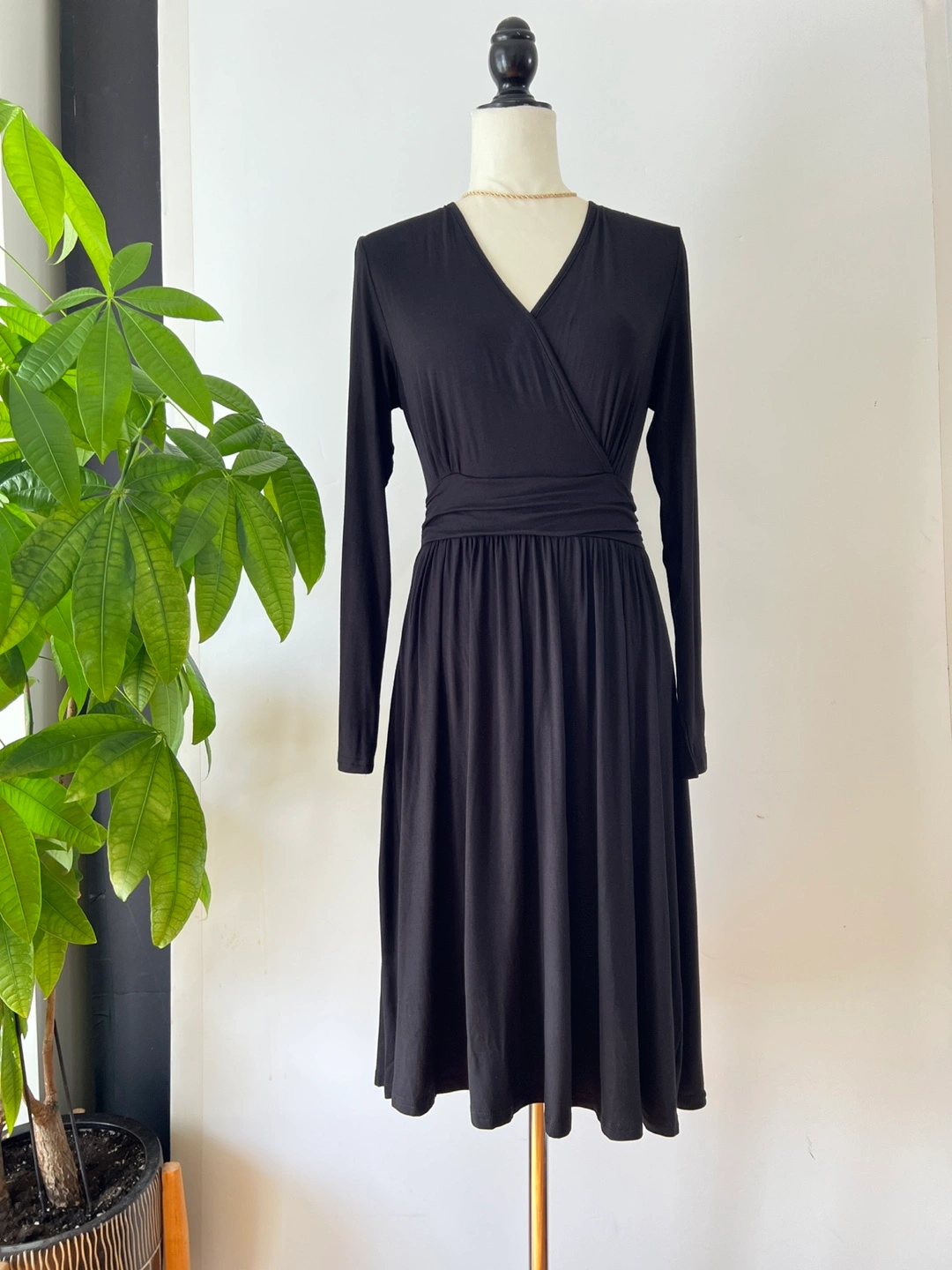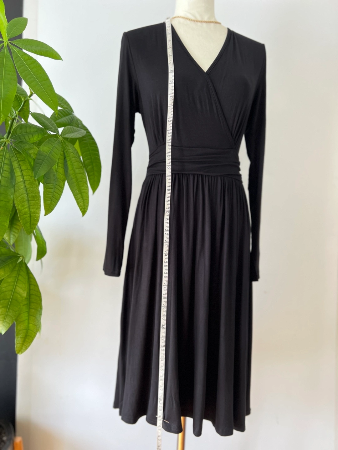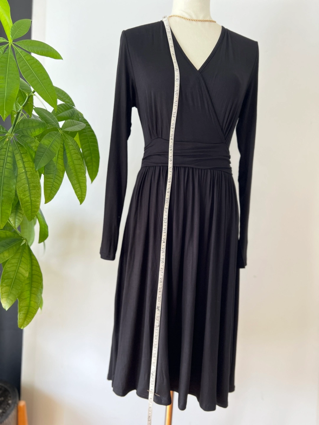 Classic style black dress. Features long sleeves, v-neck, and wrap-style bodice. Great for various occasions. Machine wash. 96% Rayon, 5% Spandex