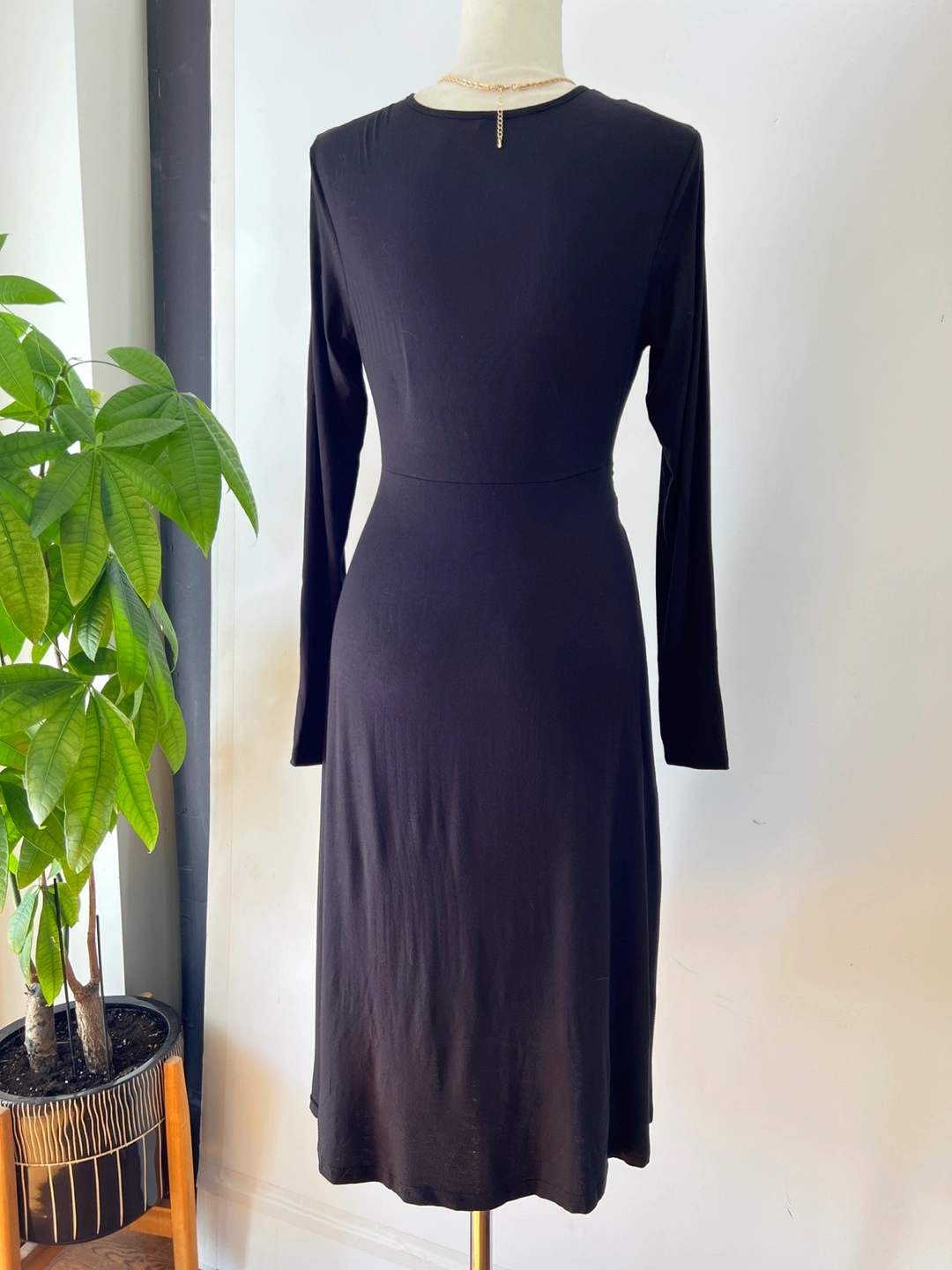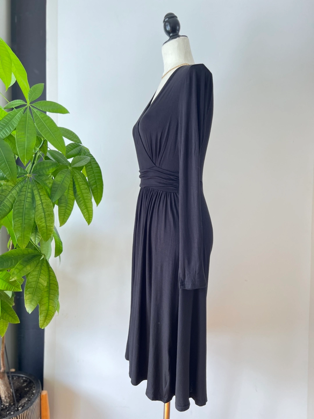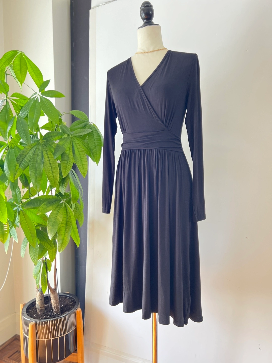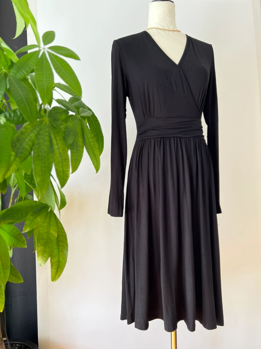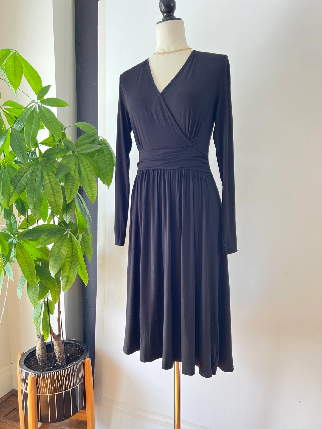 Classic style black dress. Features long sleeves, v-neck, and wrap-style bodice. Great for various occasions. Machine wash. 96% Rayon, 5% Spandex