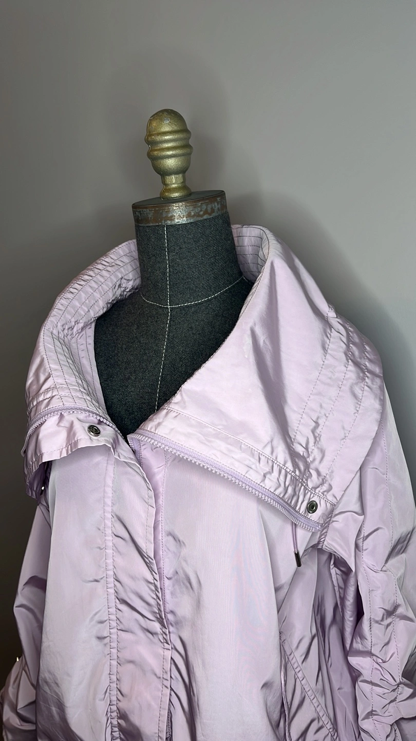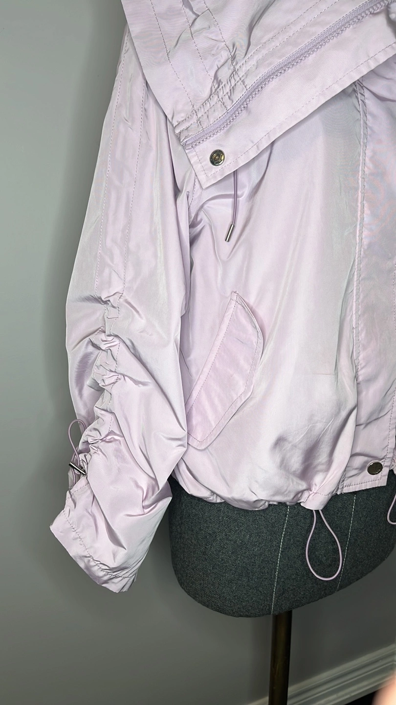 Lightweight jacket, lavender colour. Features a high collar, long sleeves with cinched cuffs, and a drawstring hem. Front zipper closure. Small front pocket. New without tags