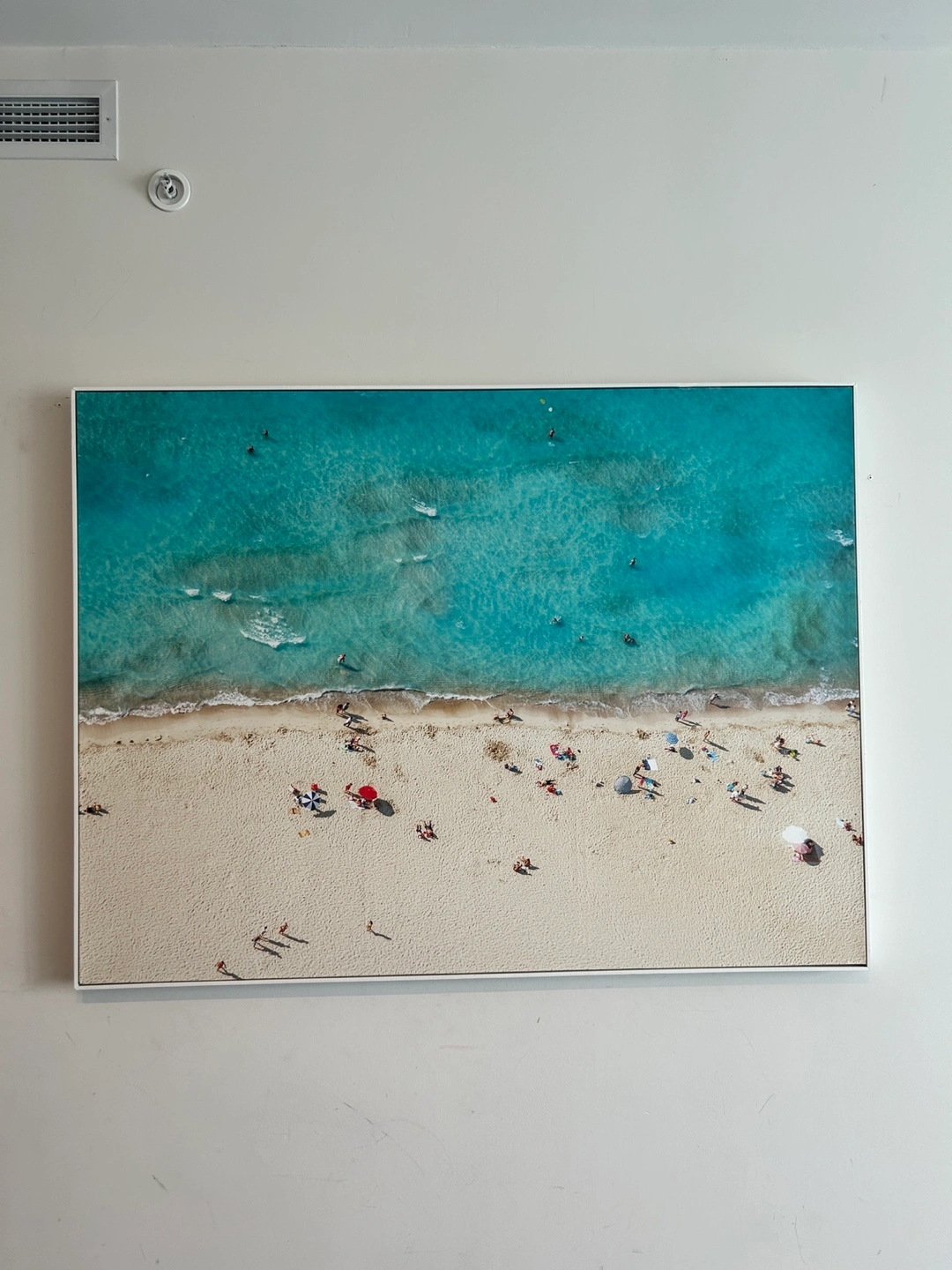 Framed beach photograph. Shows an aerial view of a beach with people, umbrellas, and turquoise water. White frame.