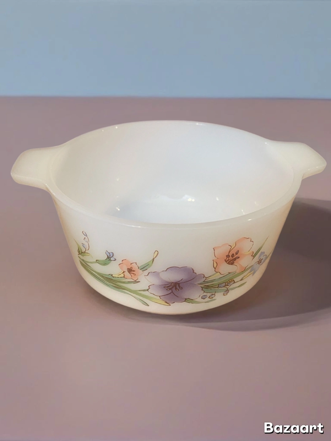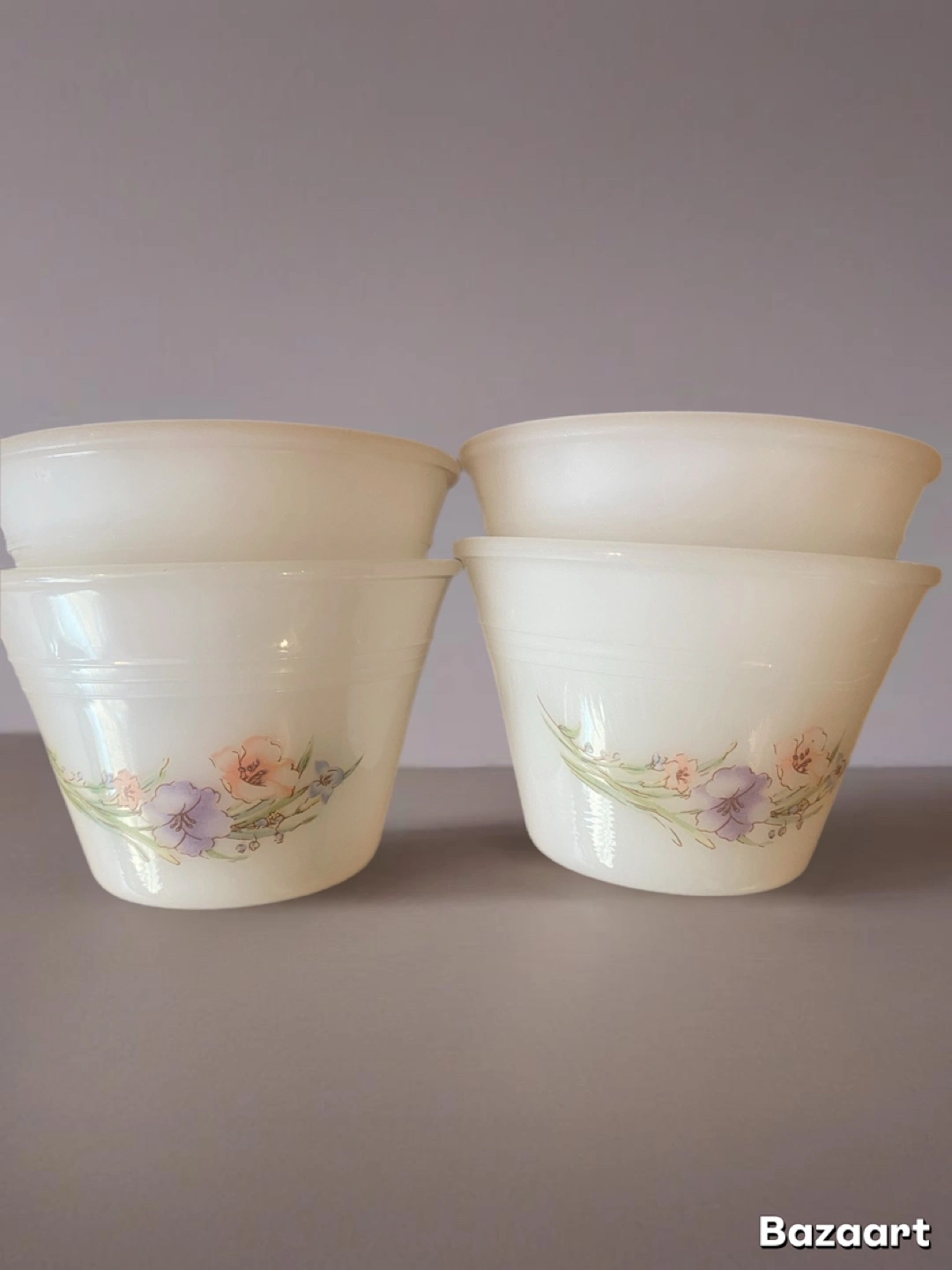 Set of four vintage milk glass custard bowls. Comes with a small casserole dish (6inches wide) (3inches deep). Sweet idea as a hostess or housewarming gift.