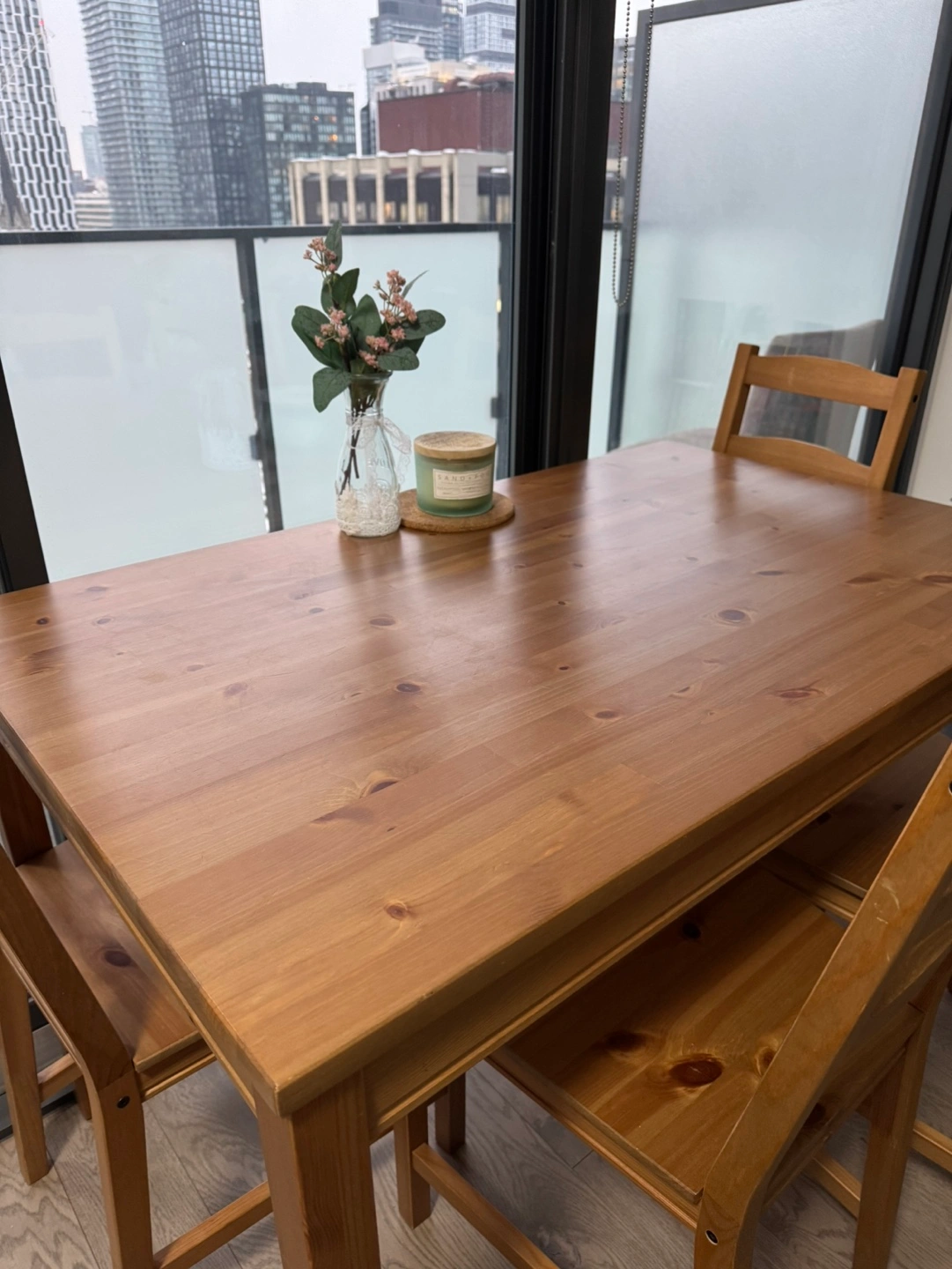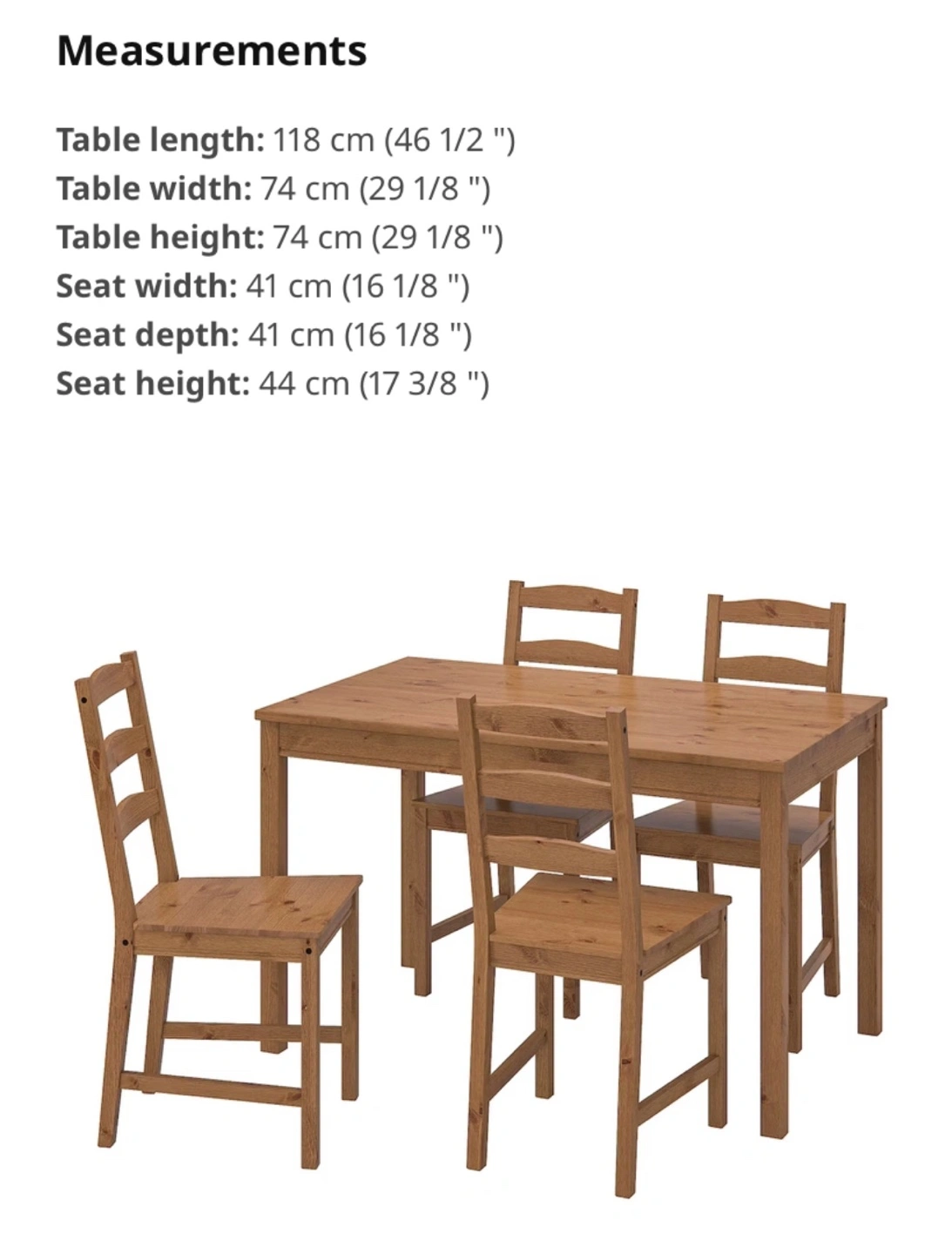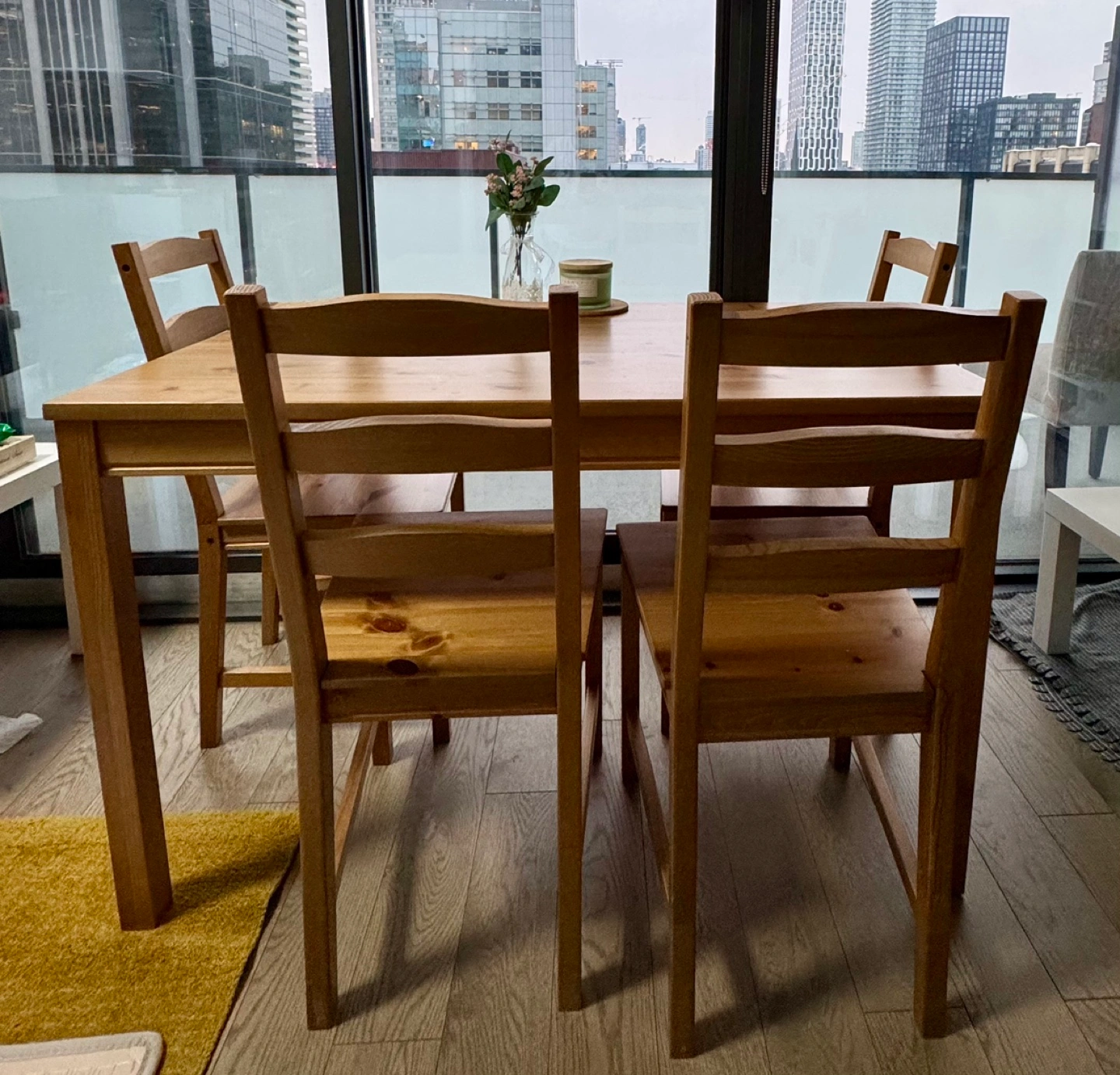 Solid pine wood table and four chairs. Great condition. Measurements included in photos.
