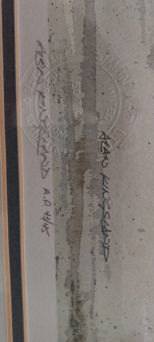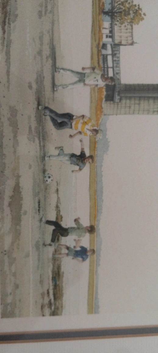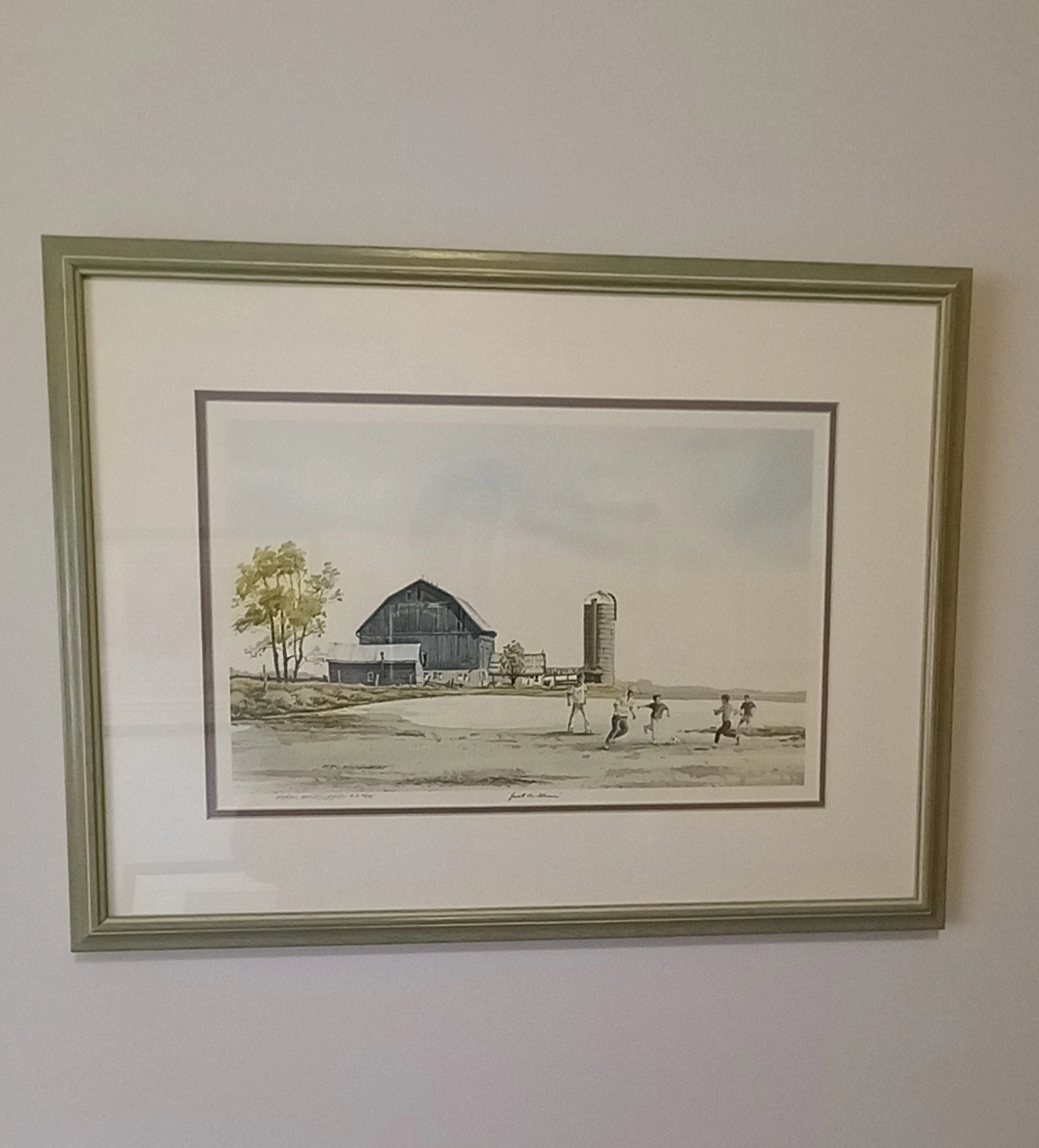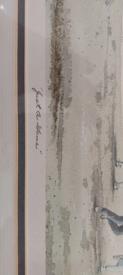 29REDUCED Alan Kingsland artist proof, 43 of 45, title "Just a Game". signed with seal embossed in lower left. Green toned frame, white and gray matted Frame size 24.75 by 18.75 inches. Image 16 by 10 inches. excellent condition, nice sports related image.