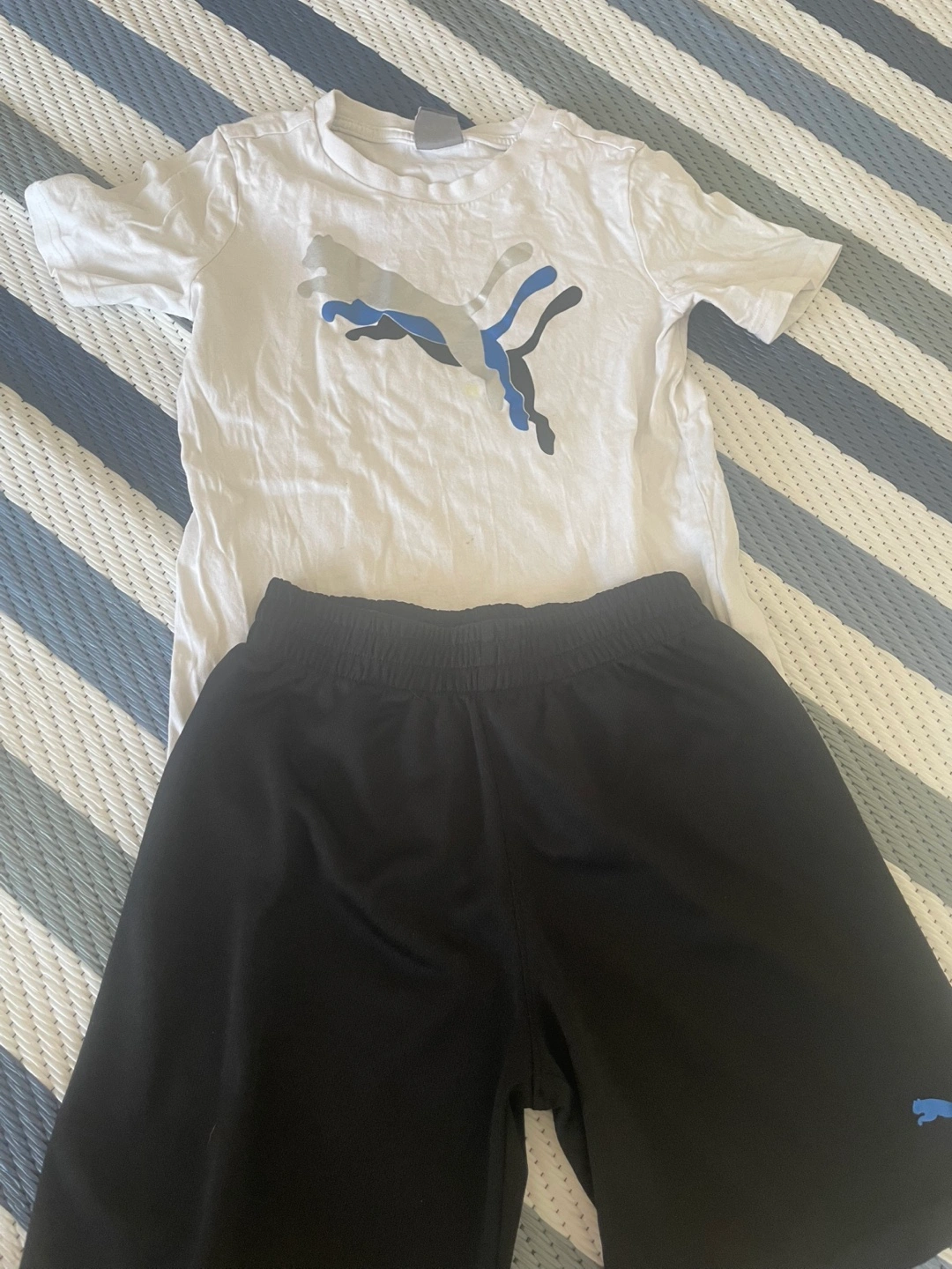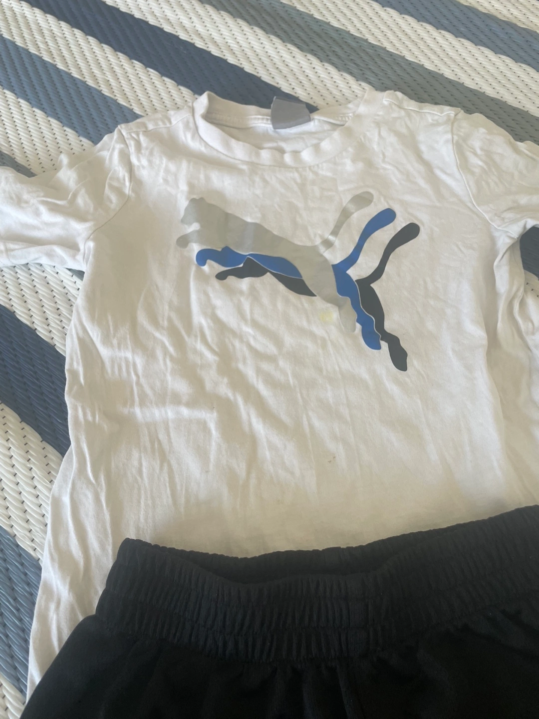 Youth Puma set. White shirt, black shorts. Great for casual wear or sports.