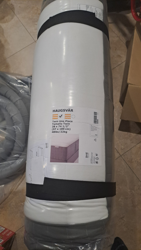 New IKEA HAUGSVÄR twin mattress. Rolled and in original packaging. Measures 38 x 74 1/2 inches or 97 x 189 cm. Weighs 48 lbs or 22 kg.