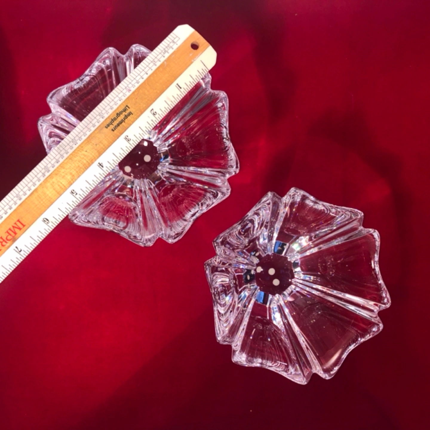 Stunning, signed Orrefors Orion 6-sided crystal bowls/candle holders. 5 1/2” diameter. These are one of the prettiest patterns from Swedish crystal maker Orrefors, as they catch the light beautifully! Vintage, in like-new condition-ready for your table, or to give as a gift. Lovely Scandinavian decor!