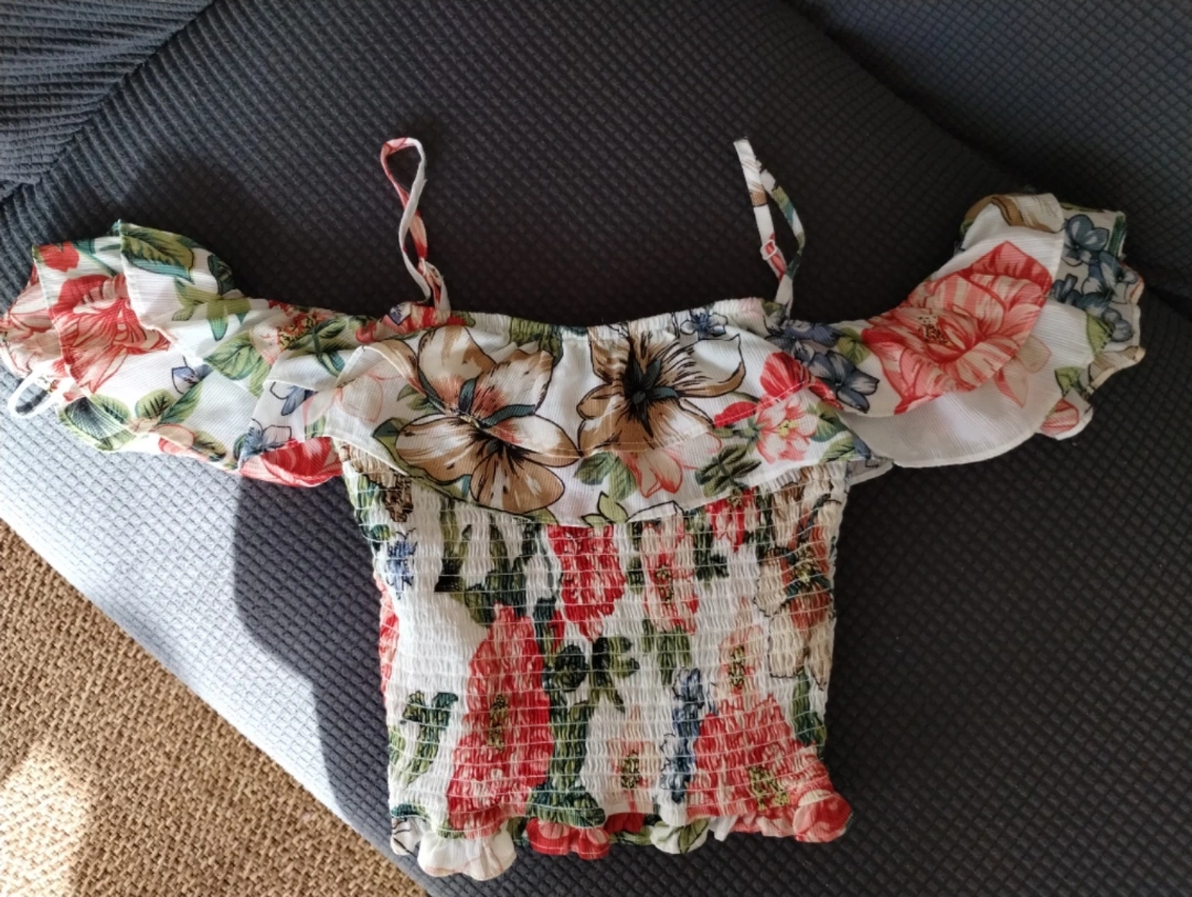 Women's size medium off-the-shoulder top. Features a floral print and smocked bodice. Short sleeves with ruffle detail. Great for summer.