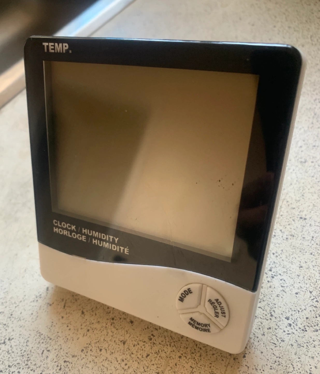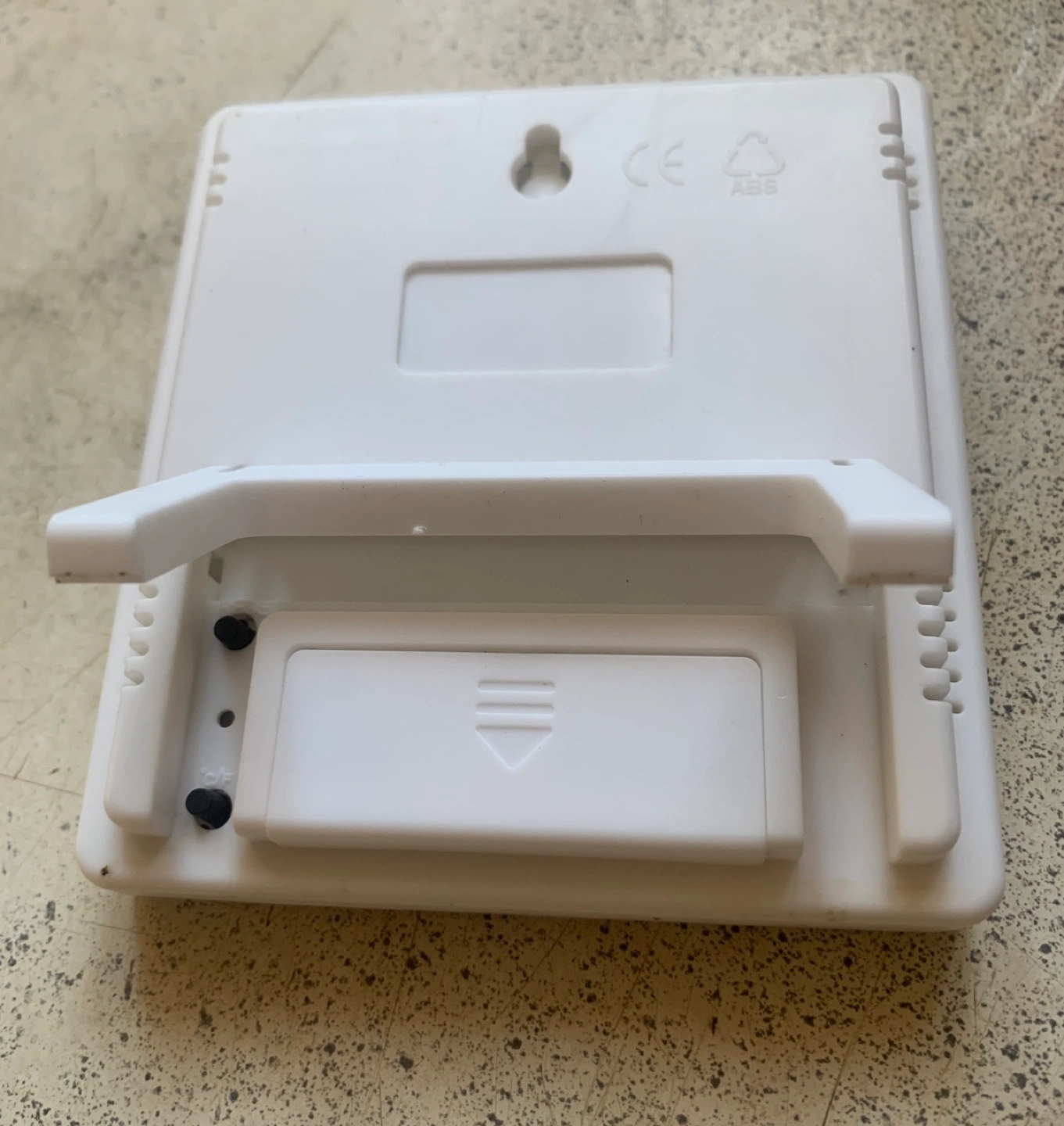 Wall-mountable or desk standing digital clock with humidity display. Features mode, adjust and memory buttons. Requires one AAA battery. Shows temperature and humidity.
