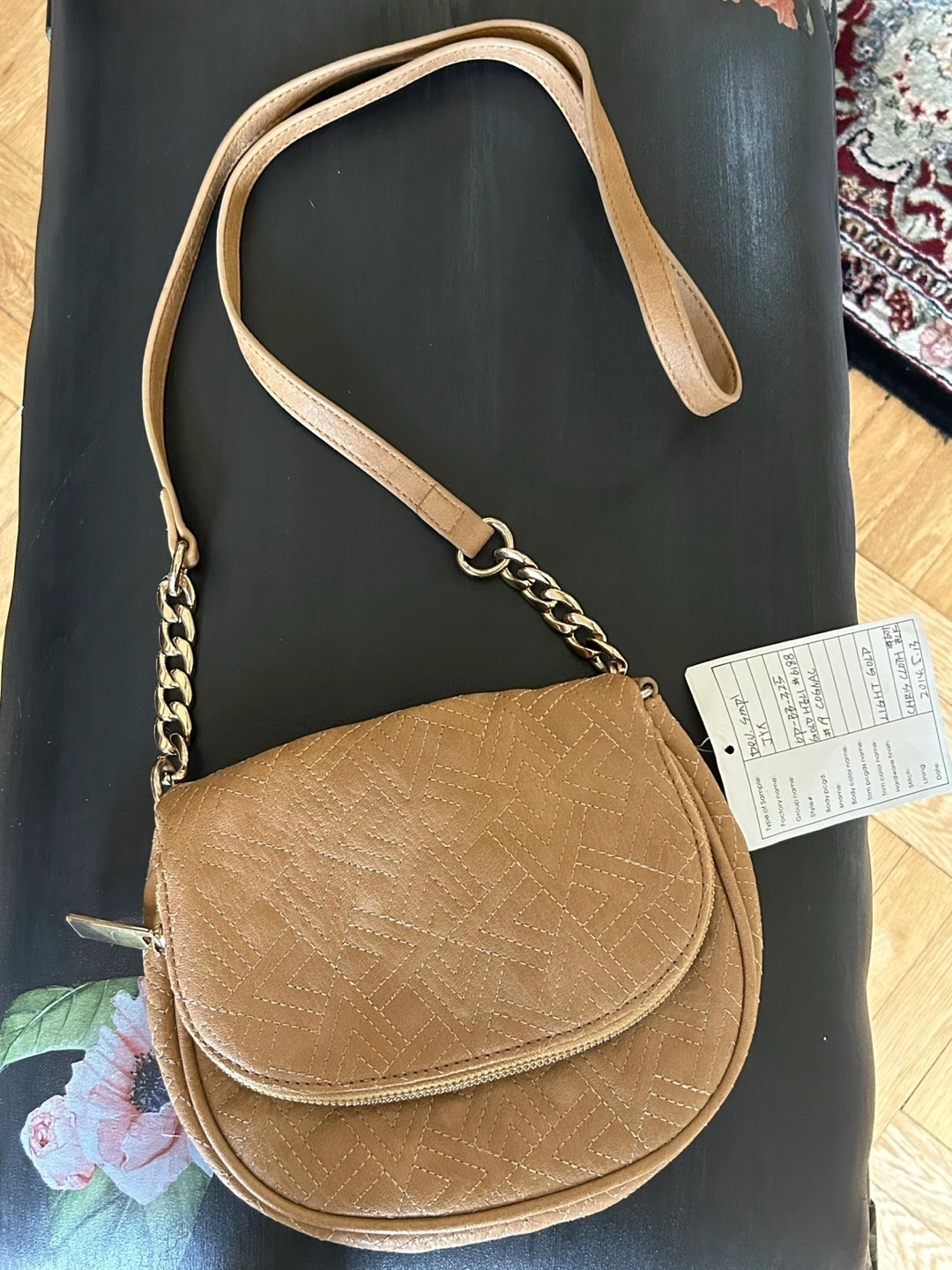 Genuine leather pocketbook, handbag. Beautiful NWT caramel/tan colored bag. Magnetic and zipper closure, stitching and sturdy chain detailing. Surprisingly roomy!