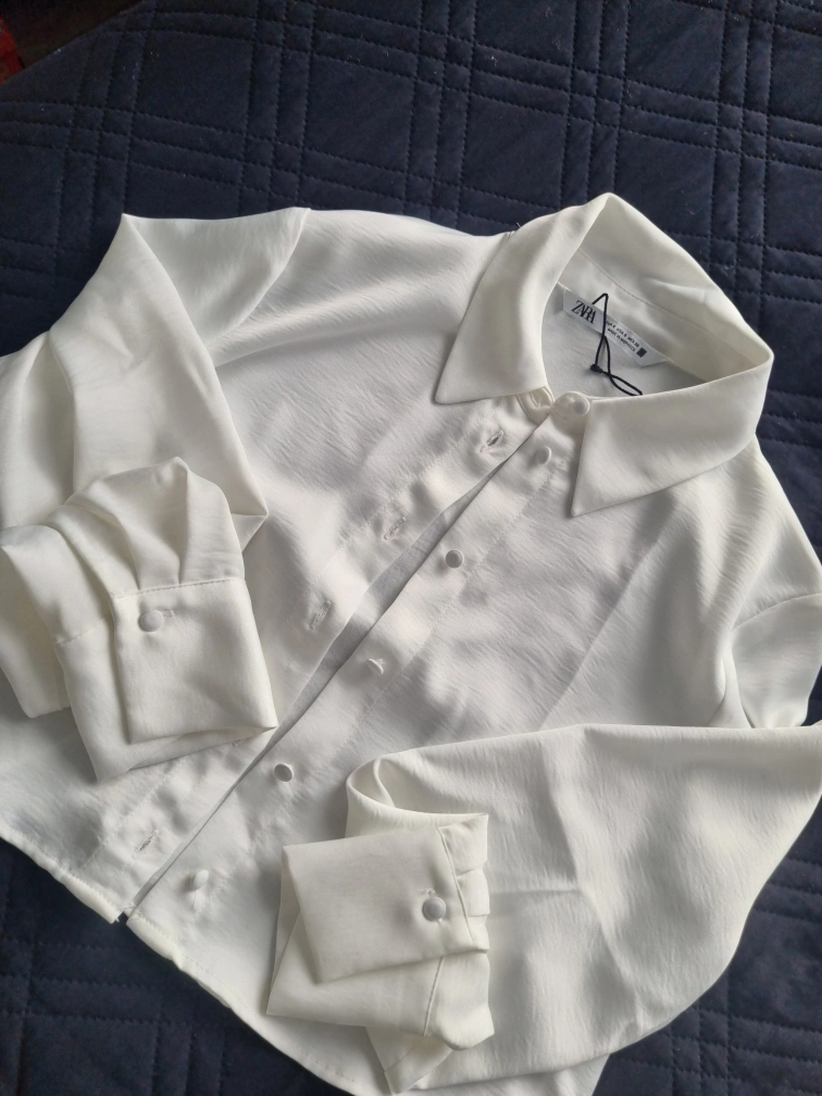 Zara White cropped long sleeve collared blouse