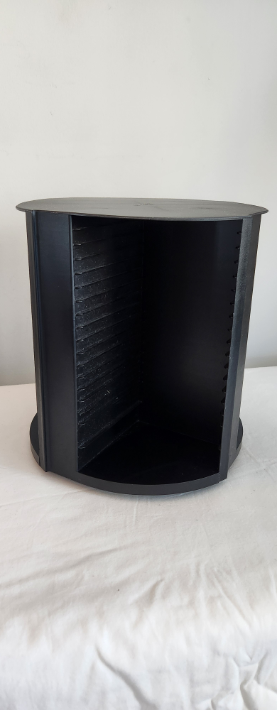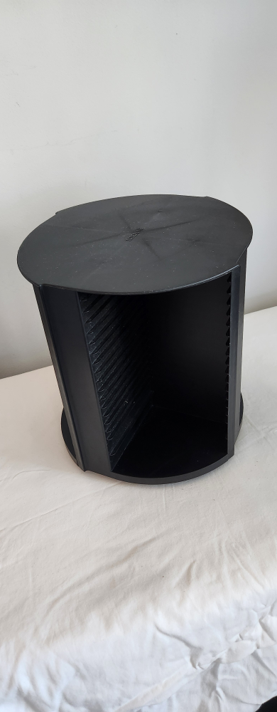 Black rotating CD or DVD storage unit. Holds many discs. Great for organizing your collection. Circular design. Easy to use.