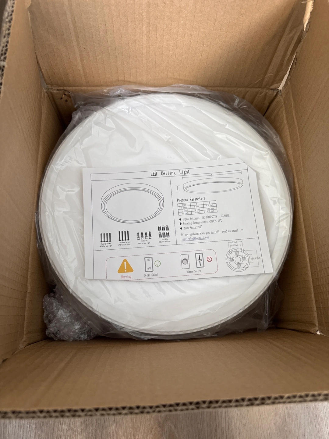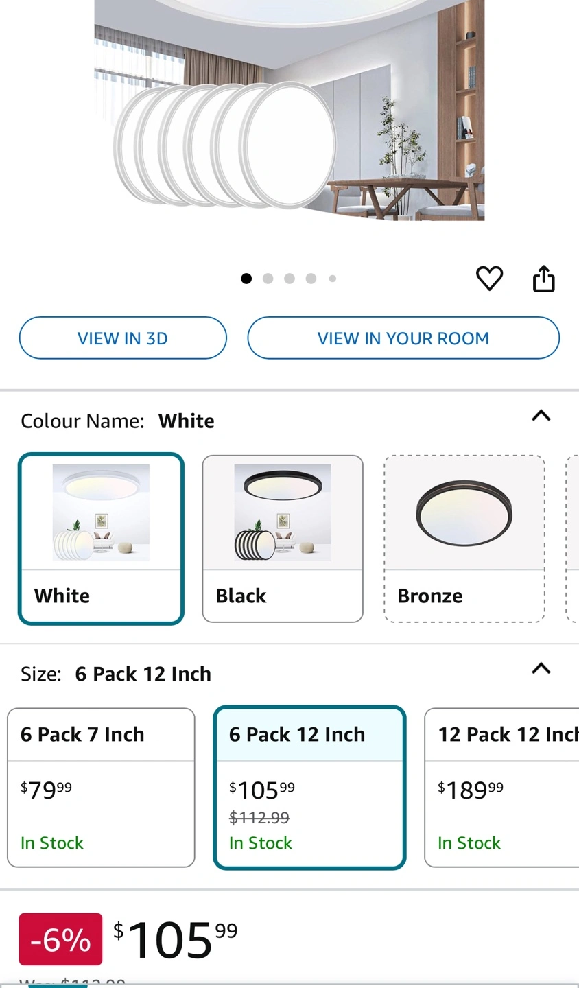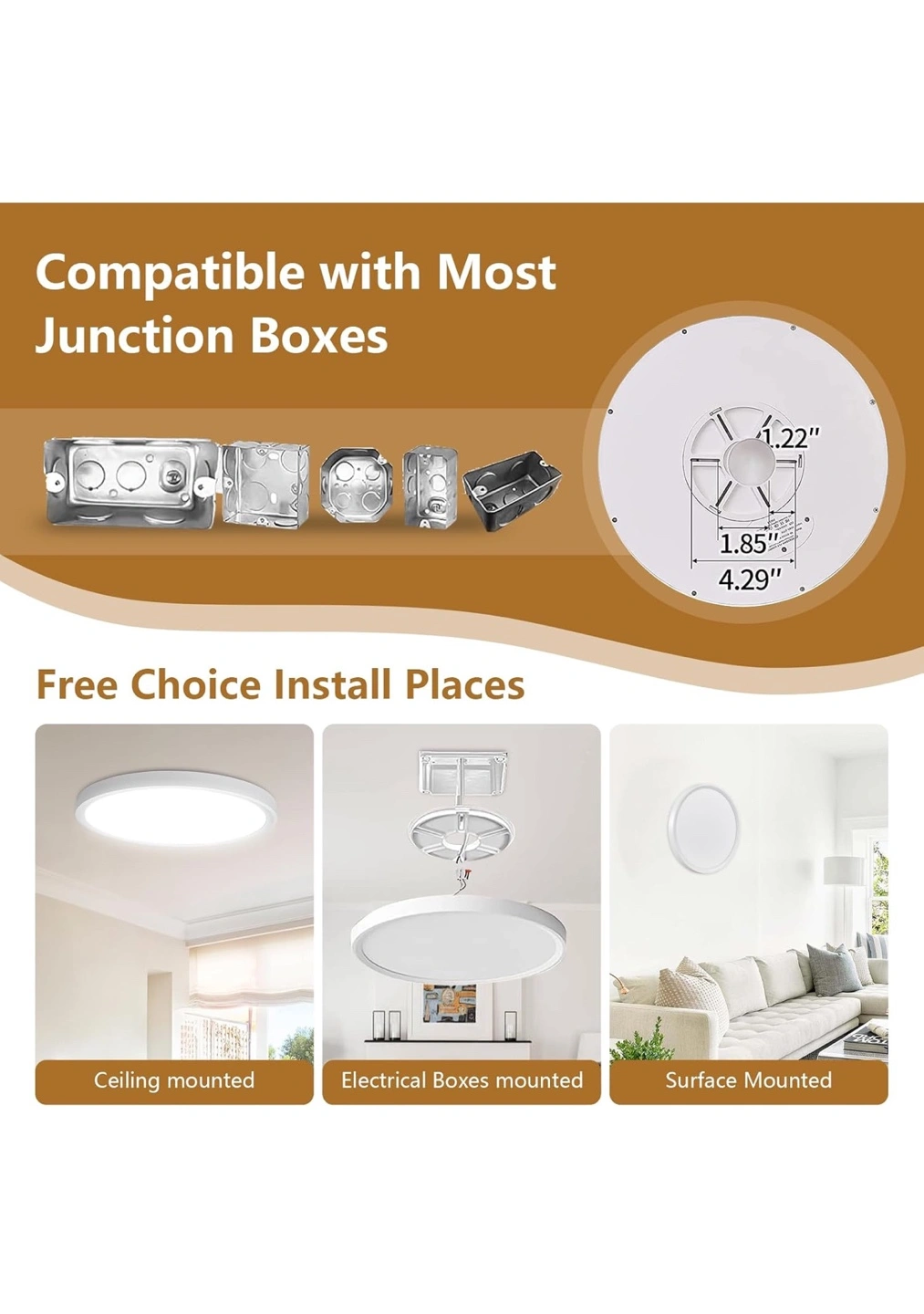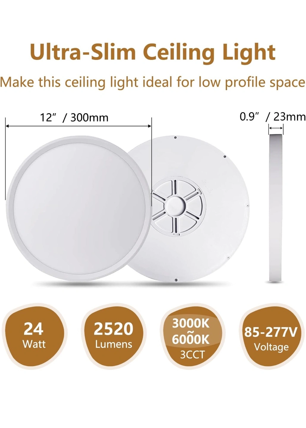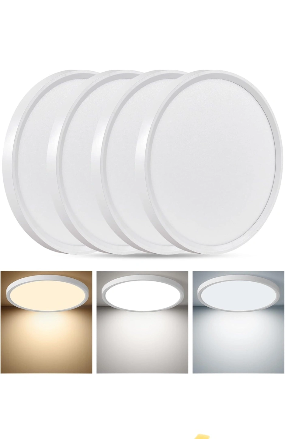 Round LED ceiling light fixtures. Energy efficient, 24W, 2520 lumens. 3CCT (3000K, 6000K). Low profile design, ideal for low ceilings. Easy installation. Includes 6 lights. White colour.