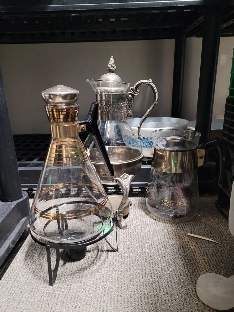 Three vintage glass coffee and tea servers. Silver-toned accents. 2 features a stand. Show some minor wear. price is per each. Must pickup. Please. no etransfer or long holds. this is a cash price. bring cash. This is in storage and I will meet you there. I can access the building during 8 to 430 Monday to Friday. No one is there outside of those times.