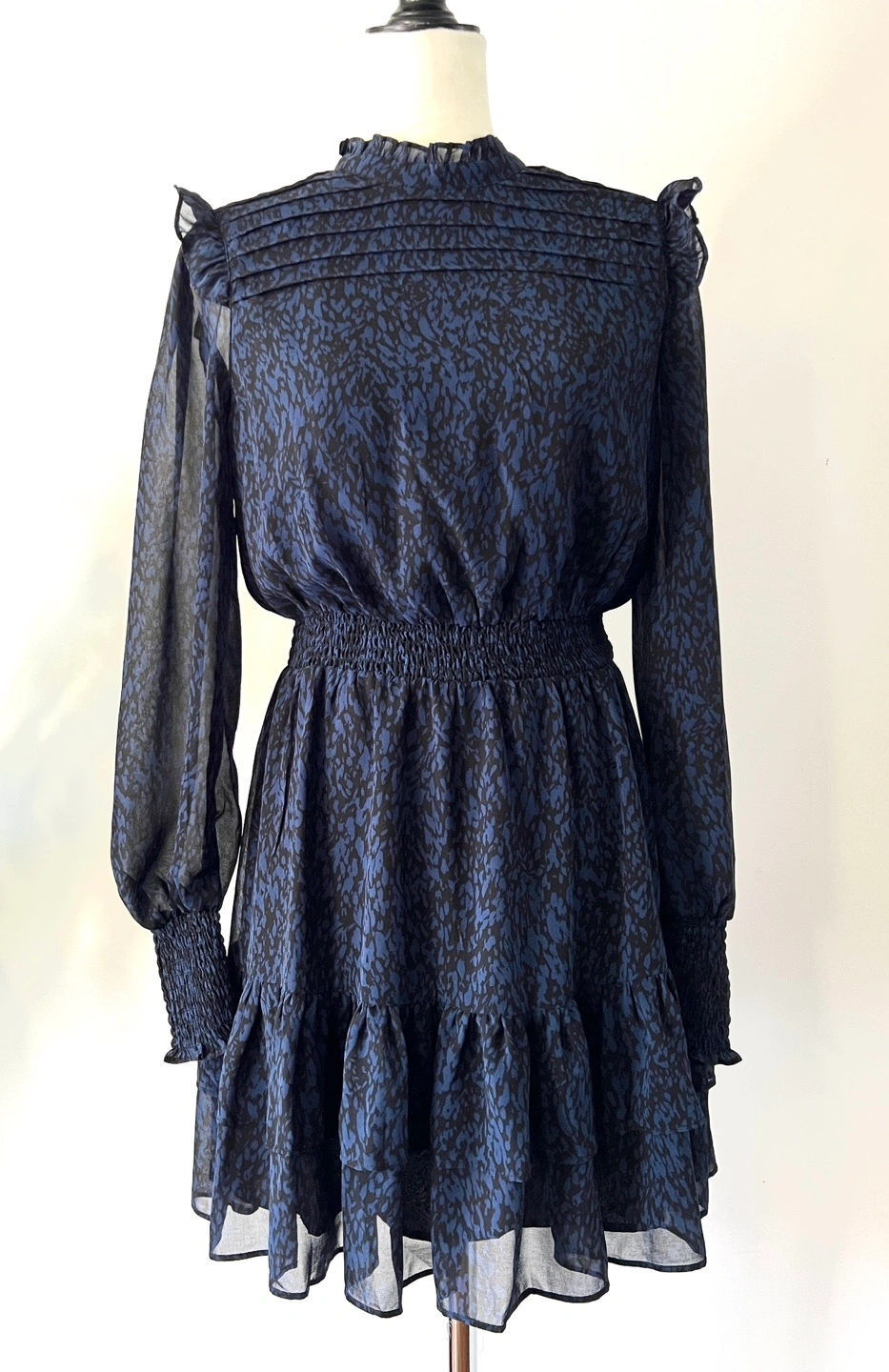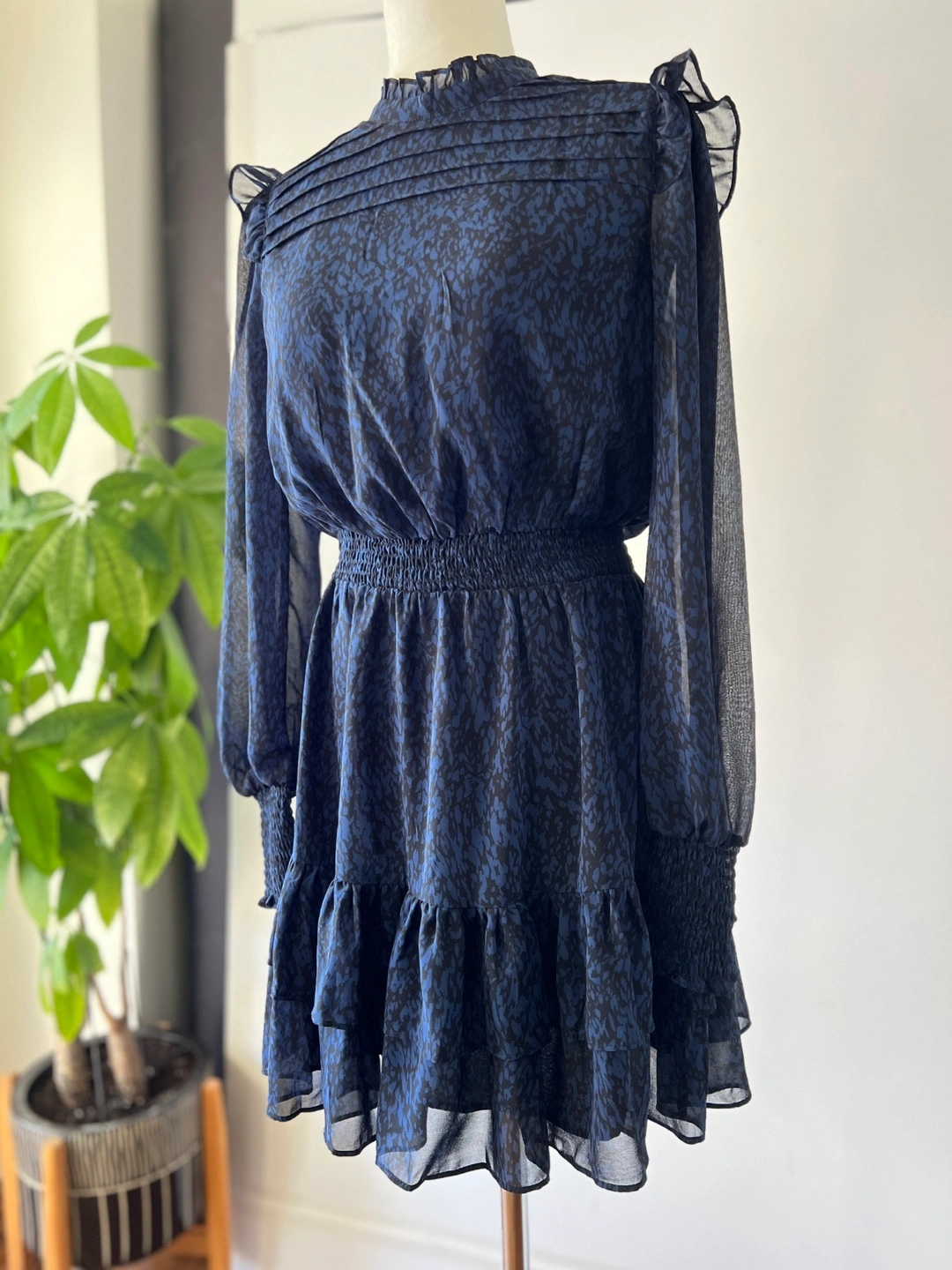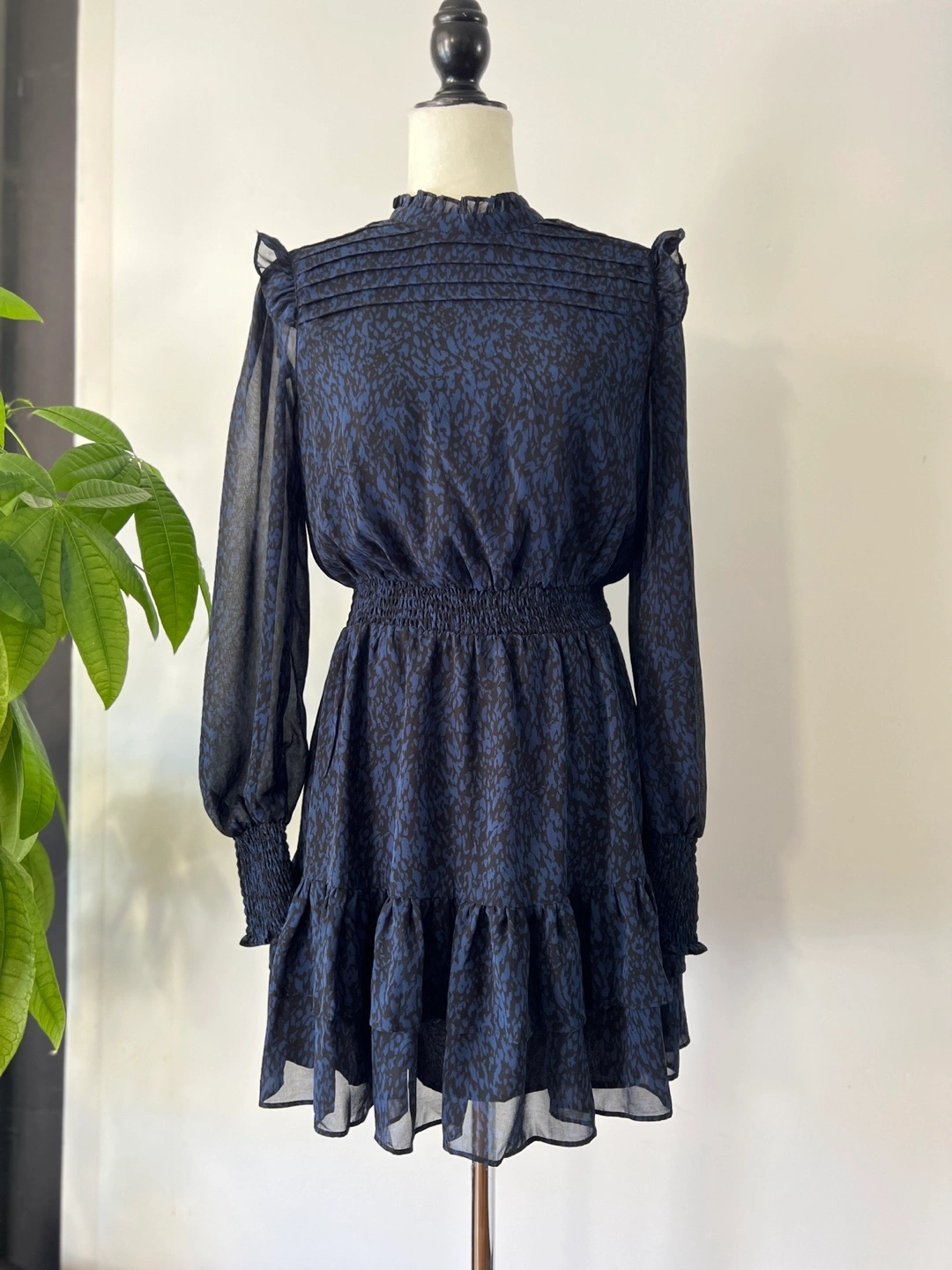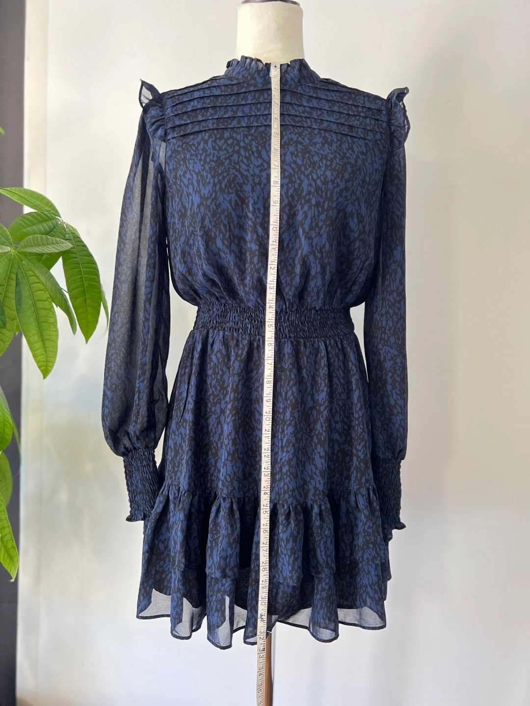 Beautiful mini dress. Features long sleeves, ruffled details, and a smocked waist. Dark blue and black print on sheer material. Perfect for a night out or special occasion.