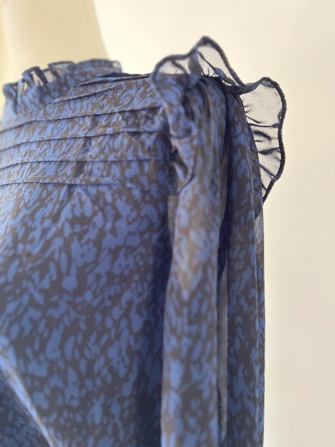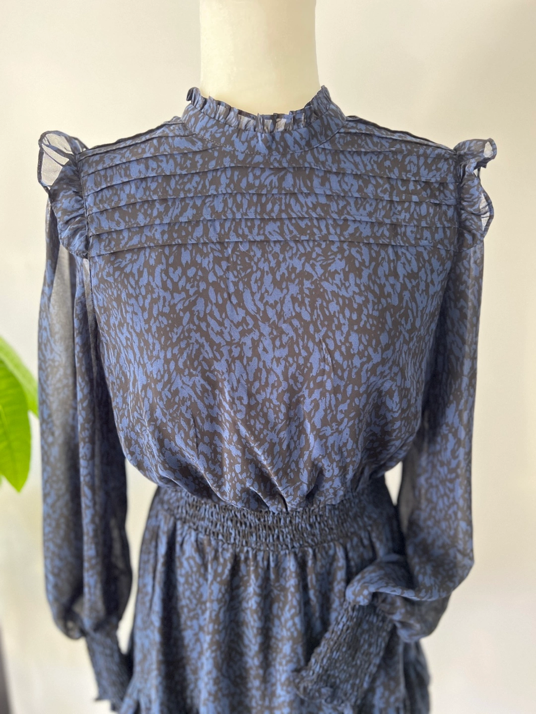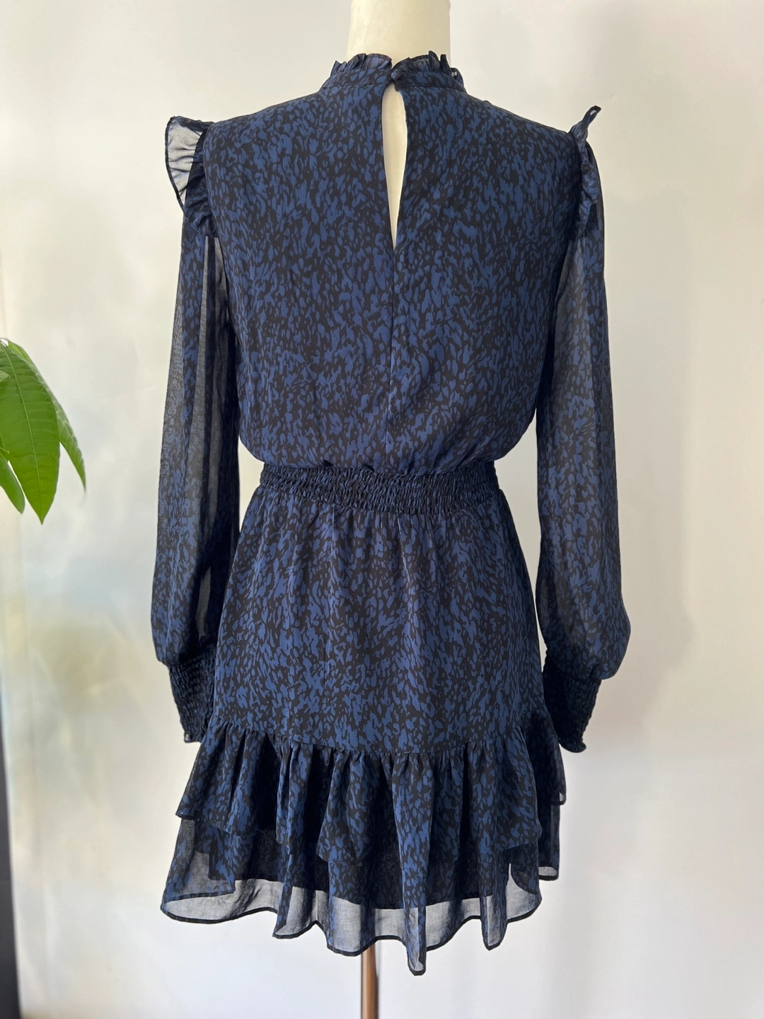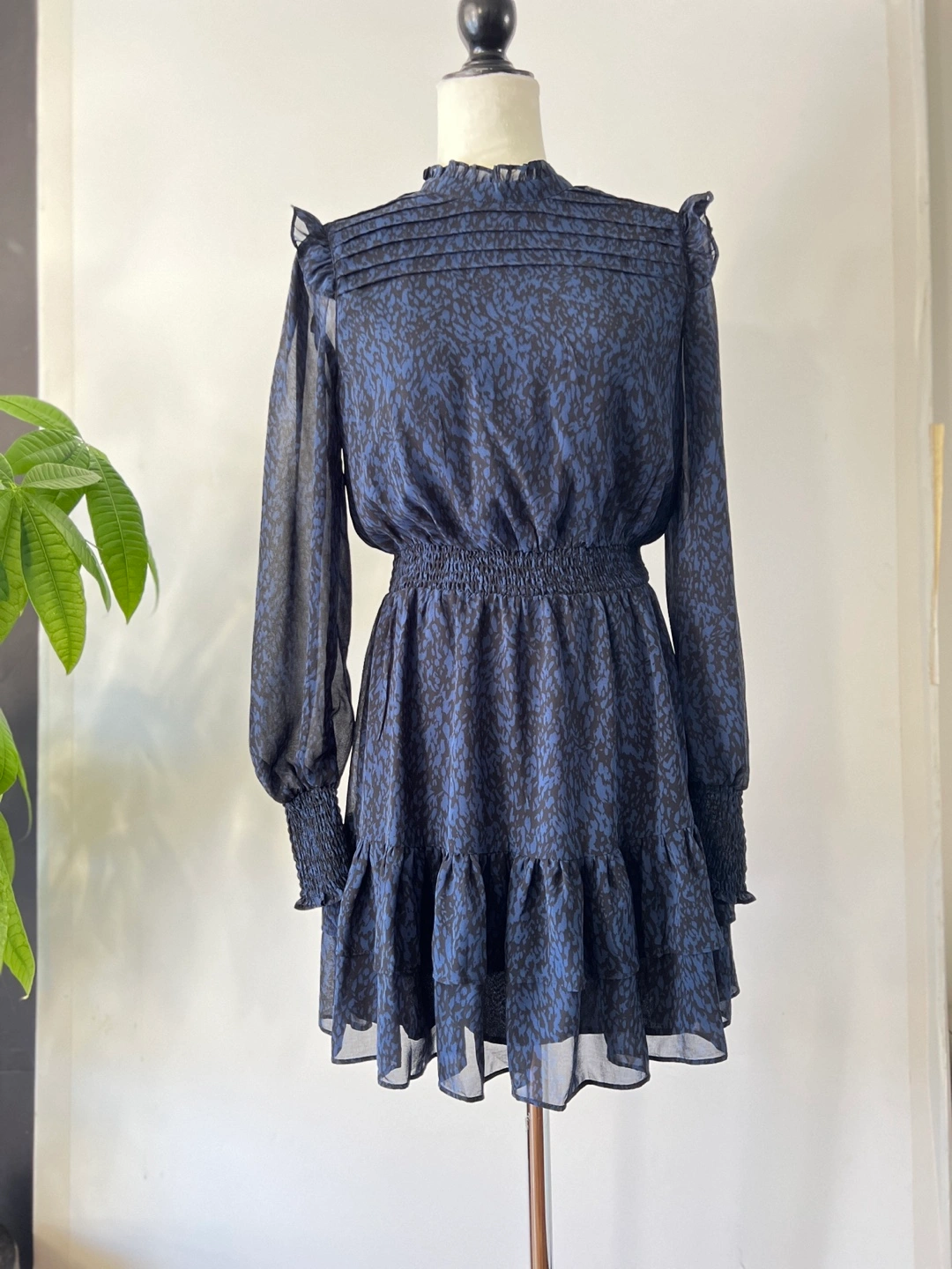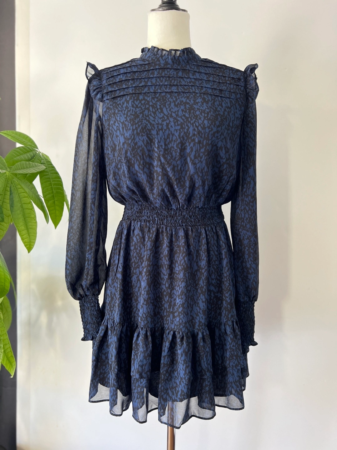 Beautiful mini dress. Features long sleeves, ruffled details, and a smocked waist. Dark blue and black print on sheer material. Perfect for a night out or special occasion.