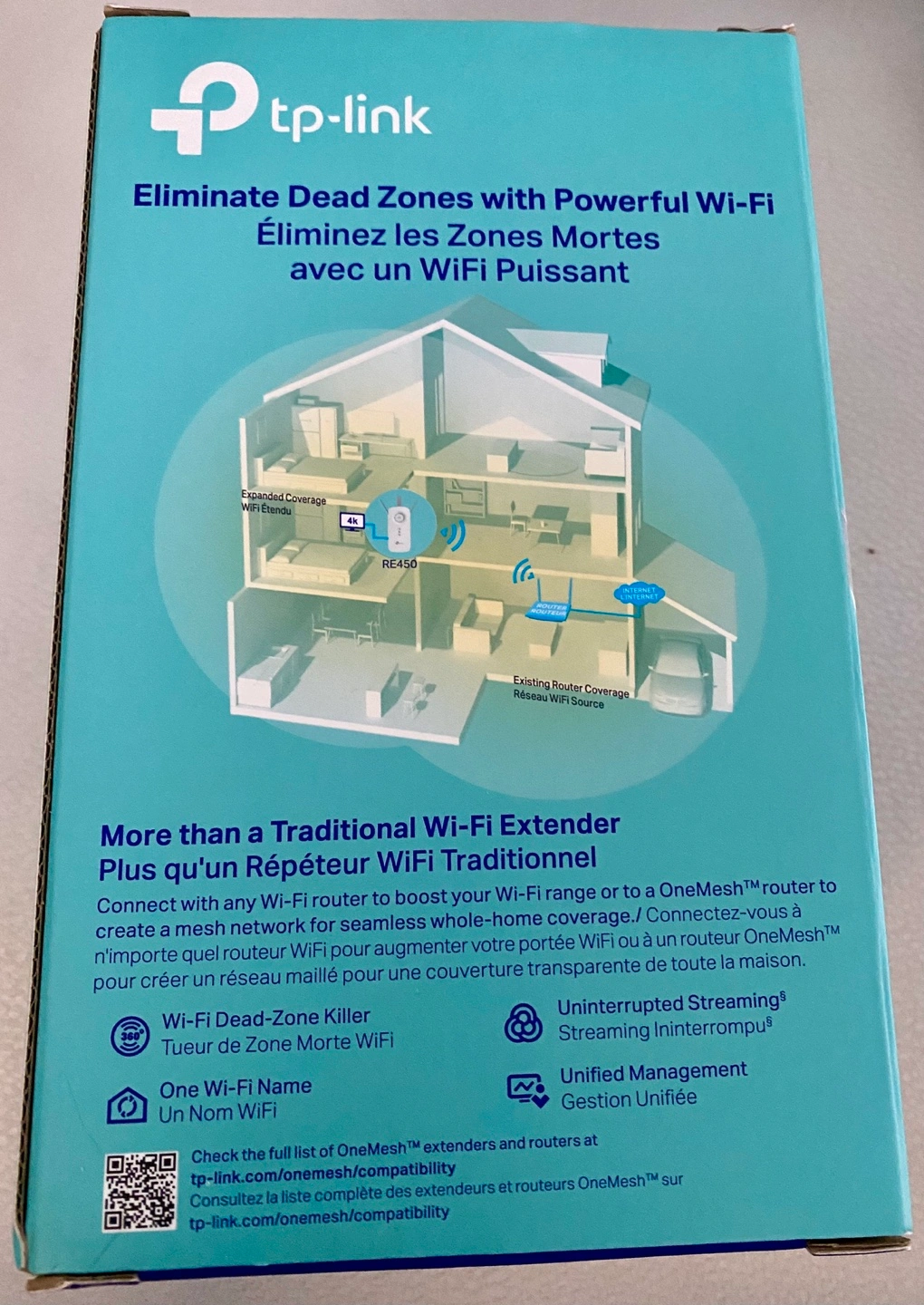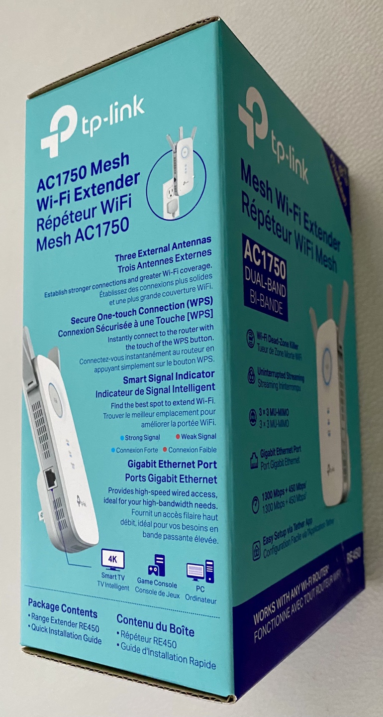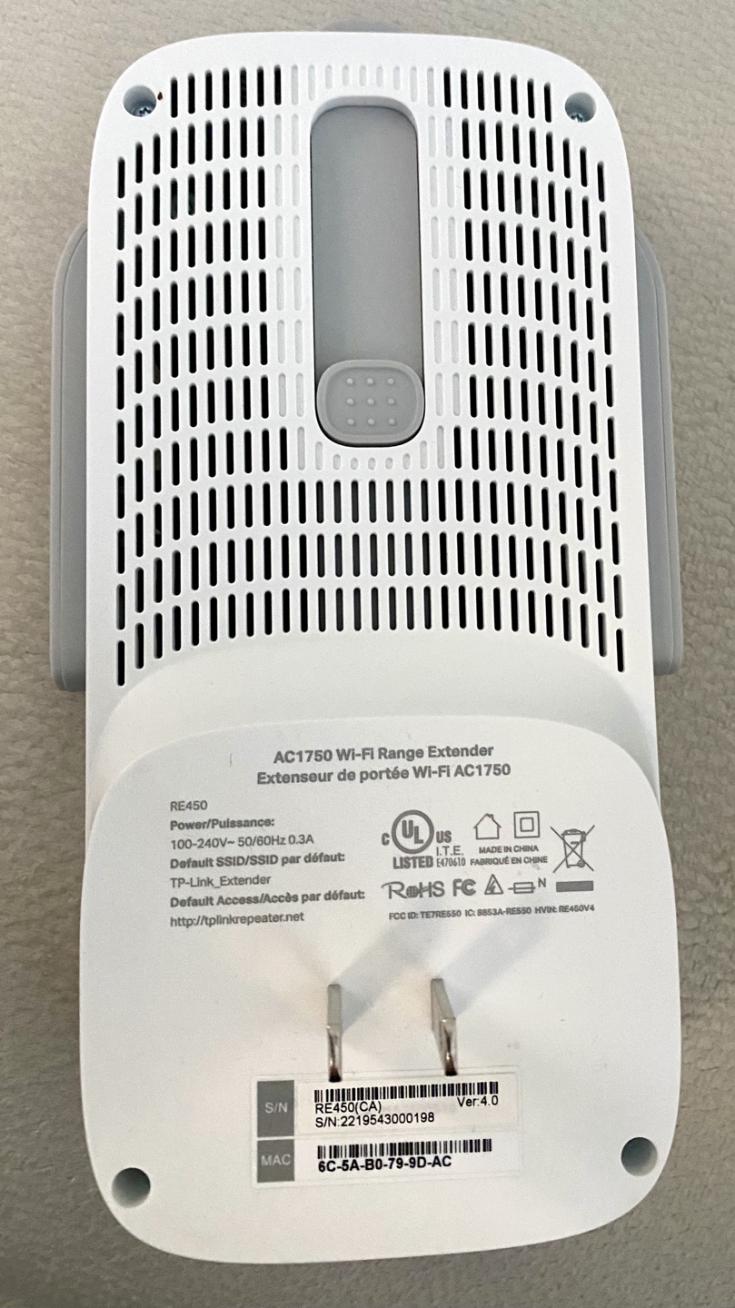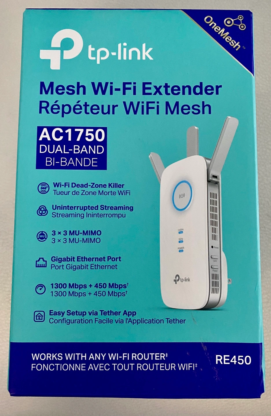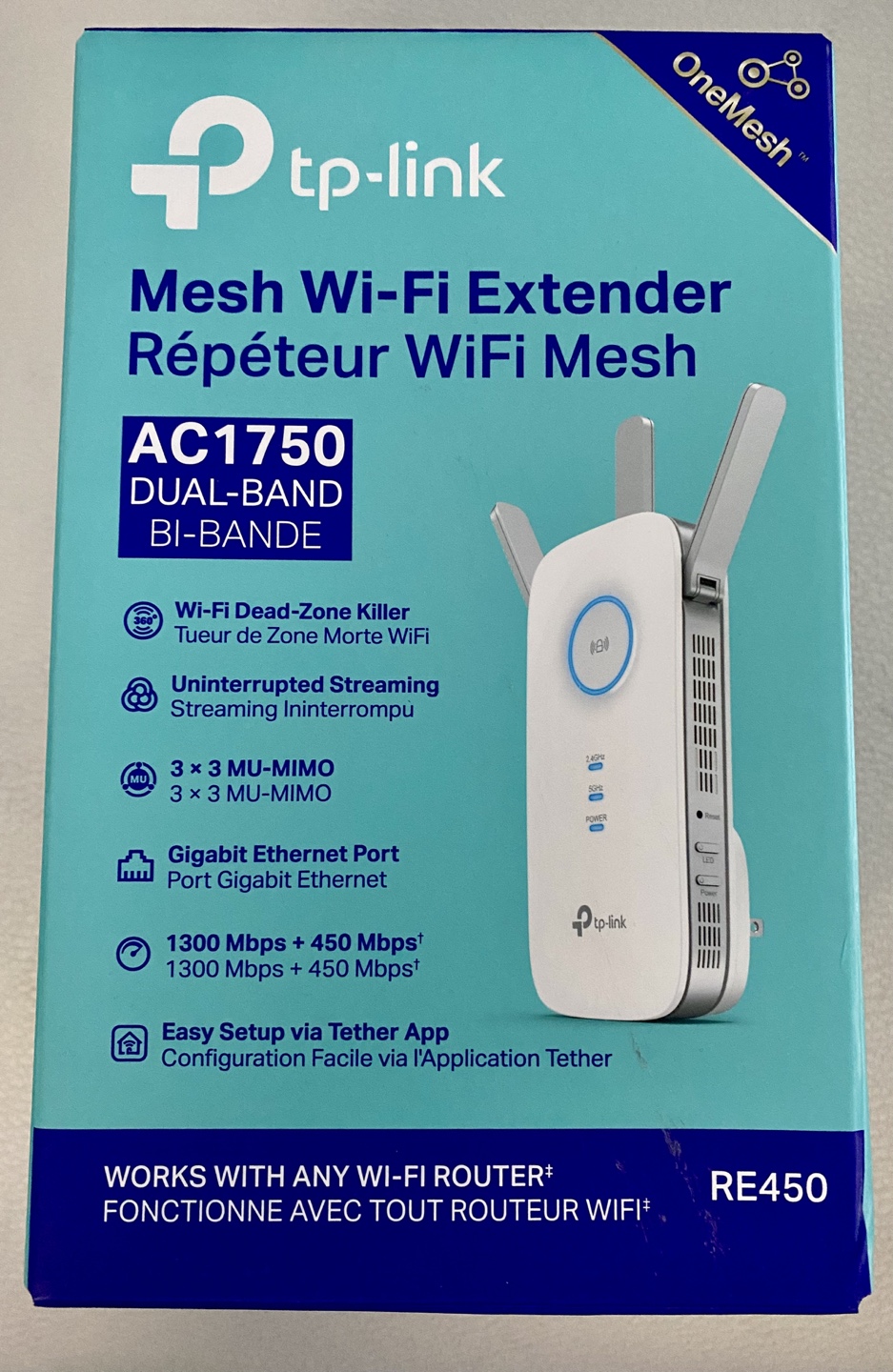 TP-Link RE450 AC1750 Mesh Wi-Fi extender. Dual-band. Gigabit Ethernet port. Easy setup via Tether app. Three external antennas. Extends Wi-Fi coverage. Eliminates dead zones. Works great, only used for two days as we changed our home technology, very strong repeater. Purchased at Best Buy.