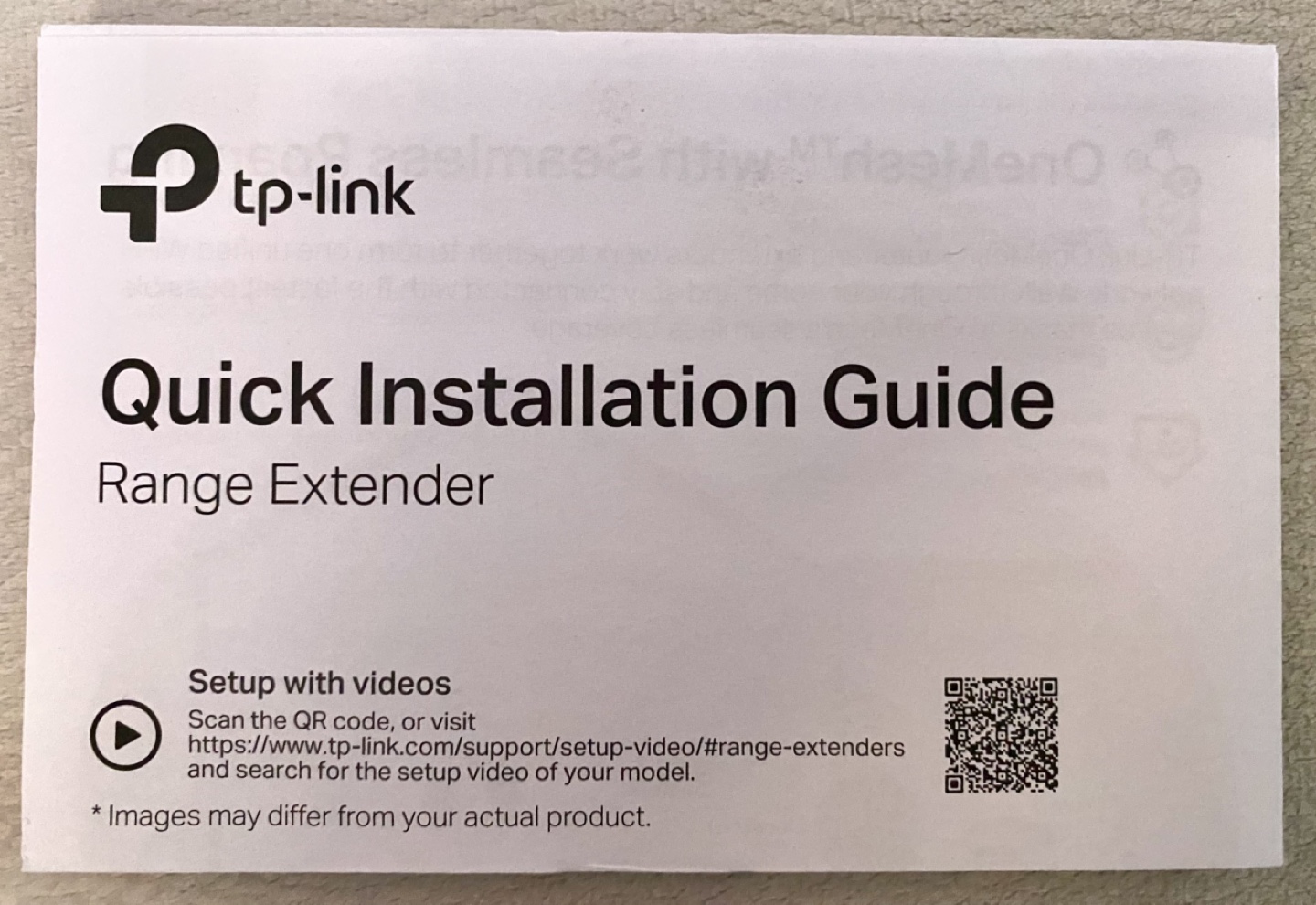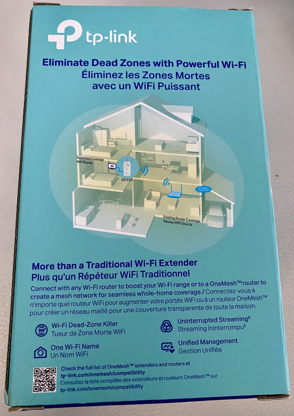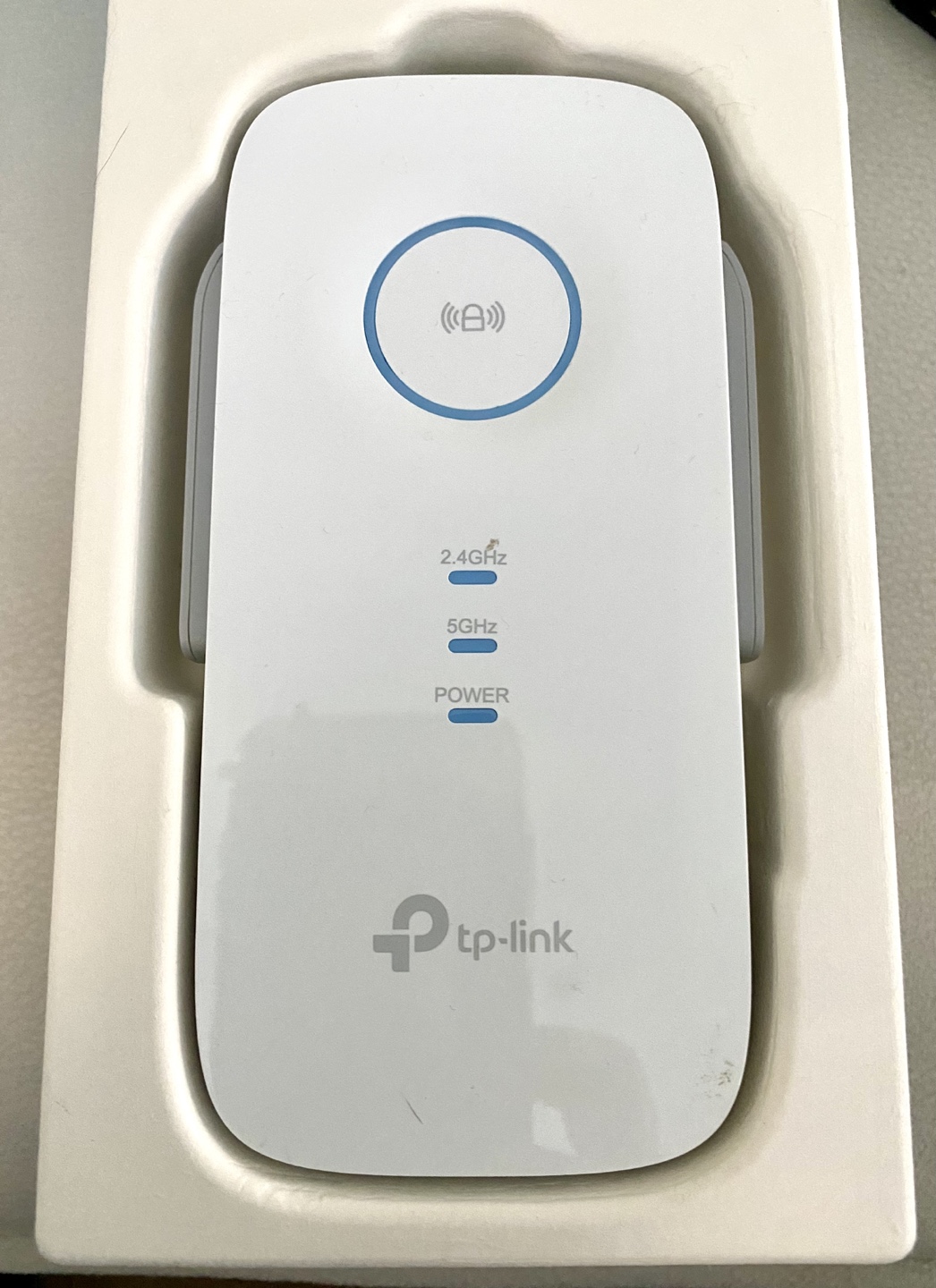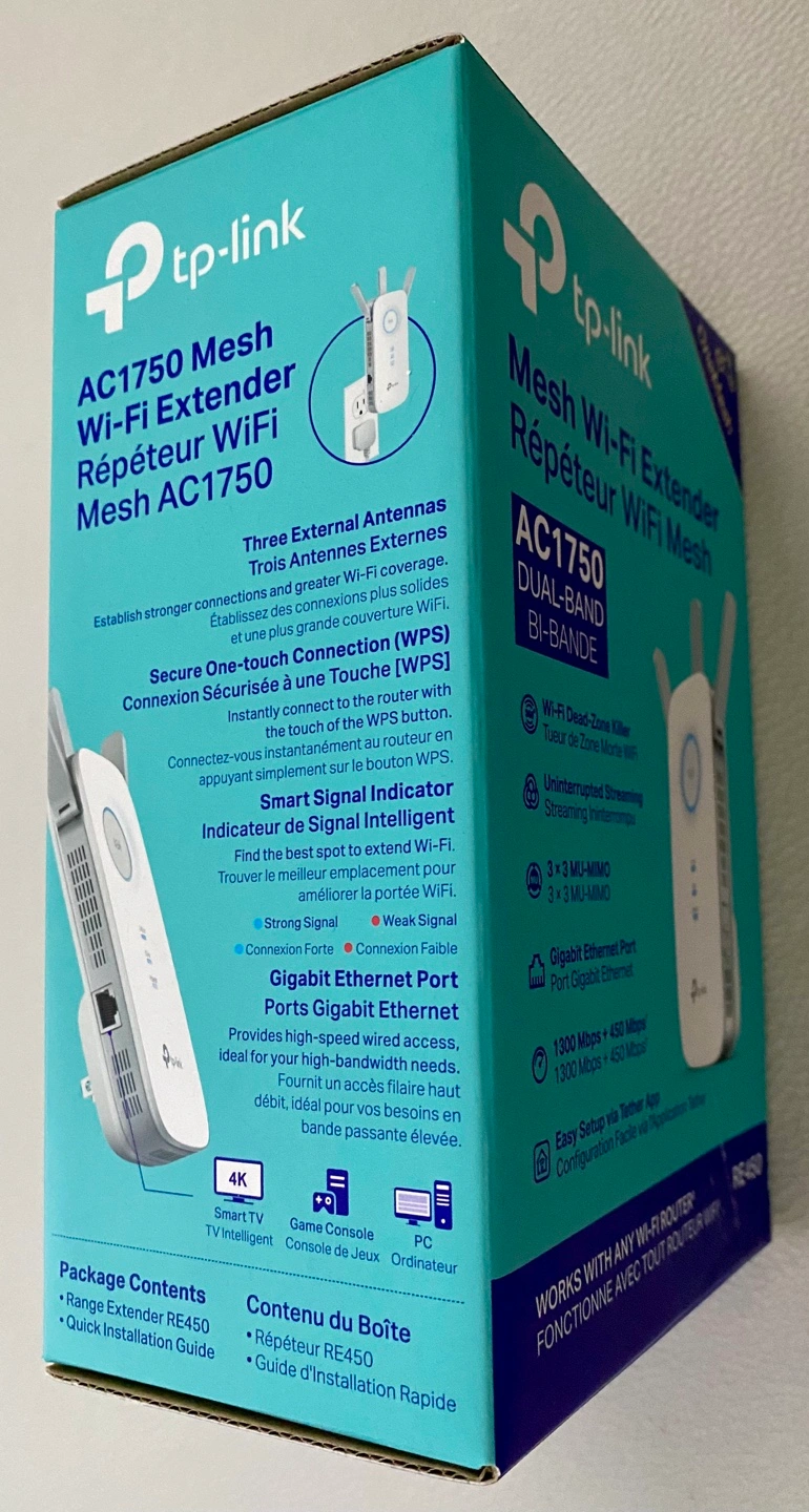 TP-Link RE450 AC1750 Mesh Wi-Fi extender. Dual-band. Gigabit Ethernet port. Easy setup via Tether app. Three external antennas. Extends Wi-Fi coverage. Eliminates dead zones. Works great, only used for two days as we changed our home technology, very strong repeater. Purchased at Best Buy.