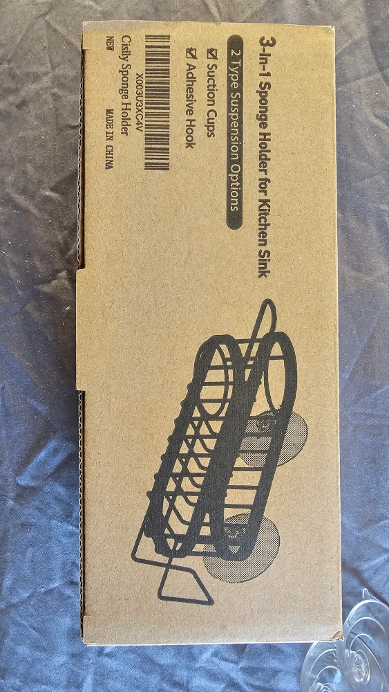 New in box. 3-in-1 sponge holder. Two suction cups and adhesive hook for installation. Holds sponges, scrubbers, and cloths. Black metal wire construction. Compact design.