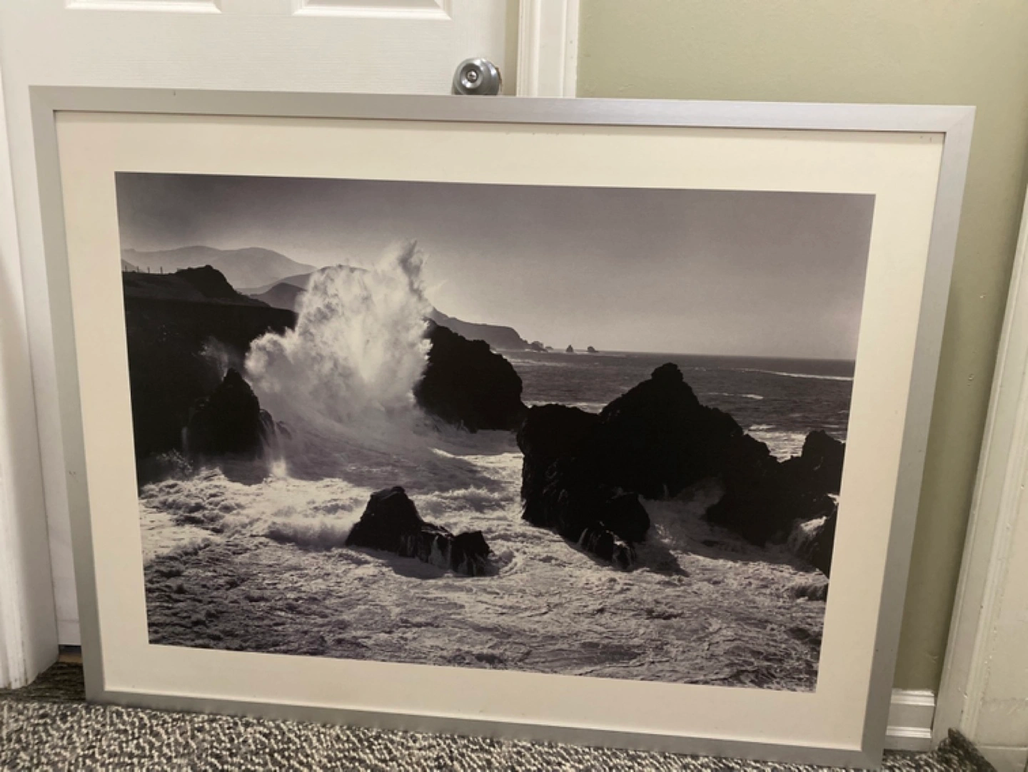 Stunning black and white photograph of ocean waves crashing against rocky coastline. Large format print in a silver frame. Great for a living room or office.