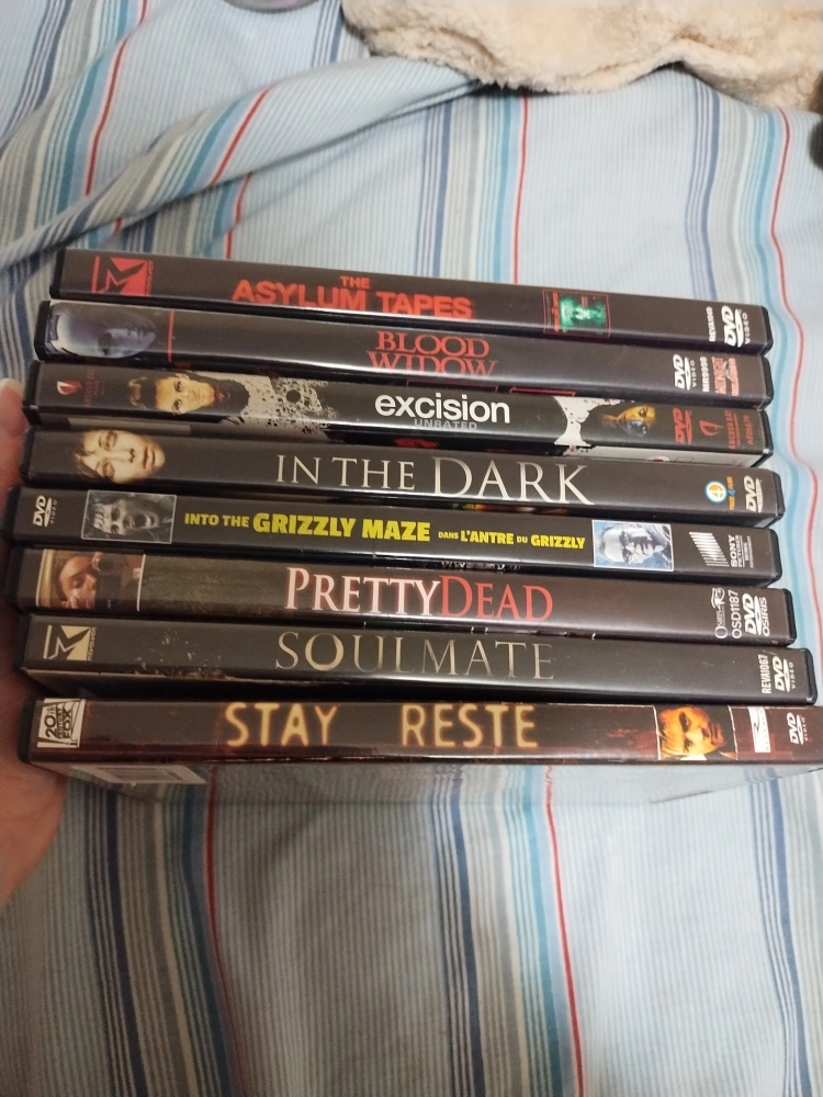 Collection of eight horror and thriller DVDs. Titles include: The Asylum Tapes, Blood Widow, Excision, In the Dark, Into the Grizzly Maze, Pretty Dead, Soulmate, and Stay. In good to like new condition.