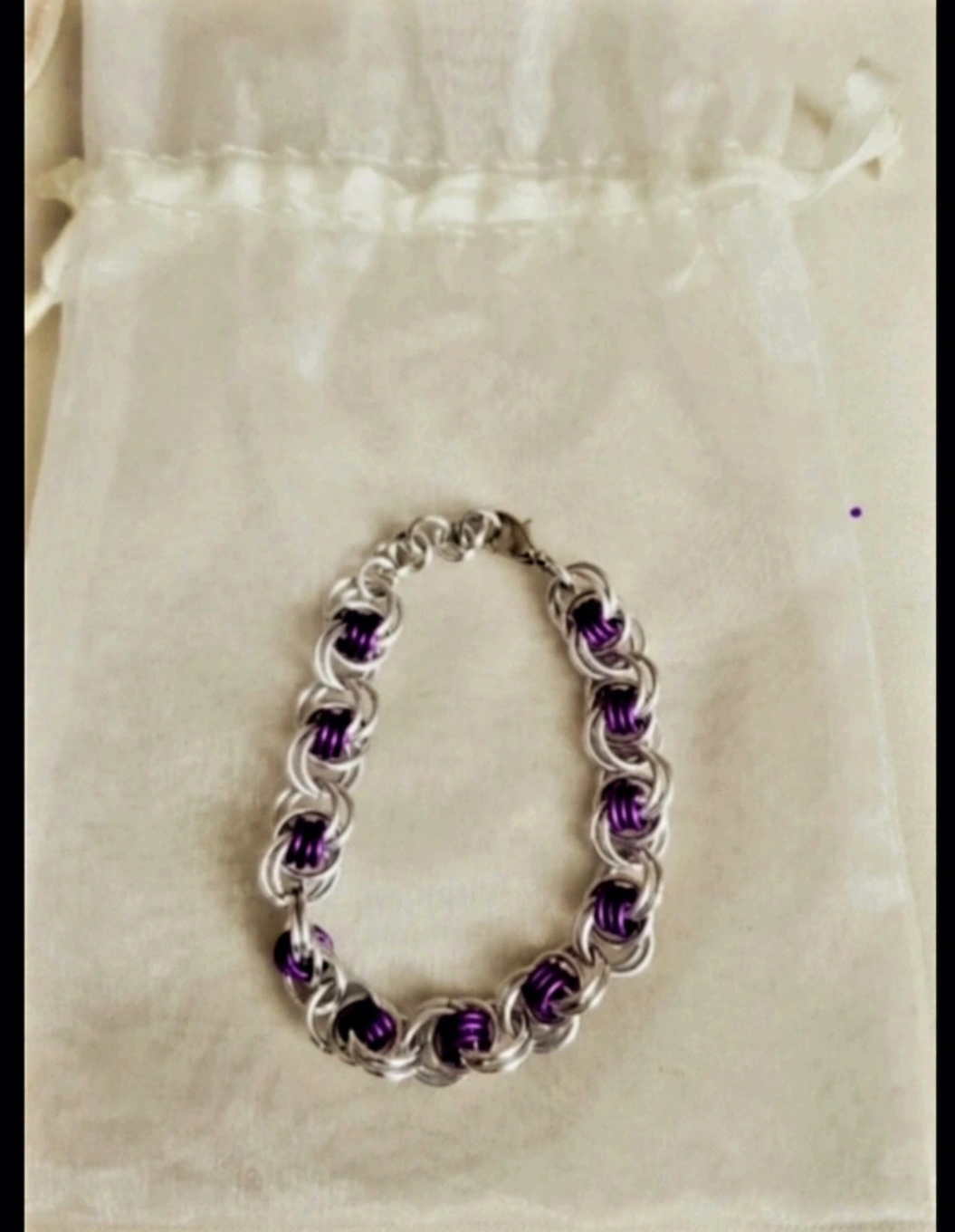 Unique handmade bracelet. Features alternating silver and purple metal links. Comes Secure clasp.