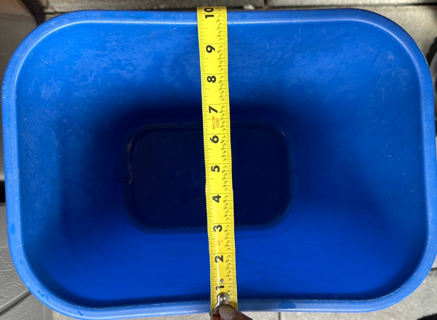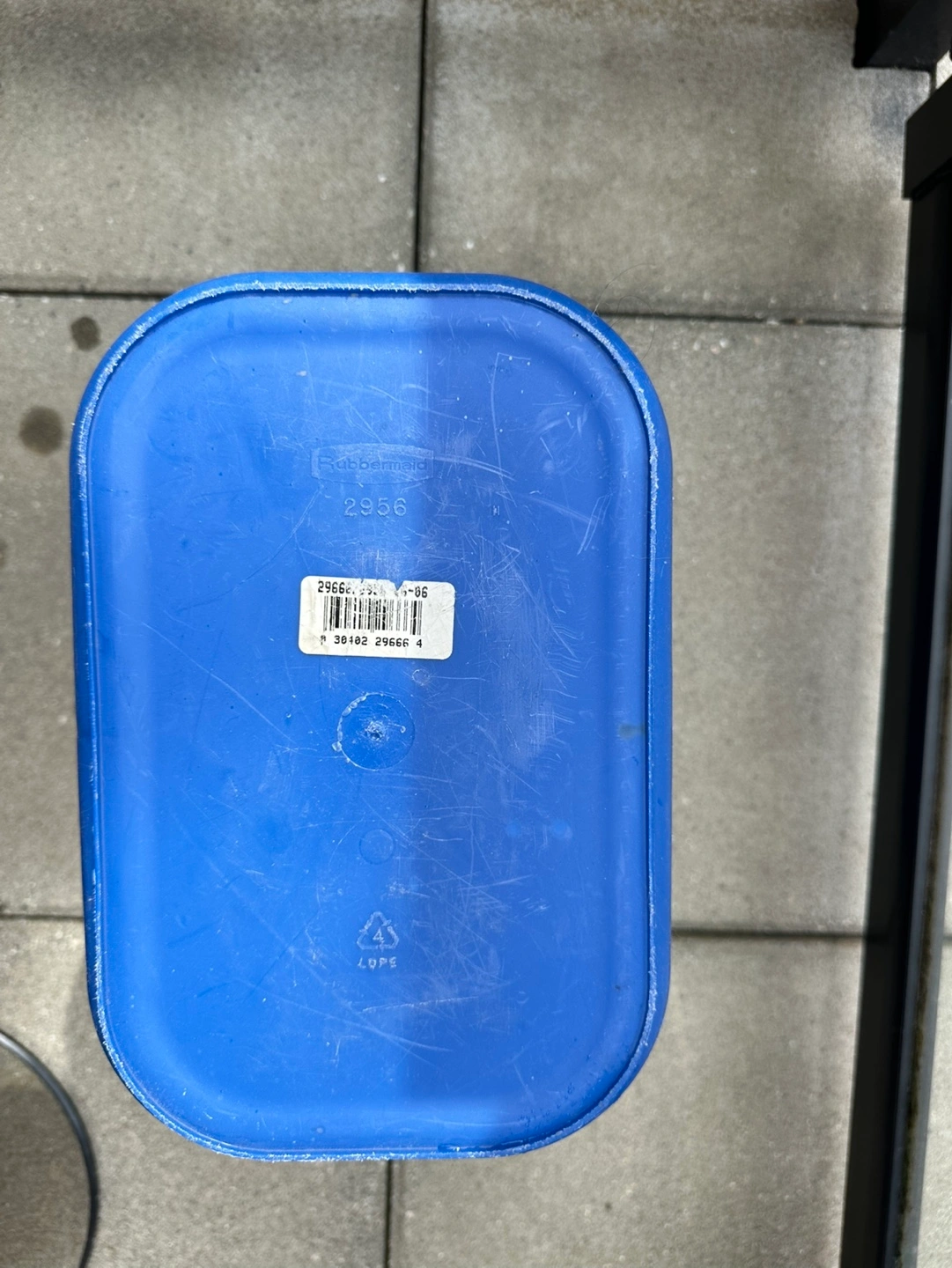 76Large blue plastic bin. Approximately 14 inches wide and 15 inches tall. Shows some minor wear. Good condition.
