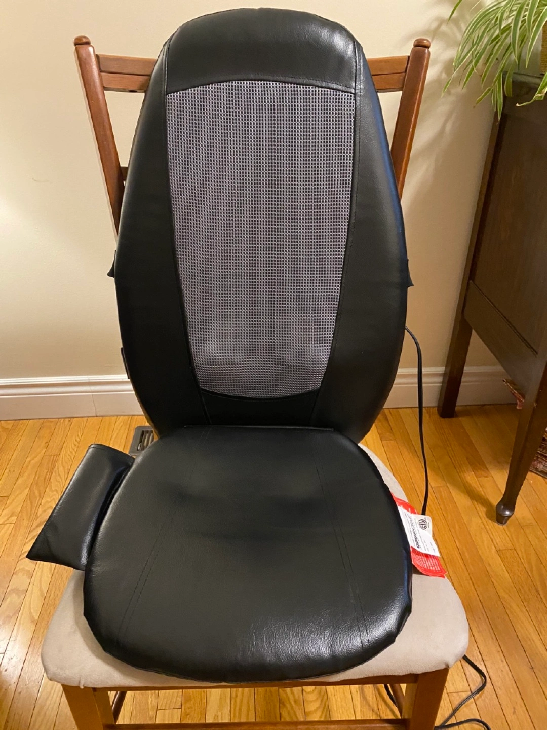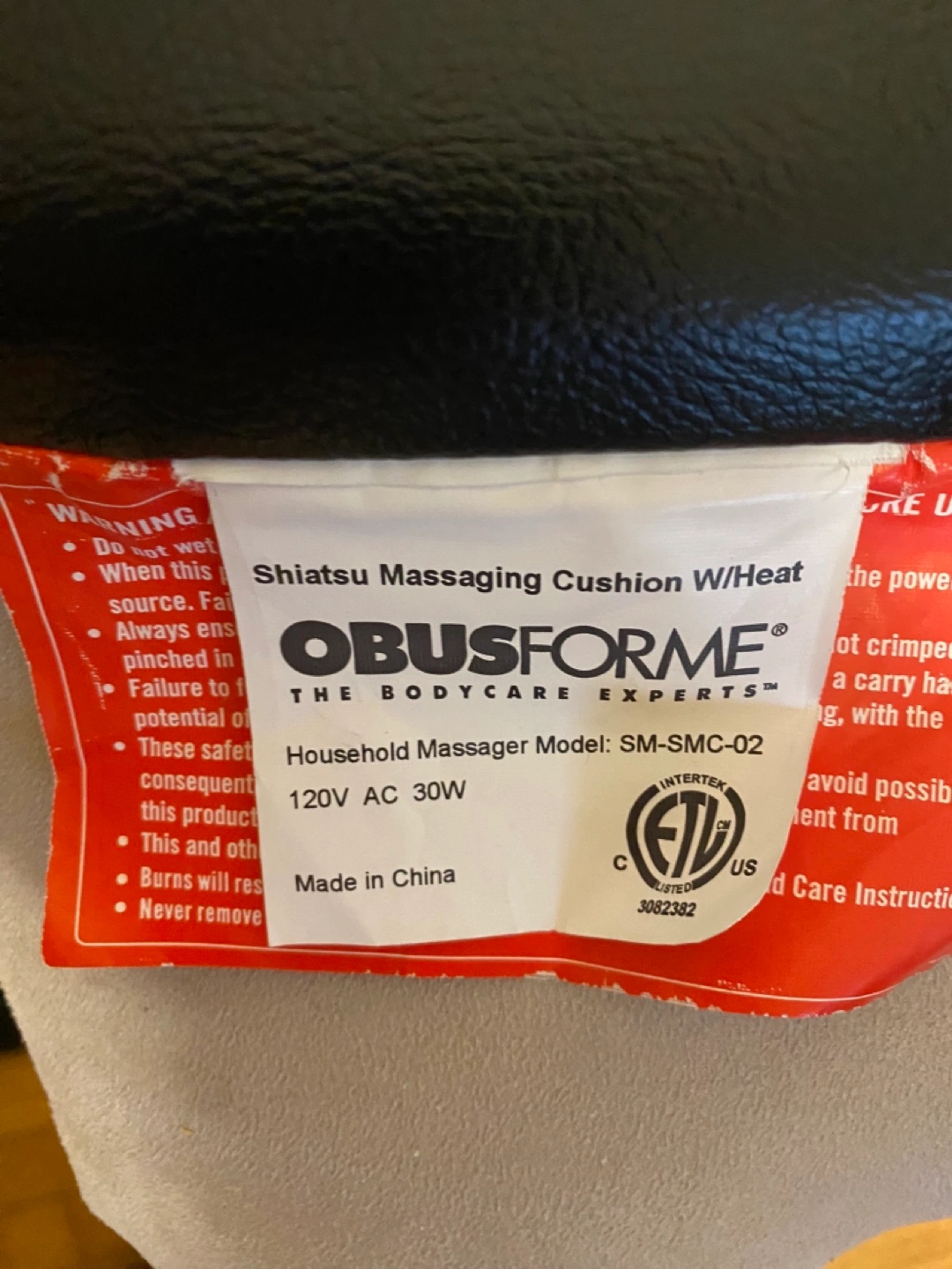 EUC, Obus Forme Massager with adjustable settings and heat. Plugs in. Has Velcro straps to secure to any chair with a back. Vinyl material can be easily cleaned and sanitized between users. Excellent relief for stress and tense muscles.