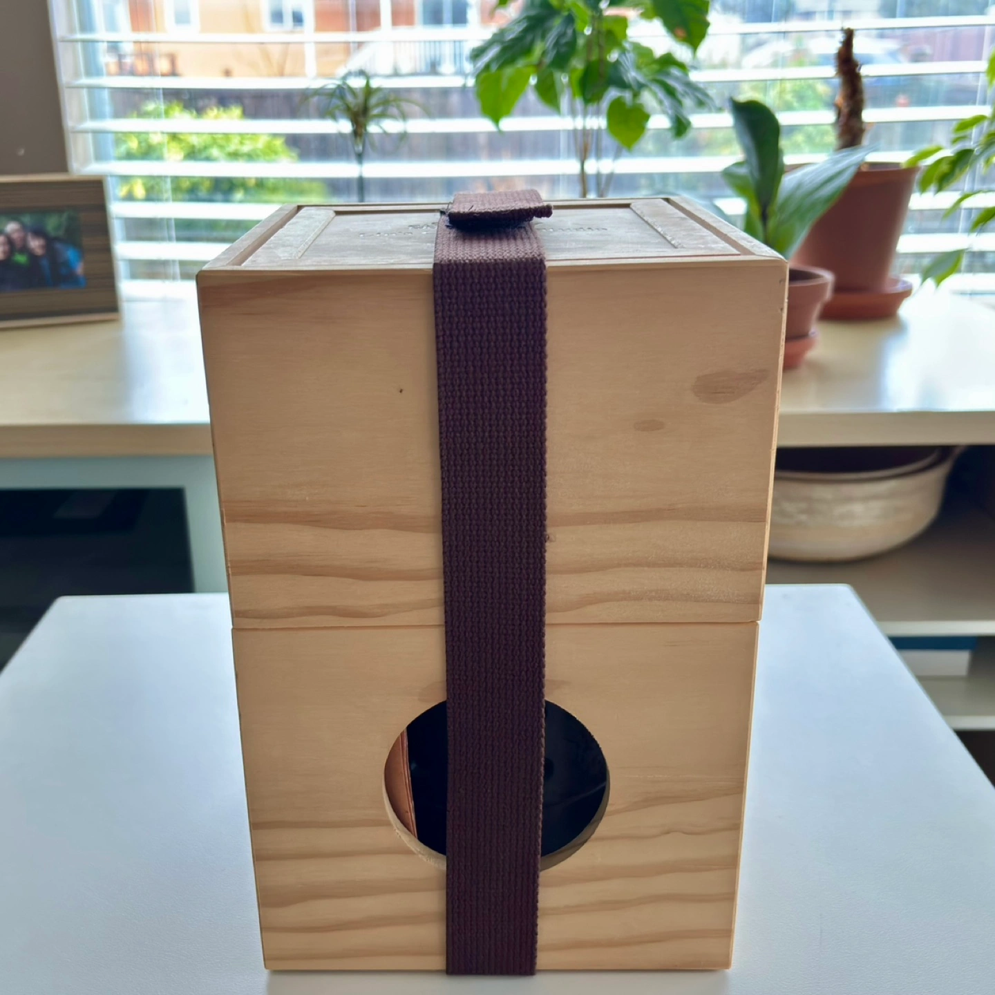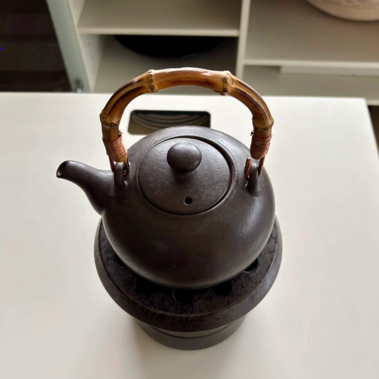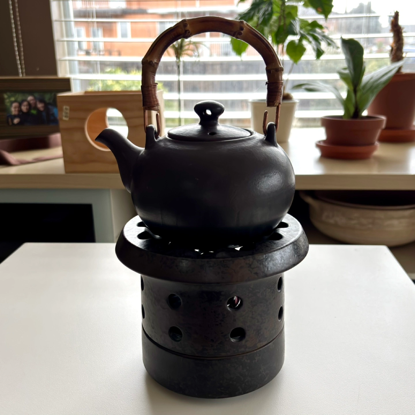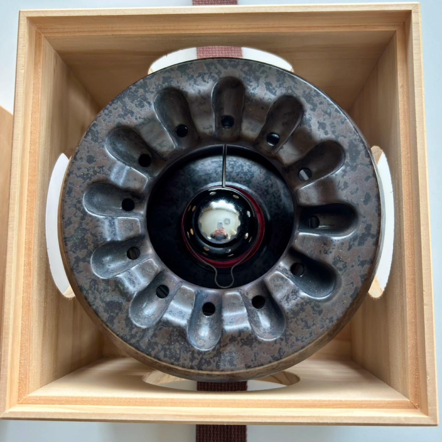 Unique ceramic tea warmer. Dark brown glaze. Comes in original wooden box. Excellent condition.
