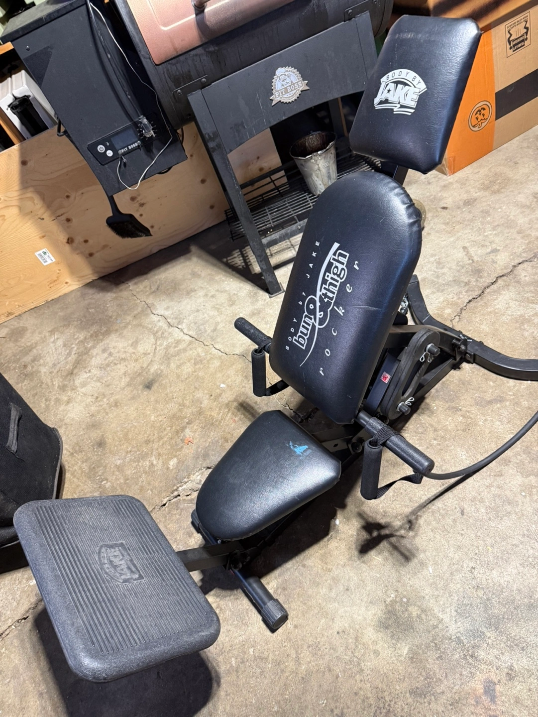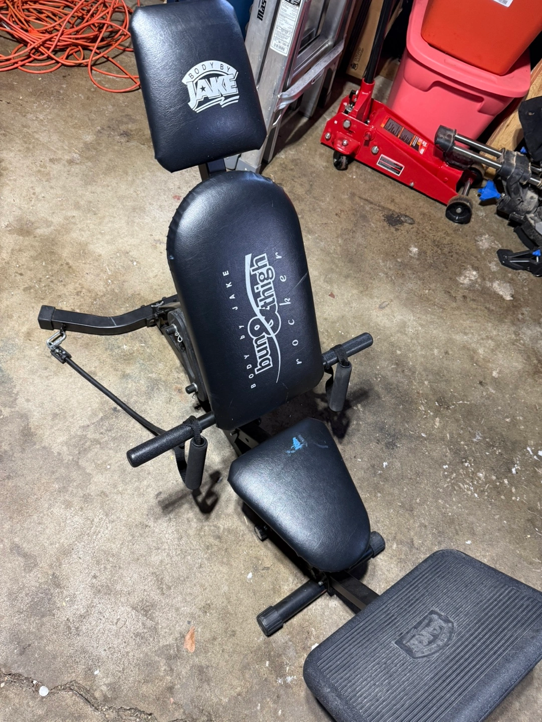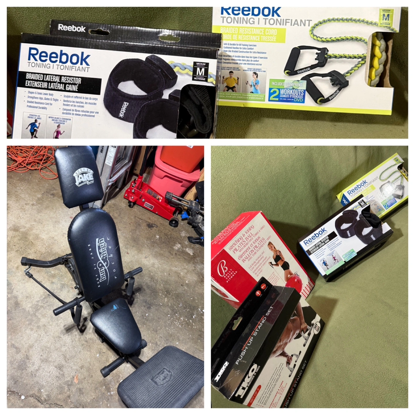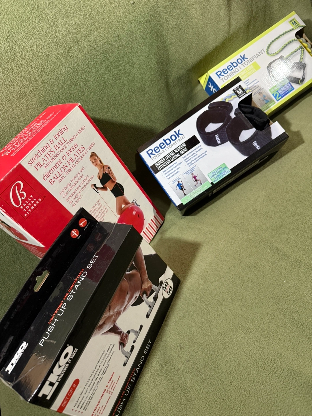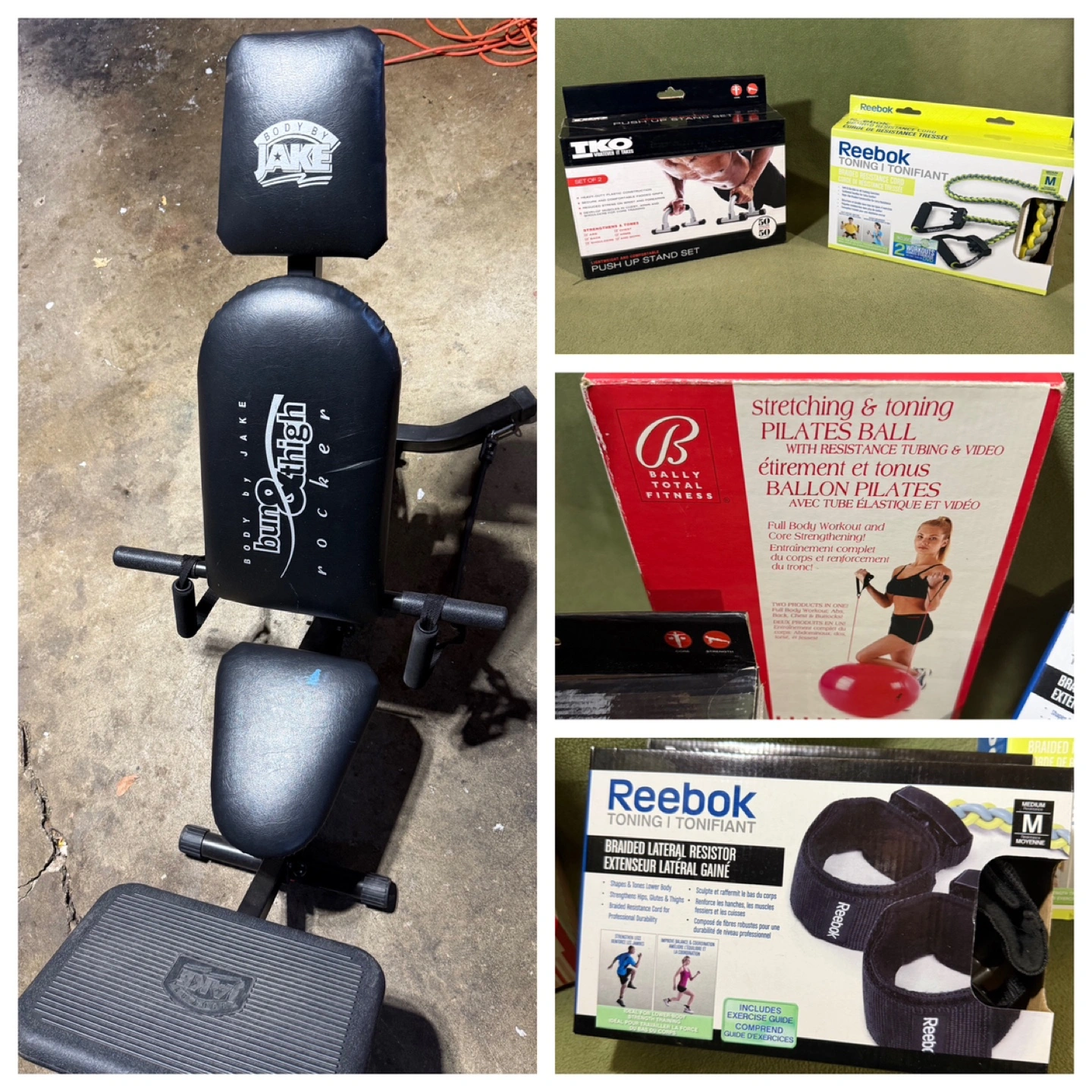 Some brand new in the box Strength & Tonning Exercises Gear Reebok Pilates TKO Great little home package To keep you moving and in shape from day to day BODY BY JAKE BUN & THIGH ROCKER W/ RESISTANCE BANDS SUPER NICE GEAR To add to your home gym Shows wear on it but still functions as it should get a great workout today Asking $150.00 Package deal All the new in box toning gear along with the bun & thigh exercise machine Bun & thigh machine folds up for storage needs Message to set up Viewing or pick up West end location Mayfield Area