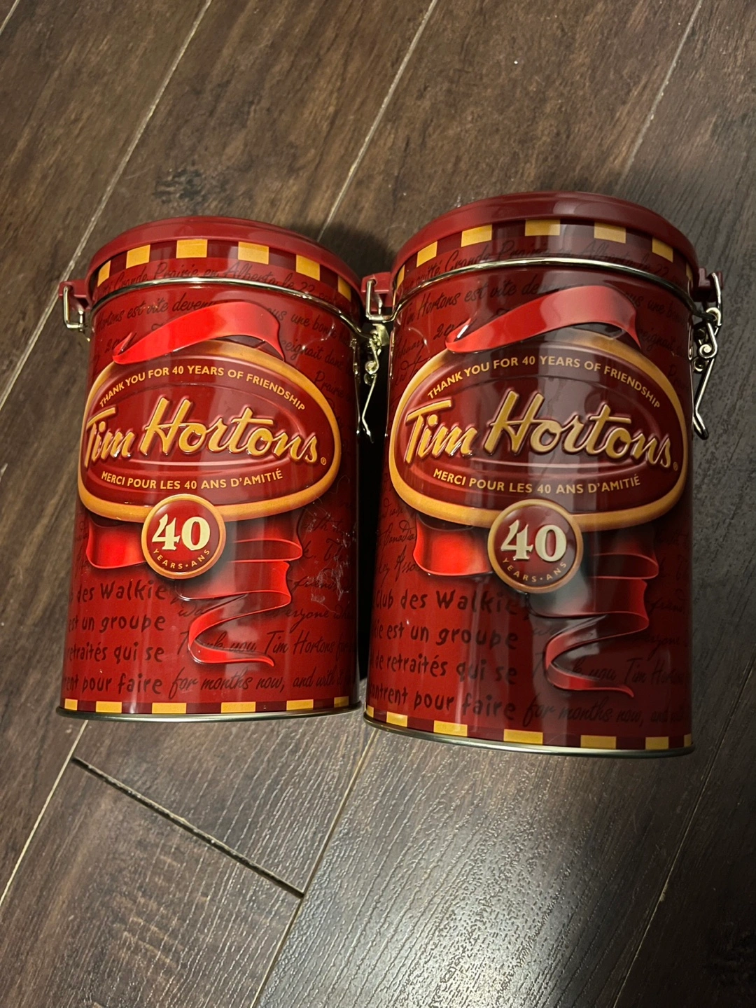 Two vintage Tim Hortons 40th anniversary limited edition tins from 2004.