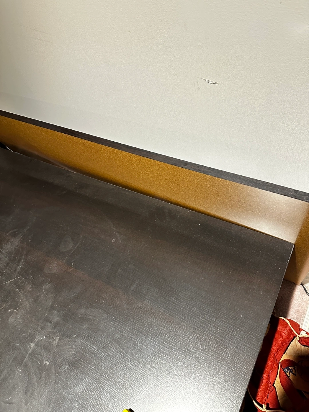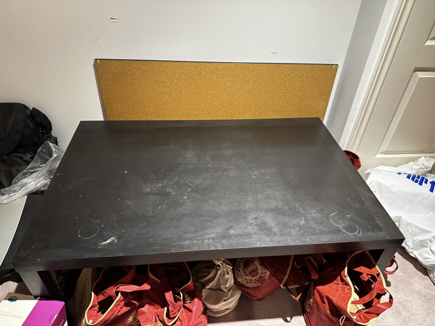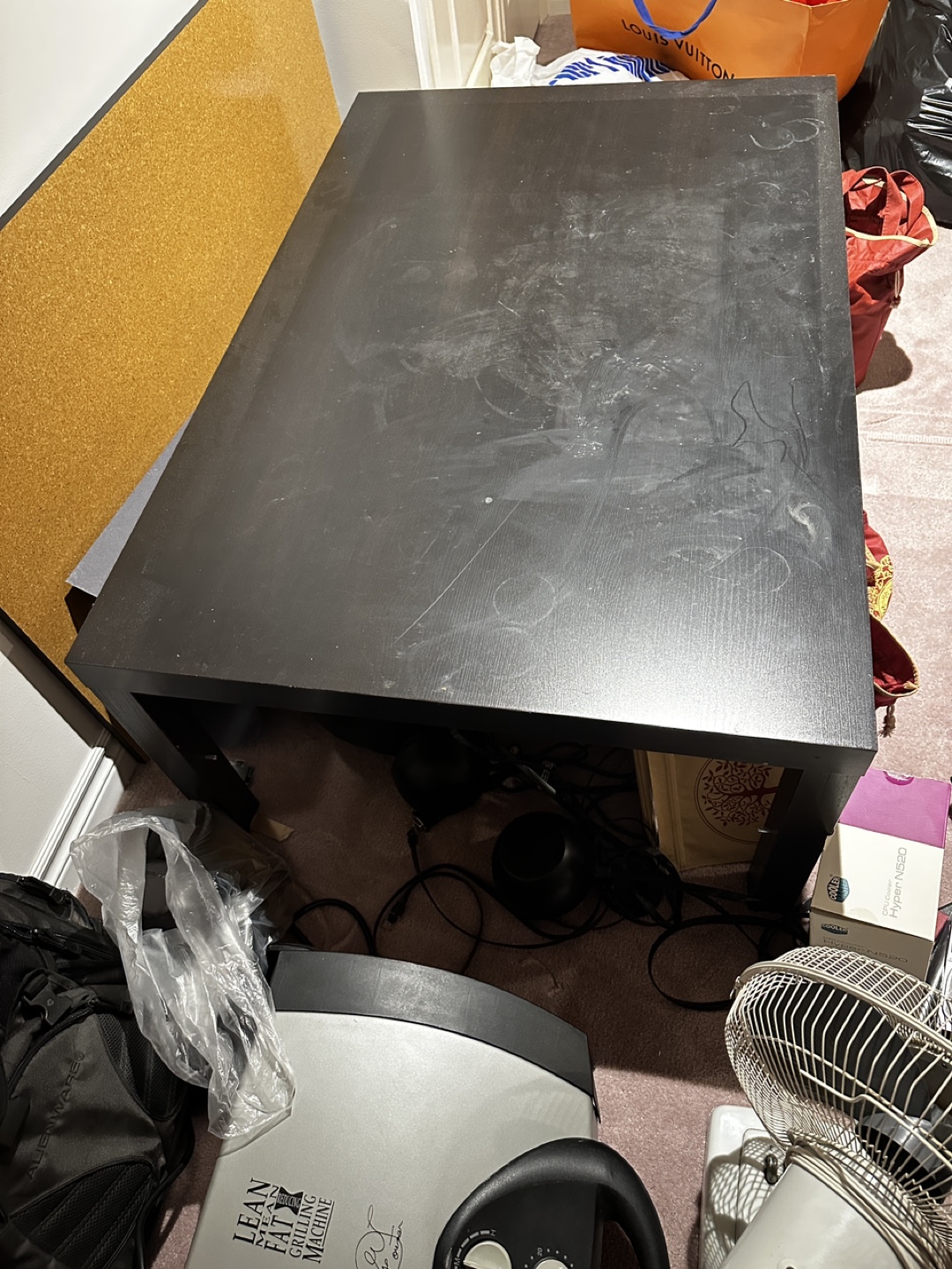 Simple black coffee table. Features open storage underneath. Shows some minor wear.
