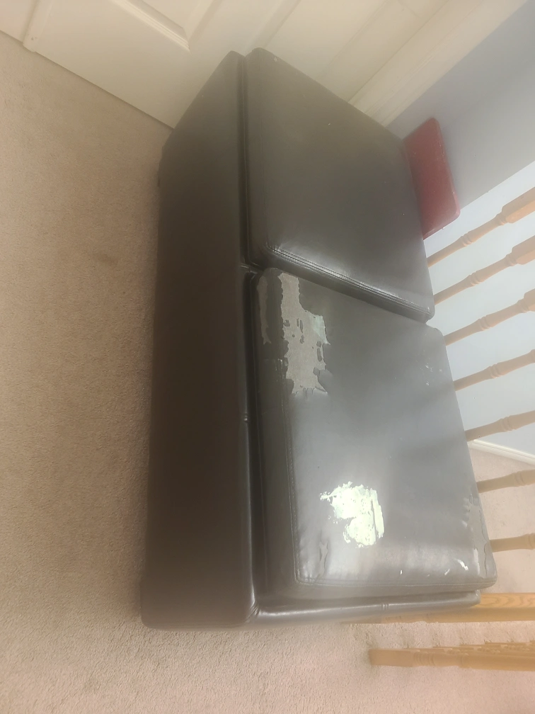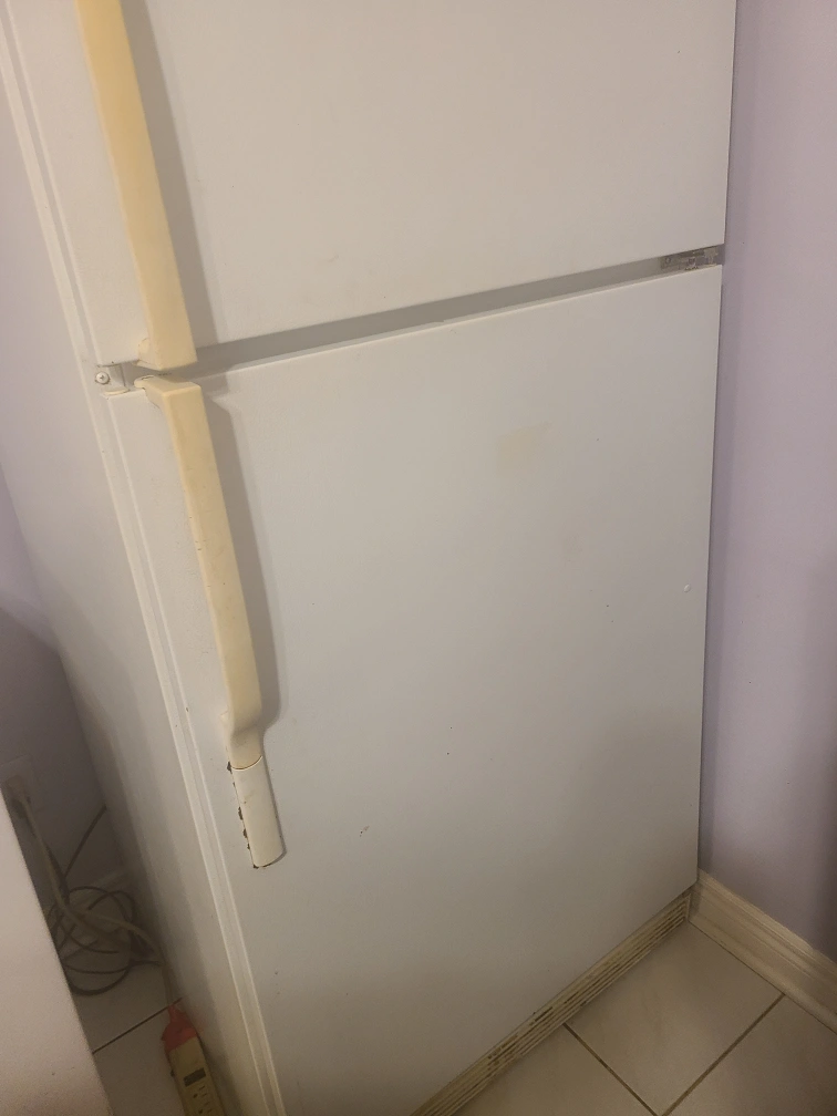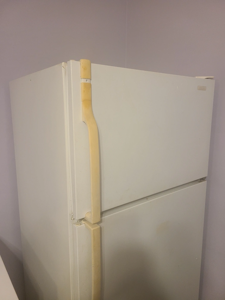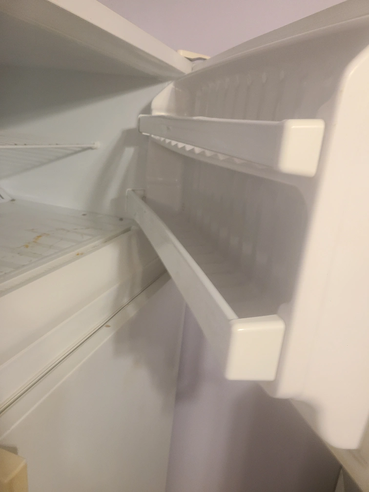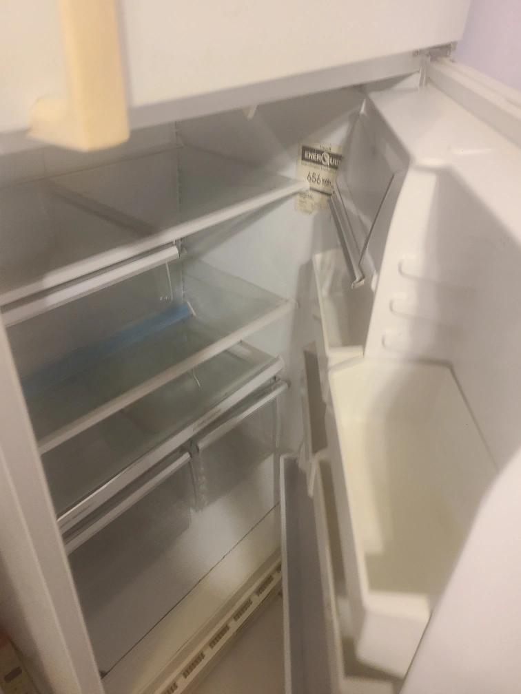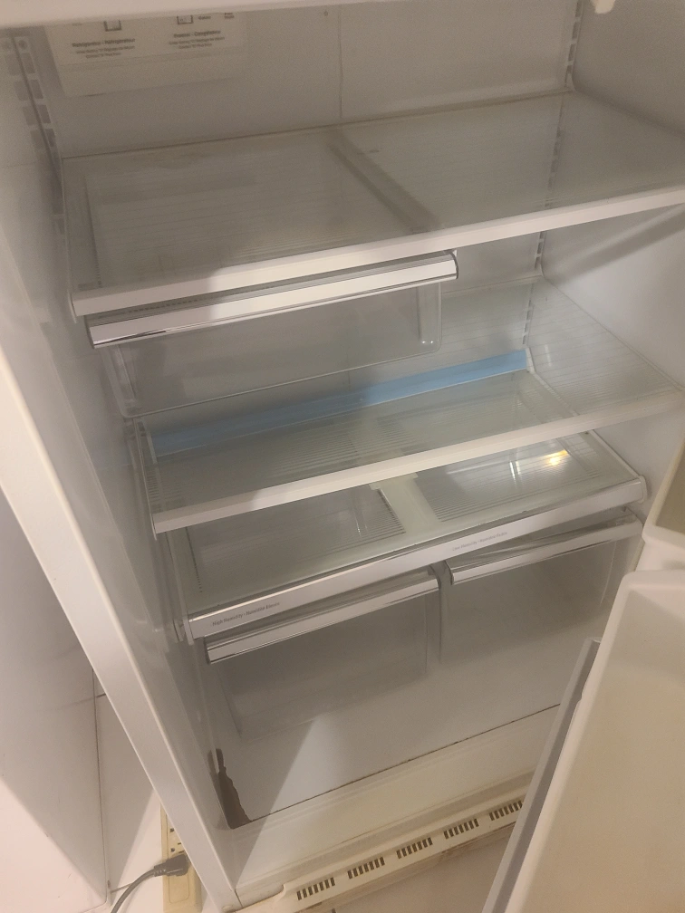 Used white top-freezer refrigerator. Features adjustable glass shelves and crisper drawers. Some minor cosmetic wear. Sold as-is.