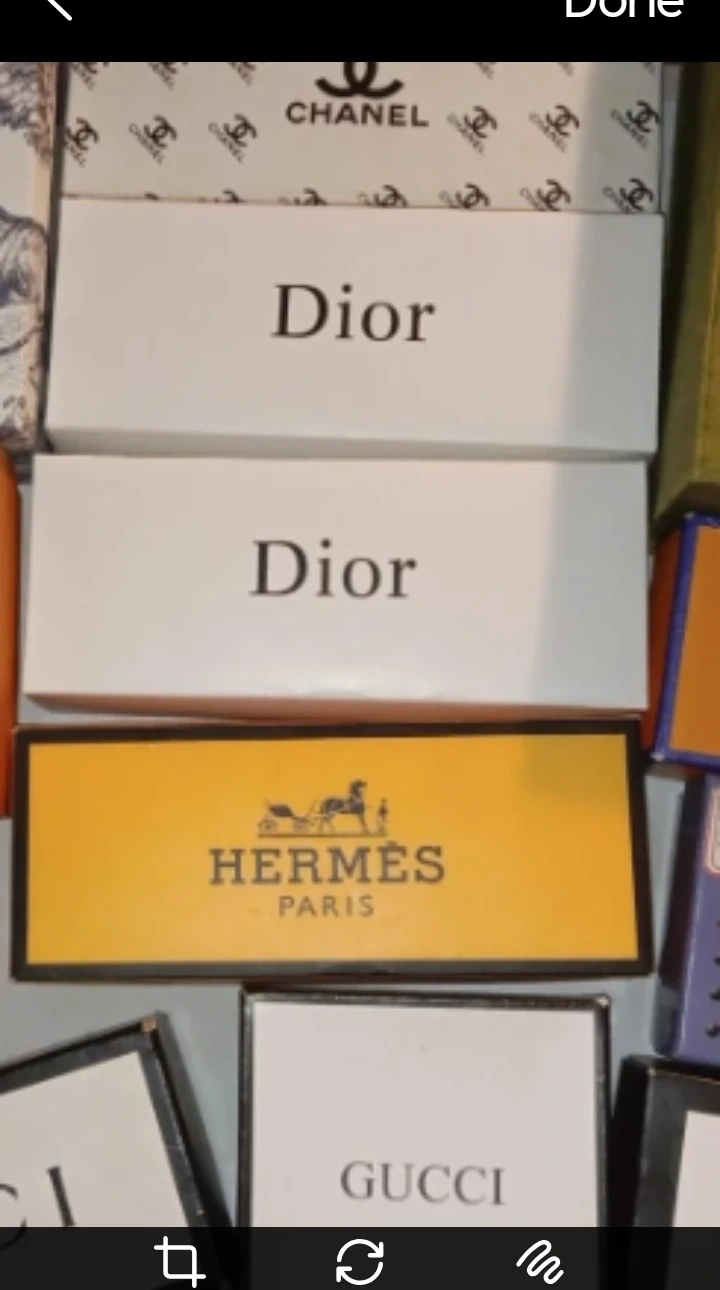 Collection of 6 empty luxury brand boxes. Dior Gucci, Louis Vuitton, Chanel, and Hermes. for storage or display.