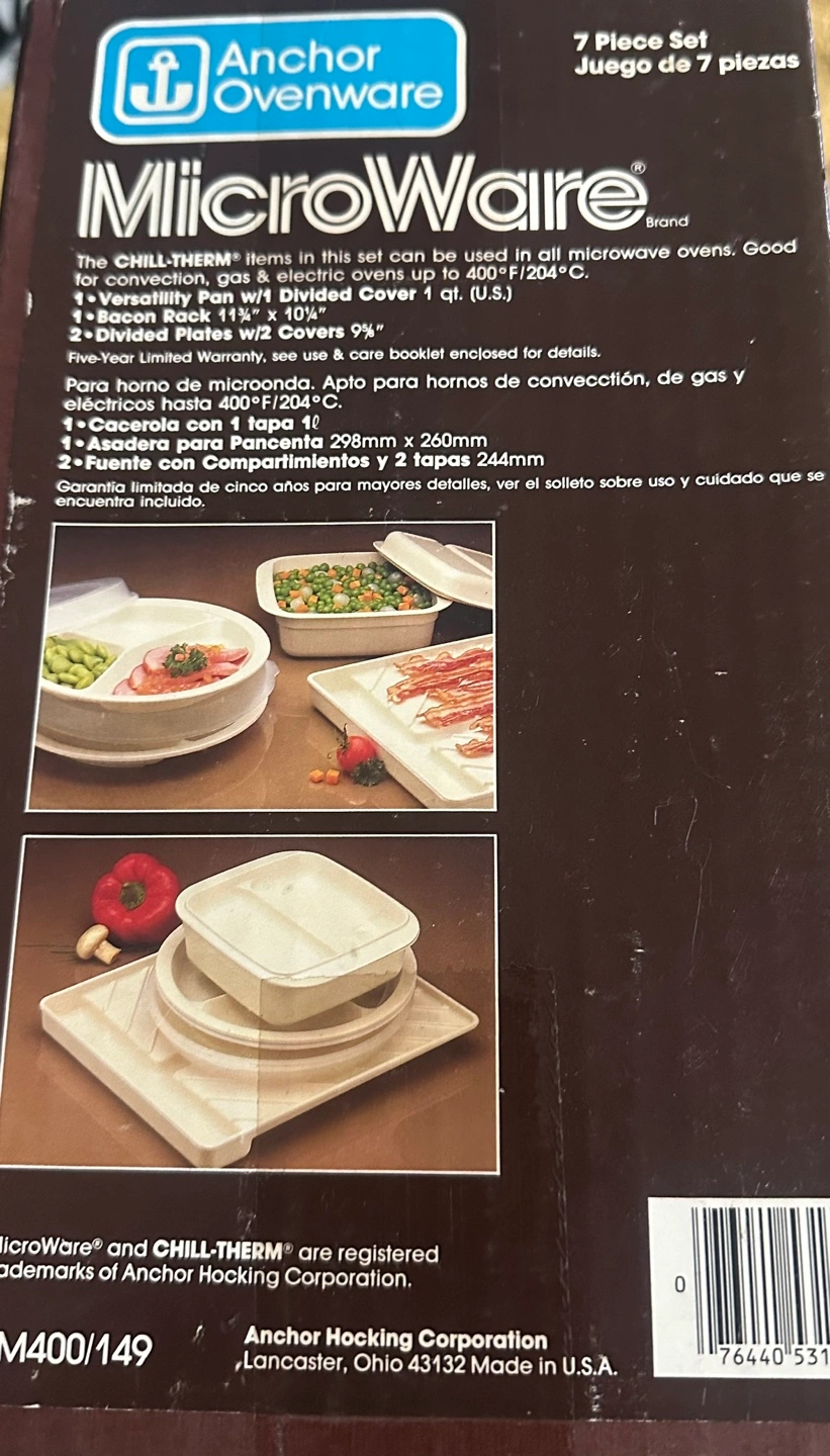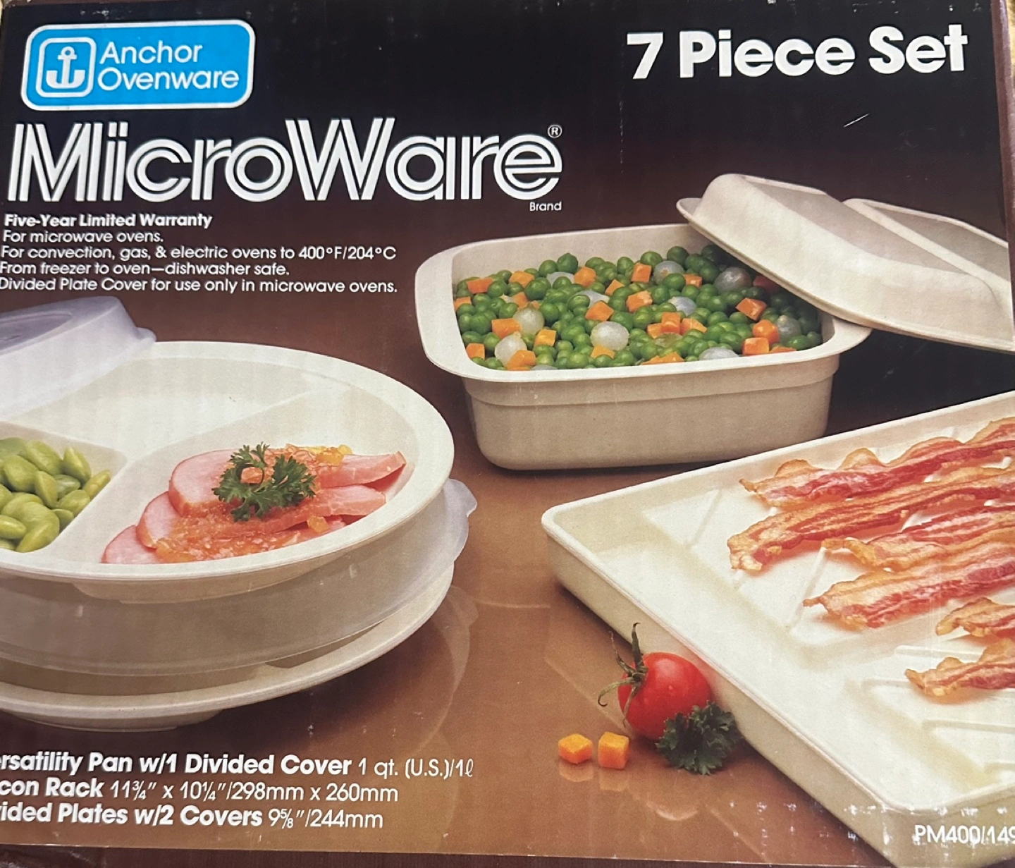 7-piece microwave cookware set. Includes versatility pan with divided cover, bacon rack, and two divided plates with covers. Oven safe to 400°F/204°C. Freezer and dishwasher safe. Five-year limited warranty.