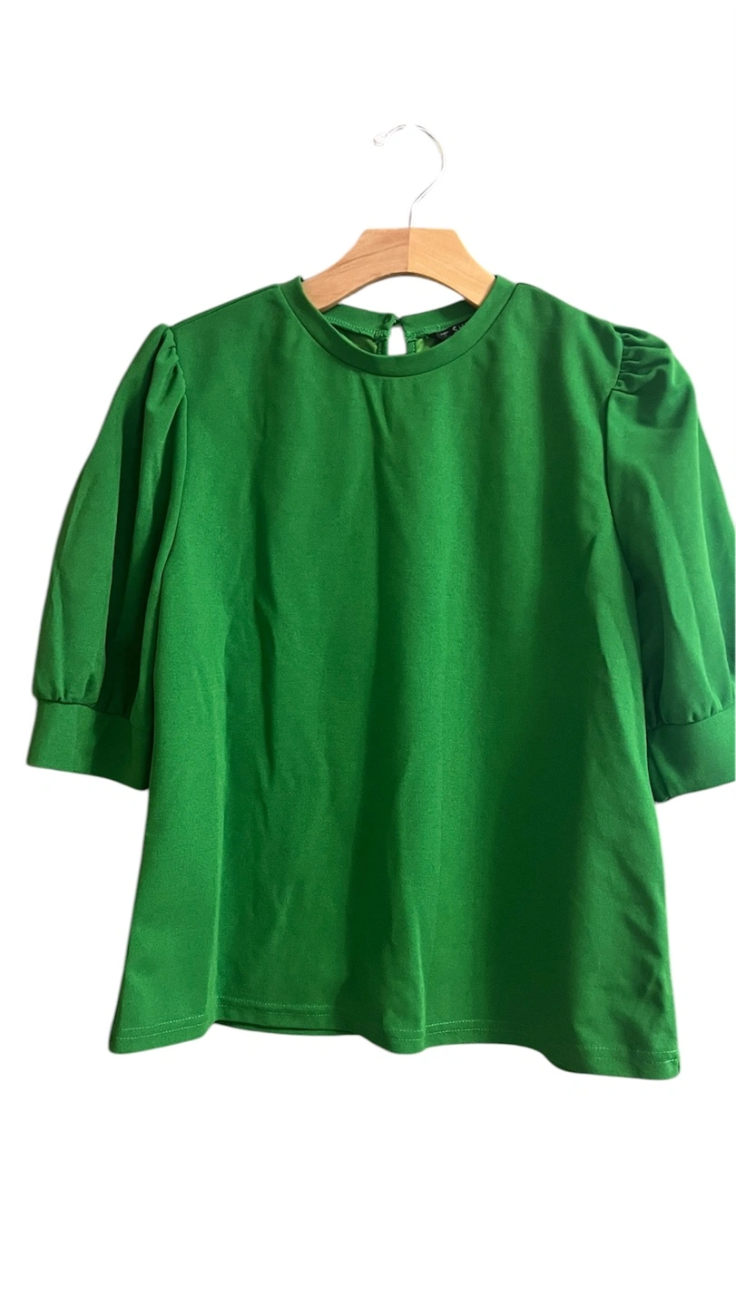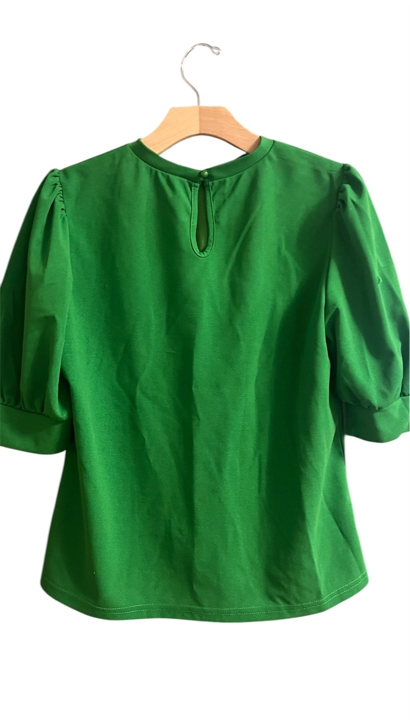 Women's green blouse. Puff sleeves. Short sleeves. Keyhole back detail. Relaxed fit.