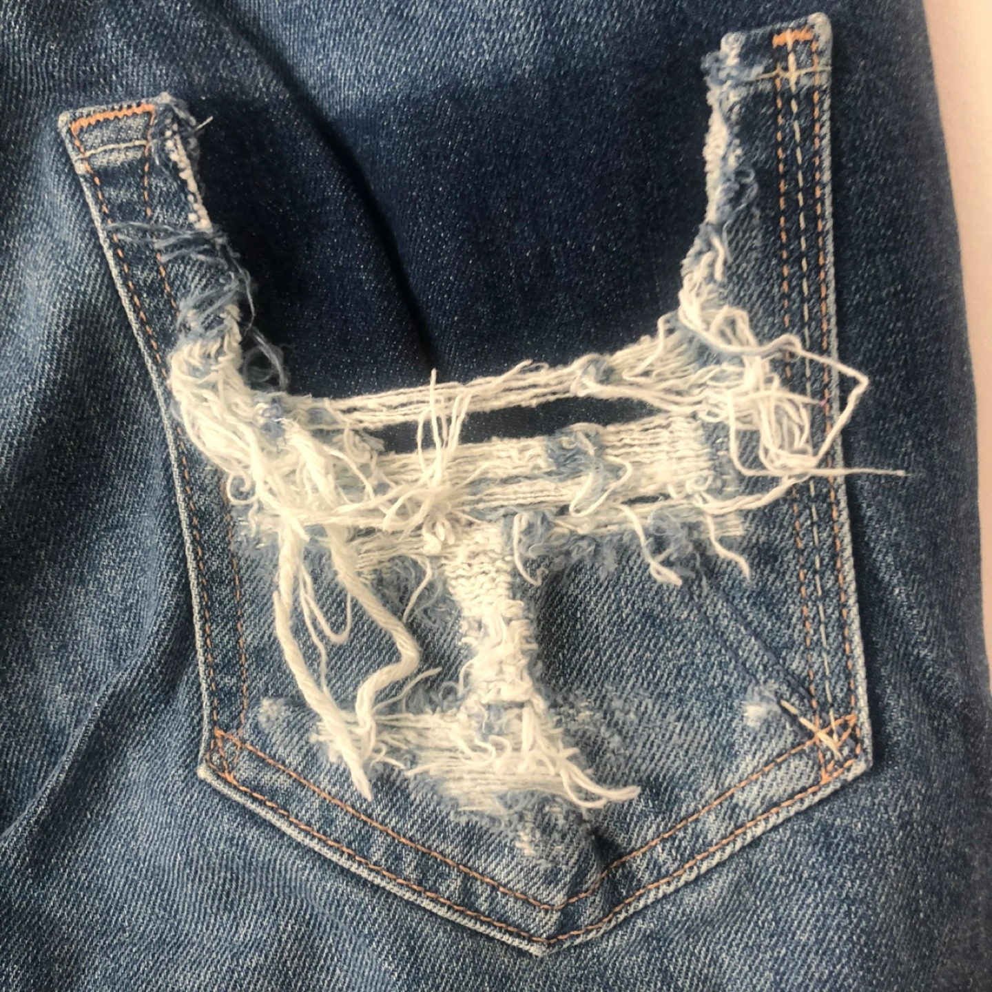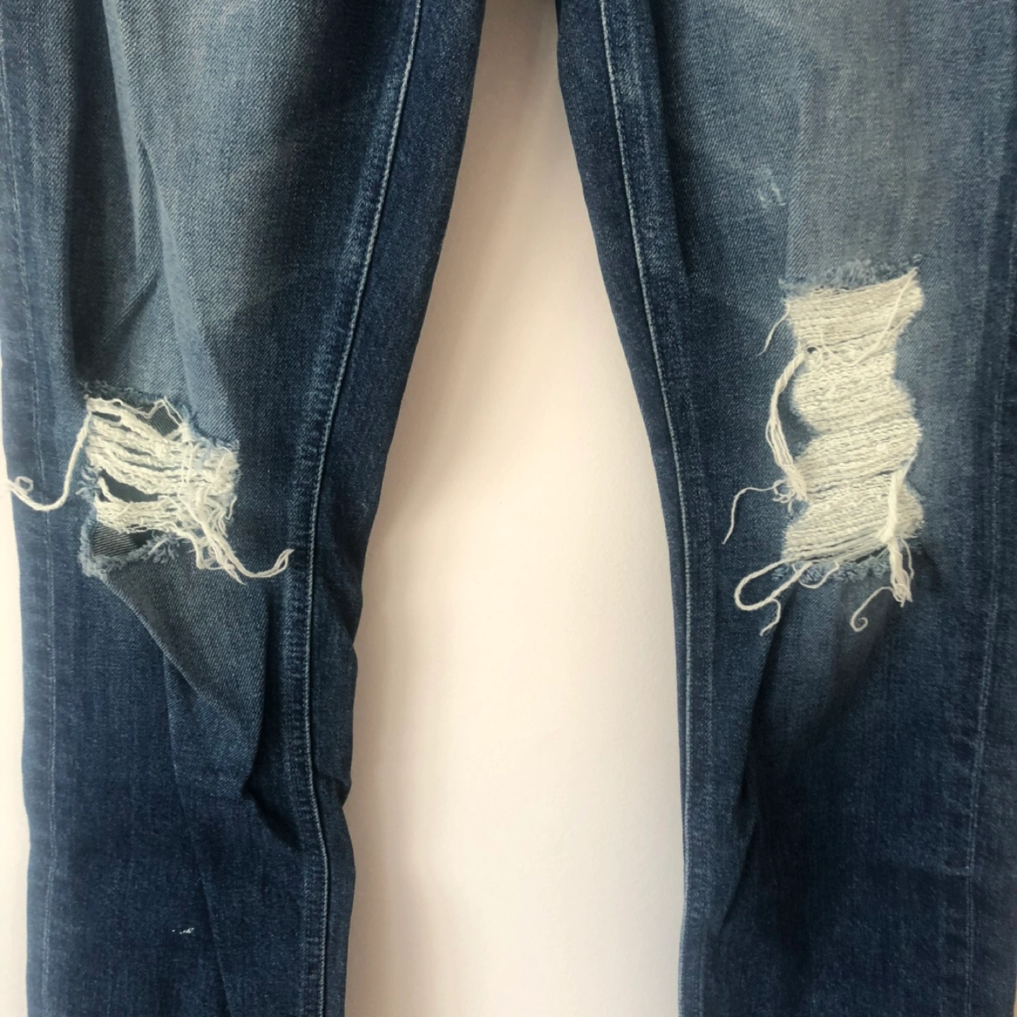 High-waisted distressed denim jeans. Stepped waist. Multiple rips and tears throughout. Cropped length. Medium wash. Size 27